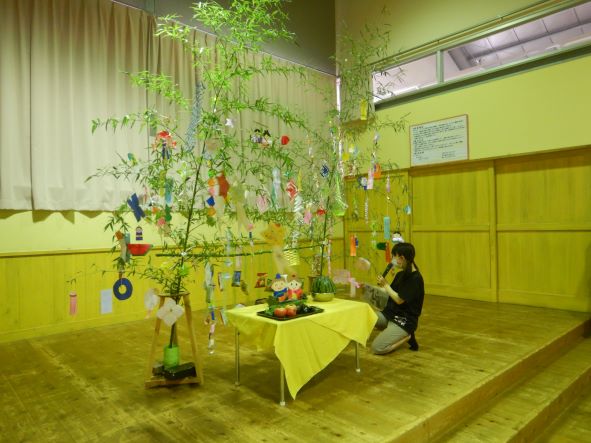 前日から地域講師の福島達さんに笹を用意していただき、子どもたちがお家の方と一緒に作った飾りをつけました。