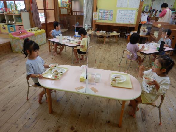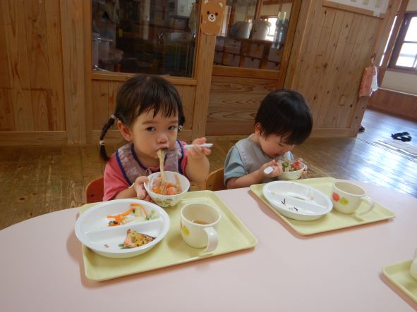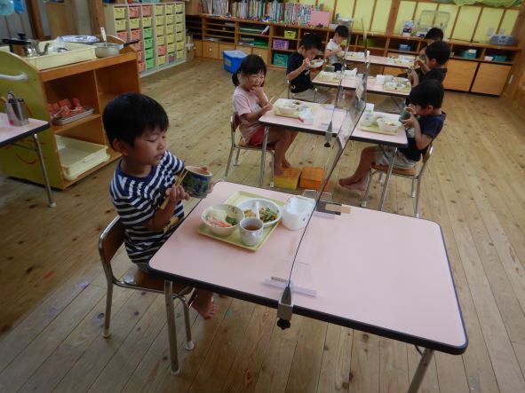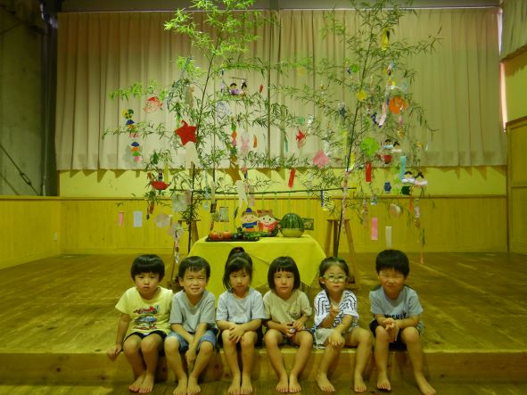 七夕会では、パネルシアターでたなばたについてのお話を見たり、8月7日の夜に雨が降らないで織姫様と彦星様が無事に会うことができるようにという気持ちを込めて「たなばたさま」の歌を元気よく歌いました。そして、子どもたちの短冊に書かれた願い事を紹介して1人1人の願いが届きますようにとお願いをしました。給食は星形に切った人参、オクラの入ったそうめんでした。年長児は達さんに教わりながら自分たちで作った竹の器を使って食べたのでおいしさも増したようです。