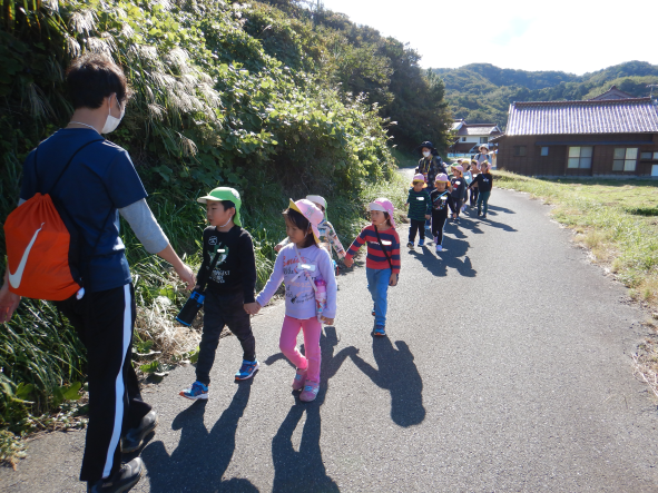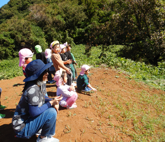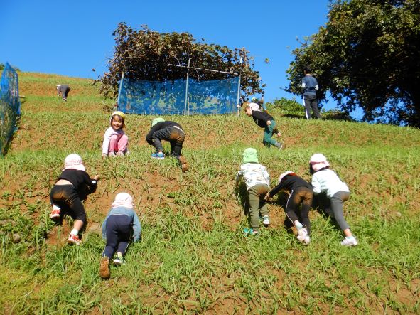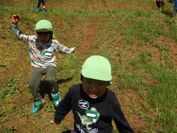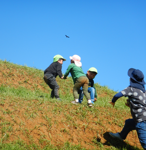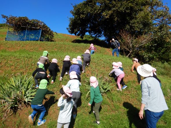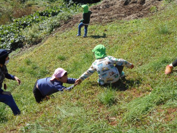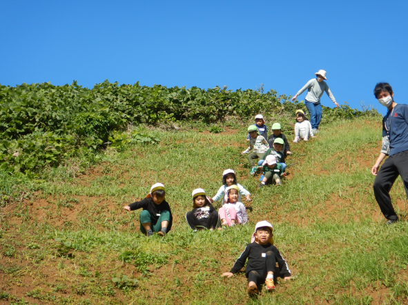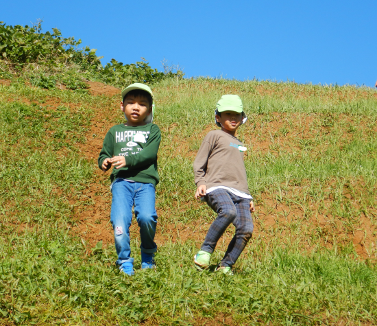 気持ちの良い快晴の下、マリン保育所のくじら組の子どもたちと一緒に、コロコロ斜面に行きました。昨日の雨で少々土が粘土のようになっていて、少し往復しただけで、あっという間に泥だらけに・・・。靴の裏を見て「うわぁ、いっぱいついてる・・・」「くつがおもたくなったー」と言っていました。それでも子どもたちは、足や手に力を込めて登ったり、お尻をつけて滑り降りたりして楽しんでいました。遊びを楽しんでいくうちに、斜面を駆け下りてみたり、「たすけにいくね!」「てにつかまって!」と友達を助けたり、逆に助けてもらったりする姿が見られました。しっかりと体を動かして遊んだので、保育所に帰った後「はやくきゅうしょくたべたいー」「おなかへったなぁ」とつぶやく子どもたちでした。