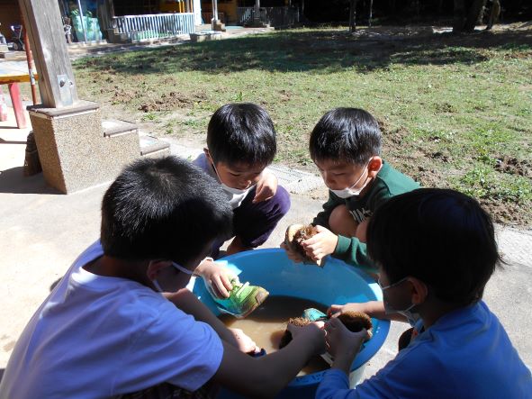 「よいしょ!」「ありがとう」 マリン保育所の友達とも助け合う姿が見られました。