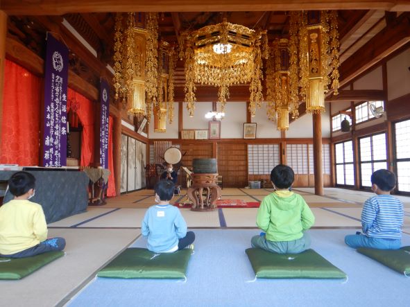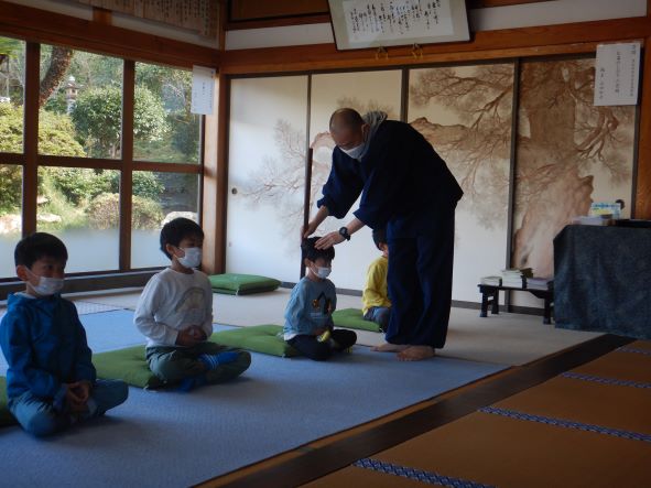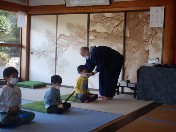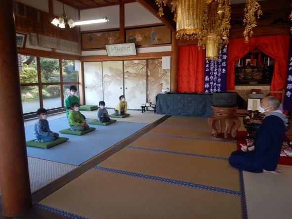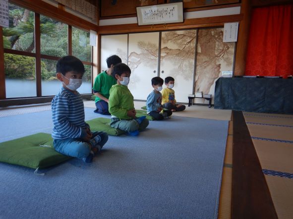 心配していた雨も無事に上がり、にじ組5歳児4名で應海寺へ座禅体験に行きました。「たたかれるかな・・・」「できるかな」と少し心配していた子もいましたが、座禅が始まるとピシっと背筋を伸ばし、真剣な表情で臨んでいました。