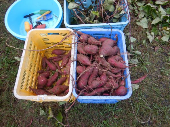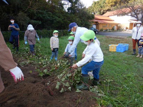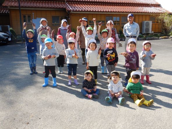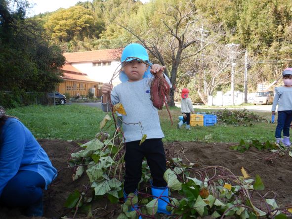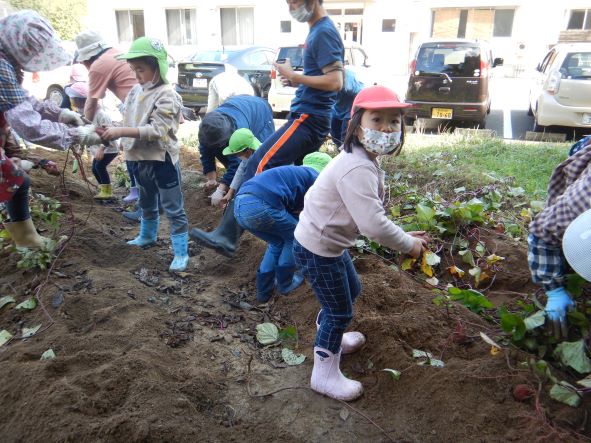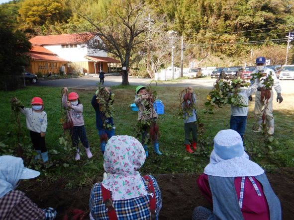雨のため2回延期になりましたが、心配していたお天気も晴れ。絶好の芋掘り日和りになりました。地域の方達にお手伝いをしてもらって沢山掘ることができました。おいもは焼き芋や給食などで使いたいと思います。