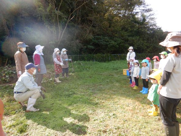 おいもほりのお話を聞いています。