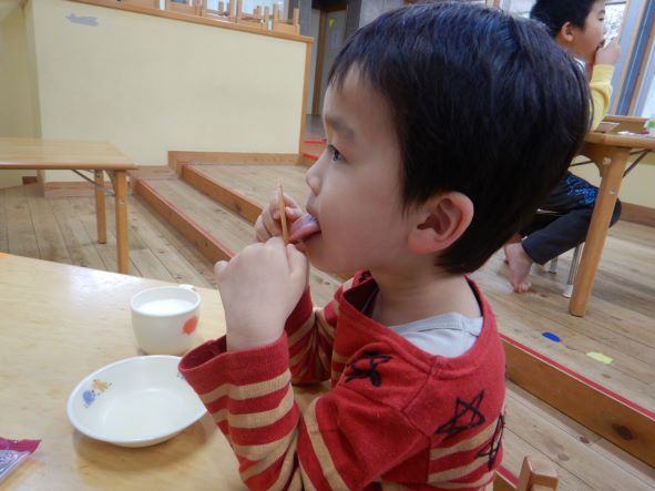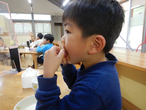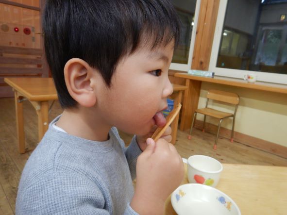 先日、給食だよりでも記載した「舌の体操」をおやつの時間に実施しました。