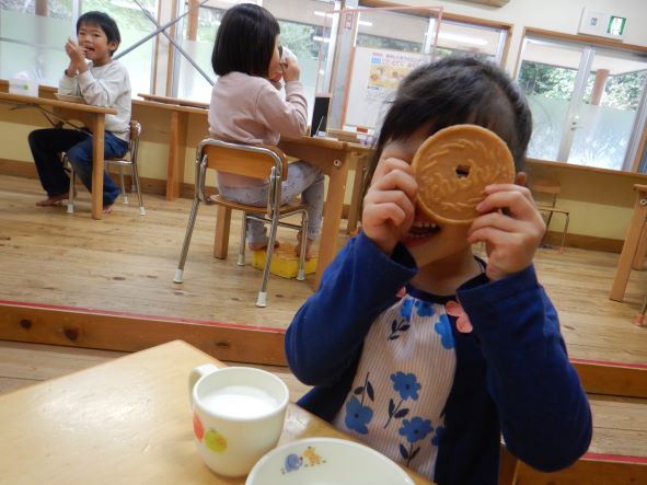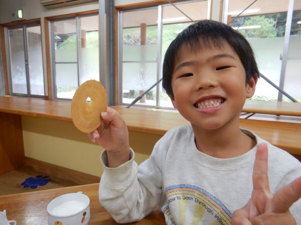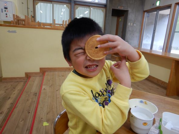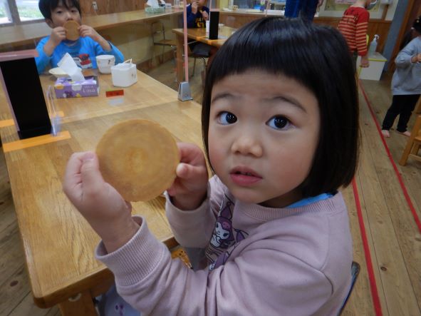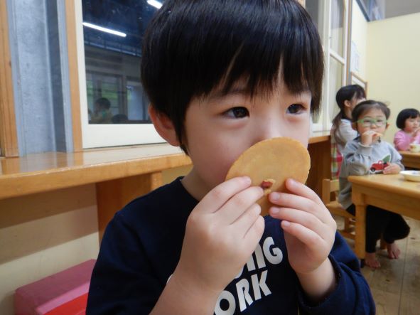 「舌の体操」は、舌の筋肉を動かすことにより鍛えられ、発音、歯並び、虫歯予防、呼吸法、免疫力を高めるなど、体全体に効果が得られるとされています。その一つとして、薄いせんべいを使って舌を動かしながら、せんべいの真ん中に穴を空ける・・・という体操を子どもたちと楽しくしました。