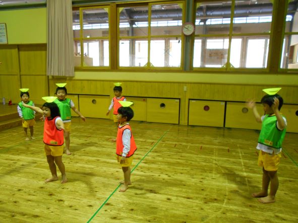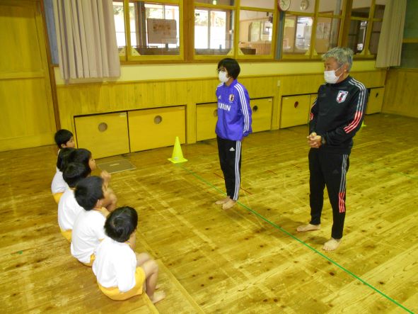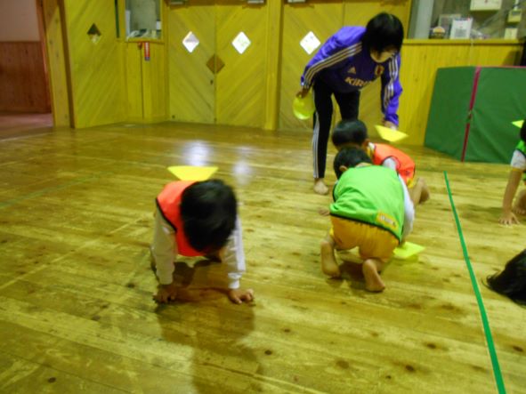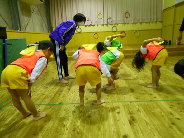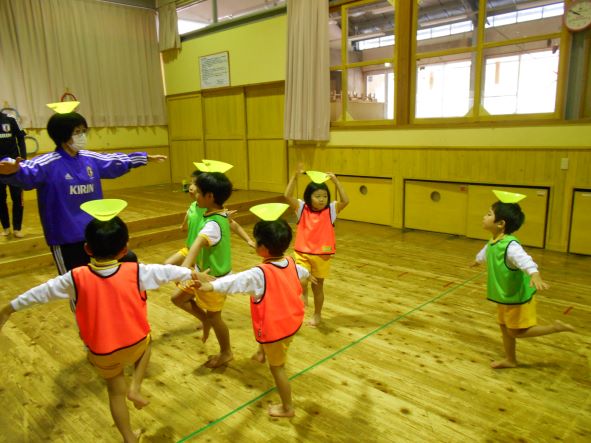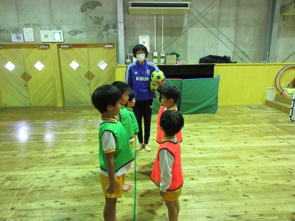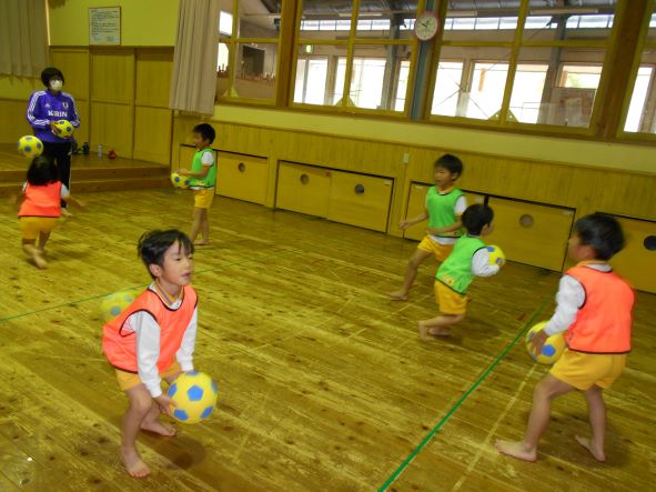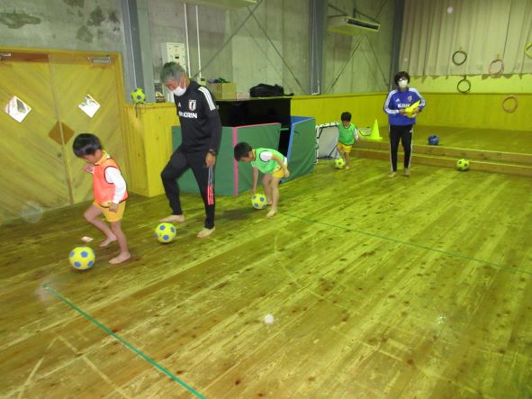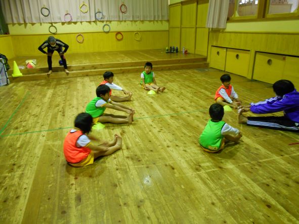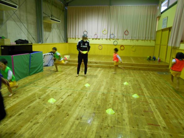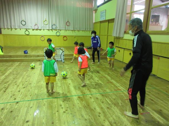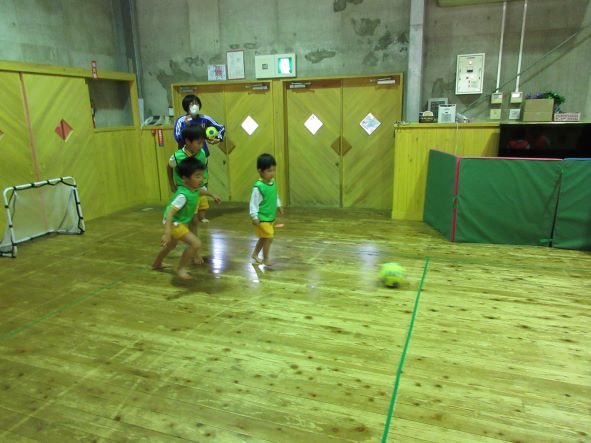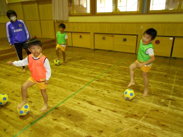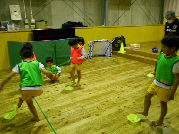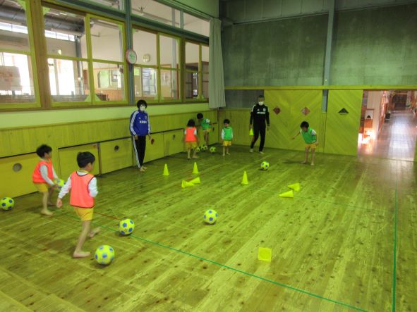 にじ組がサッカー教室に参加しました。コロコロドッヂやしっぽ取りをして体を動かした後、マーカーコーンを使ってバランス力や体幹を鍛えました。体の様々な部位にコーンを乗せ落ちないように姿勢を維持したり、余裕のある子は歩いたり四つん這いになったりする姿が見られました。休憩をはさんだ後は、いよいよボールを使った運動をしました。頭上に投げてキャッチしたり足先で転がしたりしてボールに慣れた後、線から線に転がしながら歩いたり、コーンを的にして蹴って倒したりしました。最後には2チームに分かれて3対3,大人対子どもで試合をし、気持ちの良い汗をかきました。