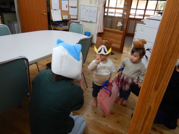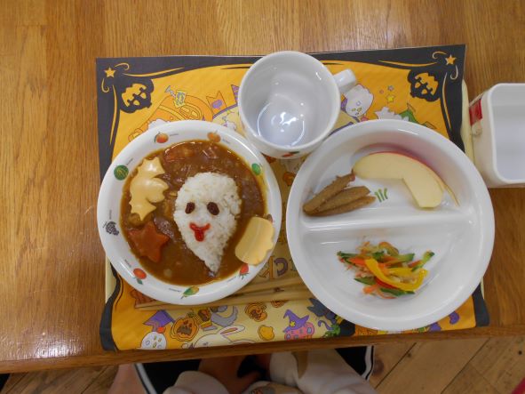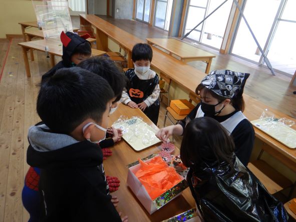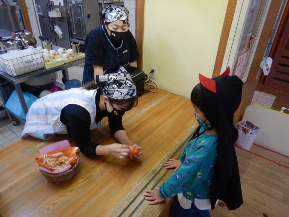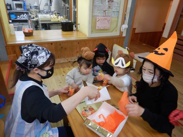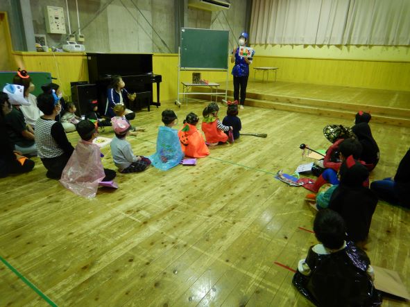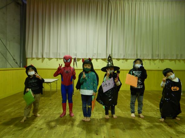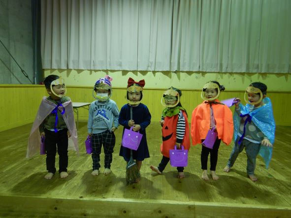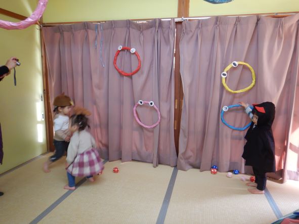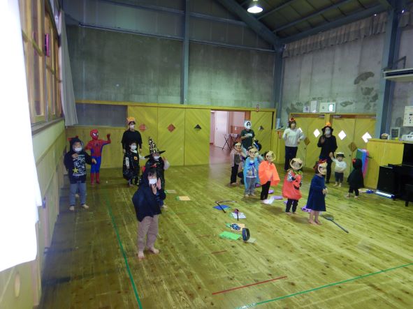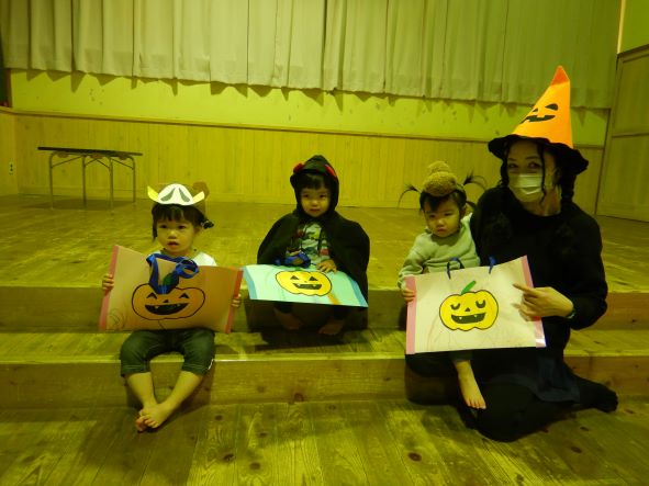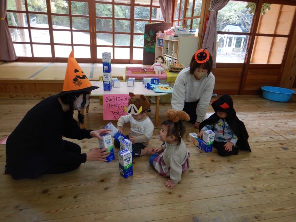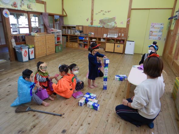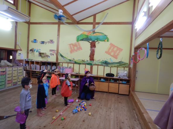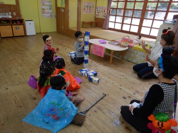 ハロウィンの由来について話を聞いた後、各クラスに分かれて①ボール投げ ②牛乳パック積み ③ポーズゲーム ④お菓子入れ作りの4つのコーナーを回りました。ゲームコーナーでは友達がしている姿をじっくりと見たり「がんばれー」「もうちょっとだよ!」と応援したりし、皆で楽しむことが出来ました。もらったお菓子の入ったカバンの中を嬉しそうにのぞき込む子どもたちの姿がとても可愛かったです!