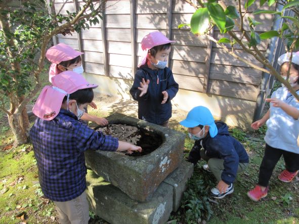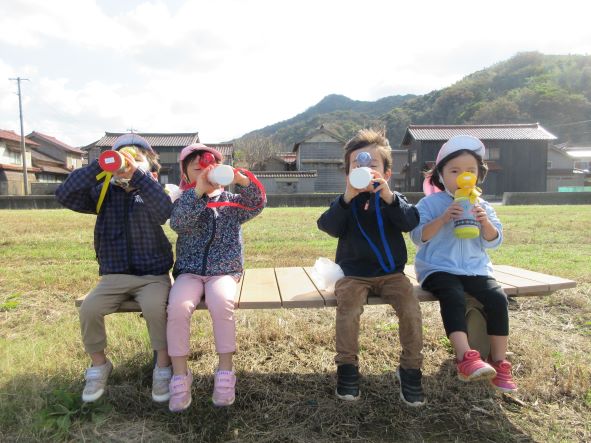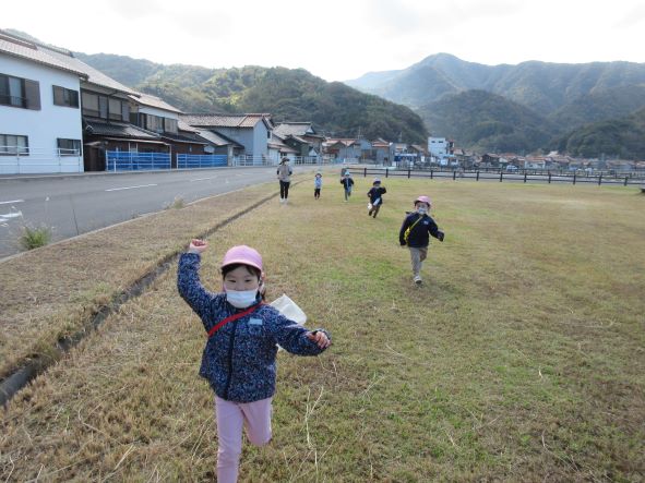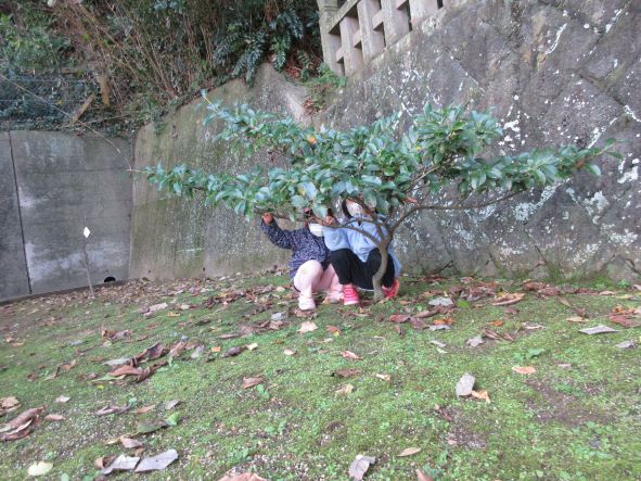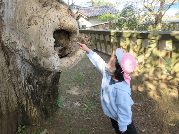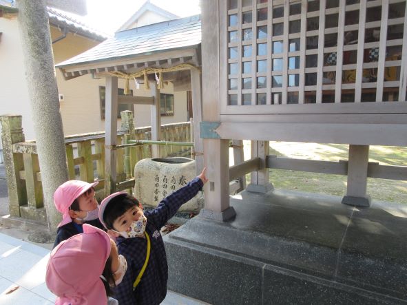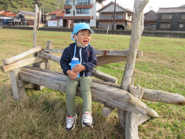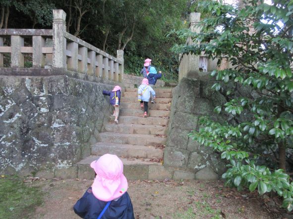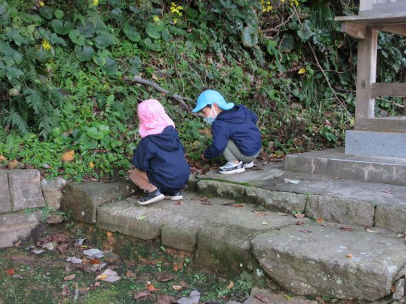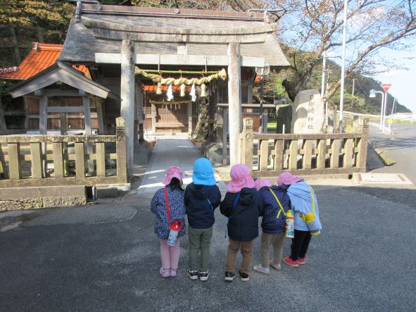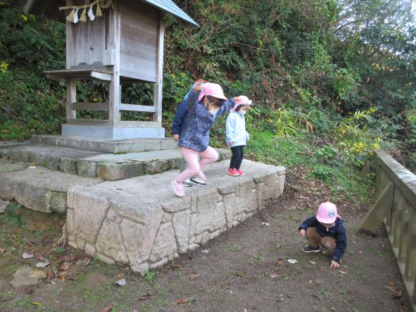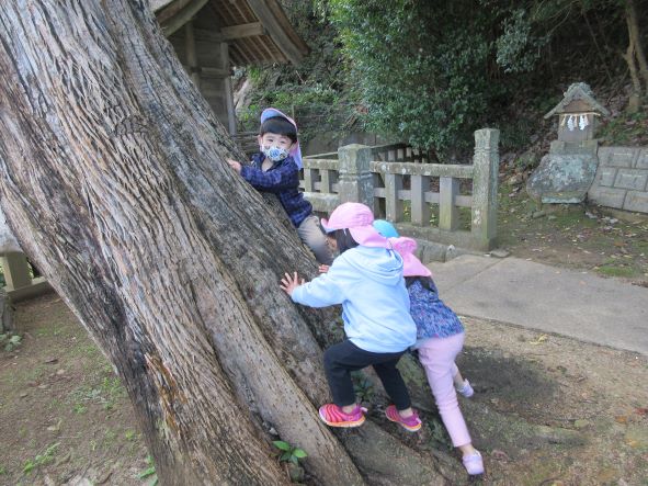 日御碕神社へ出発!道中は先月の『ガッチ祭り』を思い出して、「ガッチがおったがー」「ここ(お尻を突き出して)たたかれたー」と話が盛り上がりました。しかし、神社に近づいてくると「……」無口になったり、足取りが重くなったりする子ども達でした。「ガッチはいないからね」と教えると安心していました。神社では、木の実を探したりジャンプをしたり、かくれんぼをしたりしました。