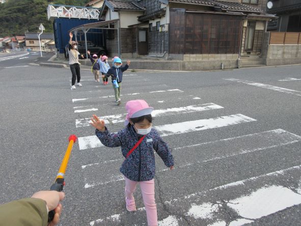 車に気を付けて渡ります「きょろきょろ」