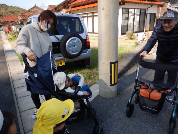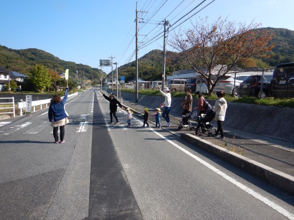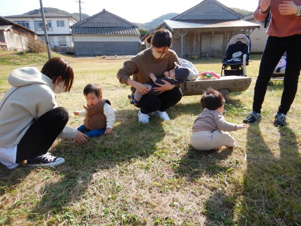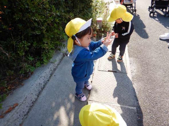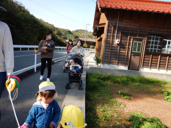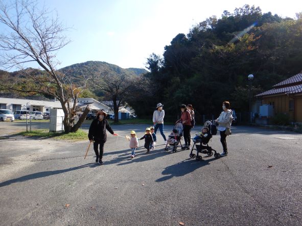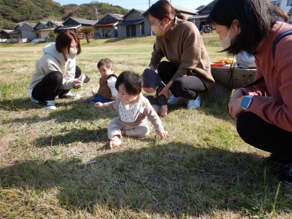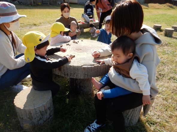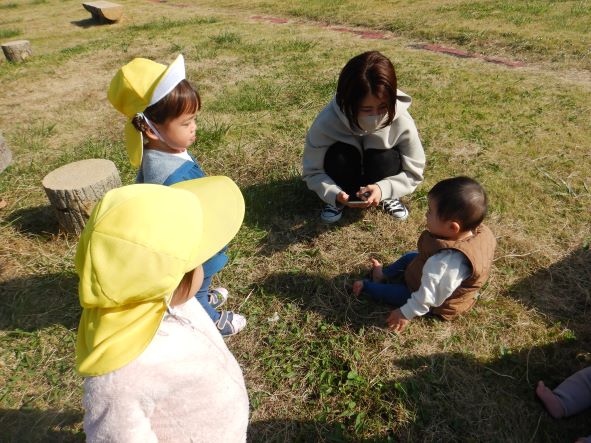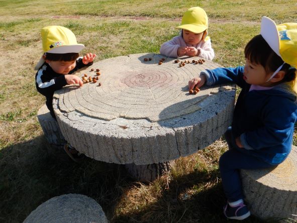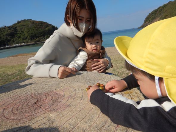 今日は、保育所体験の方が3組来られて、一緒に小波の海まで散歩に行きました。途中にドングリが落ちていたので、ほし組の子が拾って体験のお母さんに、嬉しそうに見せていました。小波の海では、芝生の上に座ってひなたぼっこをしたり、ドングリをテーブル上にひろげて触ってみたりして、ゆったりと過ごしました。