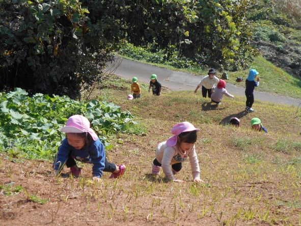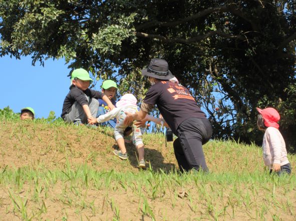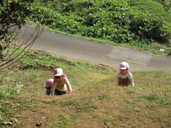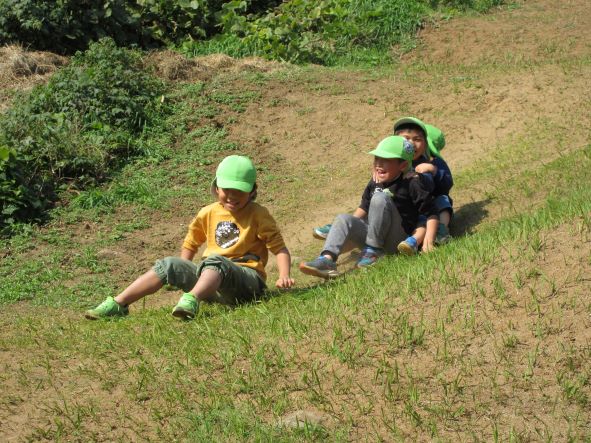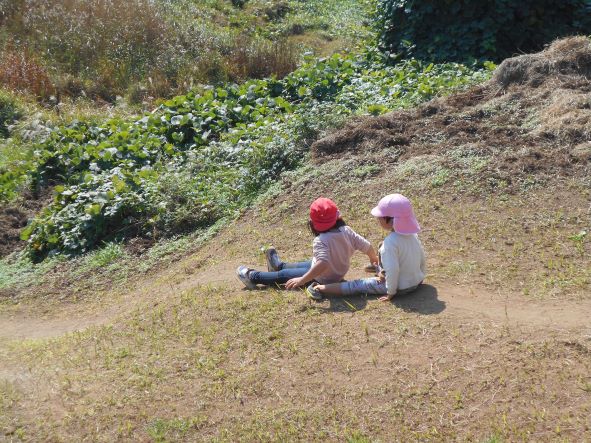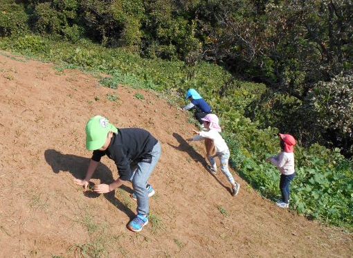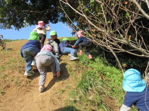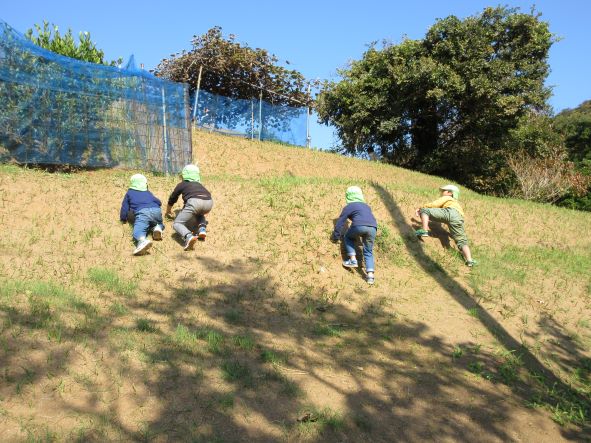 コロコロ斜面では乾燥した地面の為、始めは滑って登れない姿が多く見られました。それでも保育者に支えてもらったり、友達に引っ張ってもらったりしていくうちに、足や手の力の入れ方や踏ん張れる所を見つけるなどコツを掴み、徐々に自分で登れるようになりました。繰り返し登るうちに、助走をつけて駆け上がってみたり、登るルートを変えてみたりするなど、いろんなことに挑戦しながら楽しむ姿が見られました。そして頂上からは天然の滑り台を何度も滑って楽しみ、皆のお尻は砂だらけになりました。たくさん遊んだ証拠です!