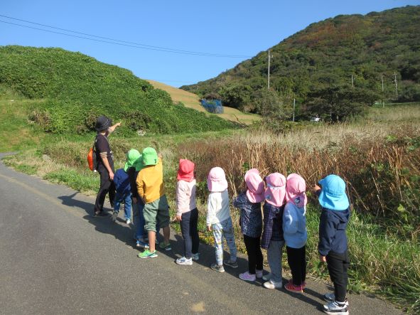 道中は柿の実やガマの穂、紅葉した葉などを見つけながらゆったりと散歩を楽しみました。