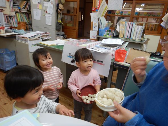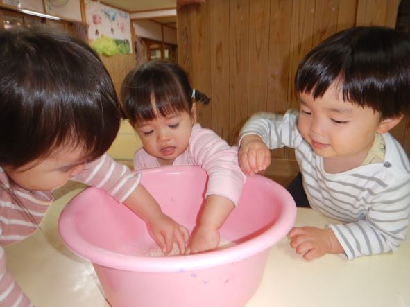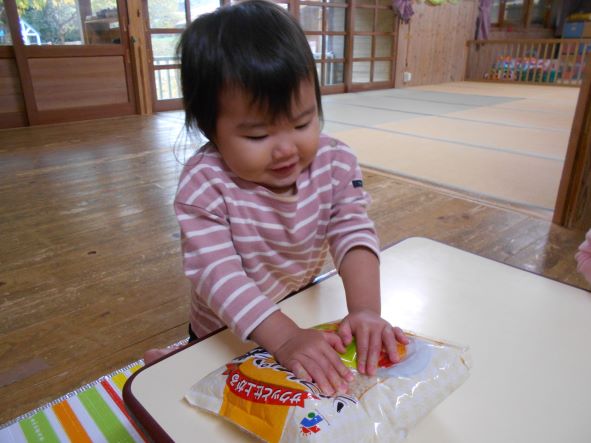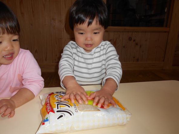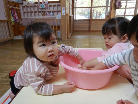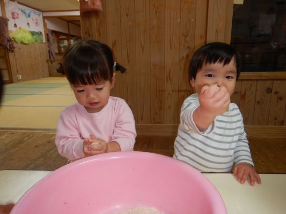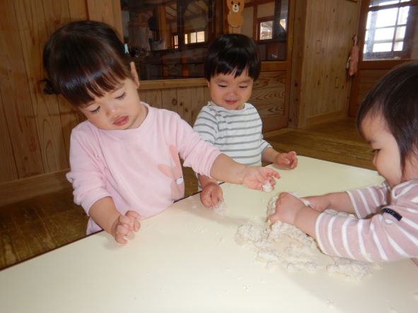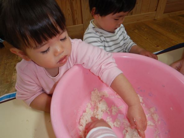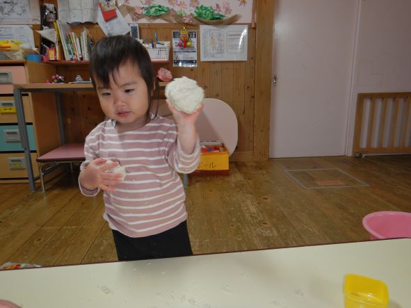 パン粉に水を入れて、粘土にして遊びました。初めはパラパラしていたパン粉が、水を入れて粘土になっていくのを不思議そうに見たり、匂いを嗅いでみたりしました。丸めたり、伸ばしたりしたものをお弁当箱に入れて、ごちそうごっこをしてあそんだあと、所長先生にもごちそうしました。
