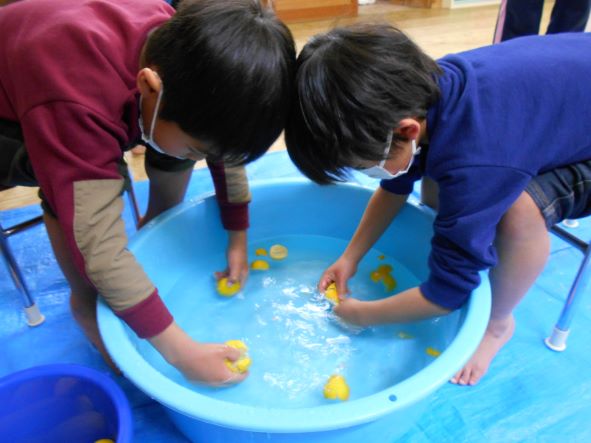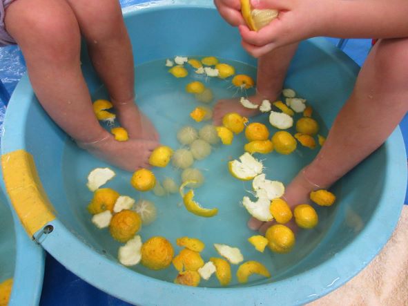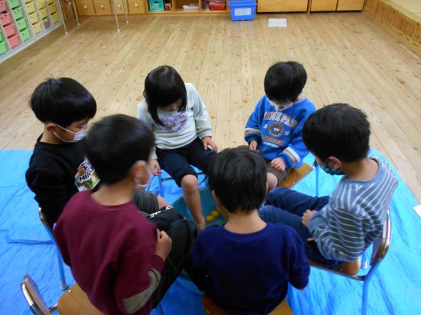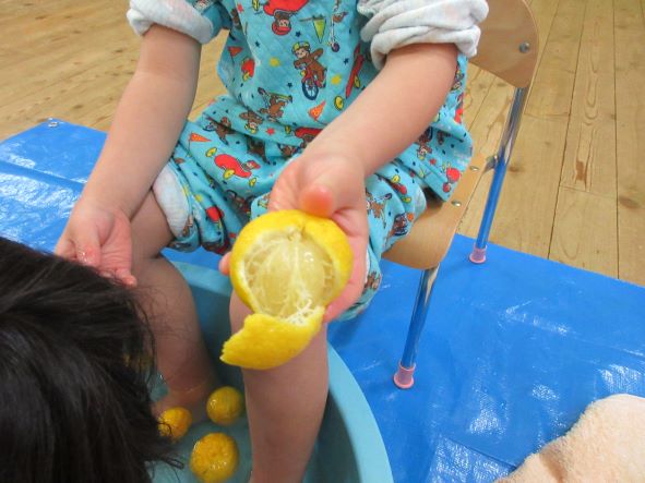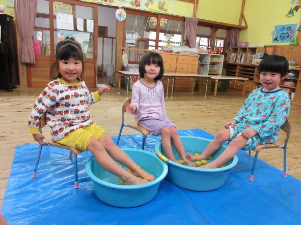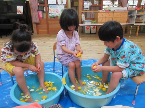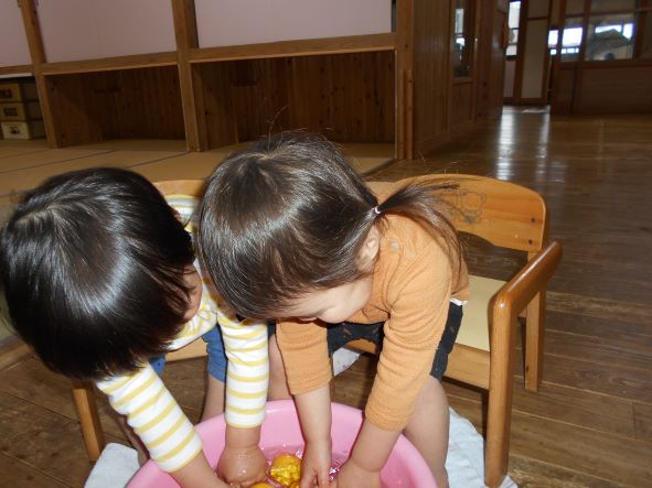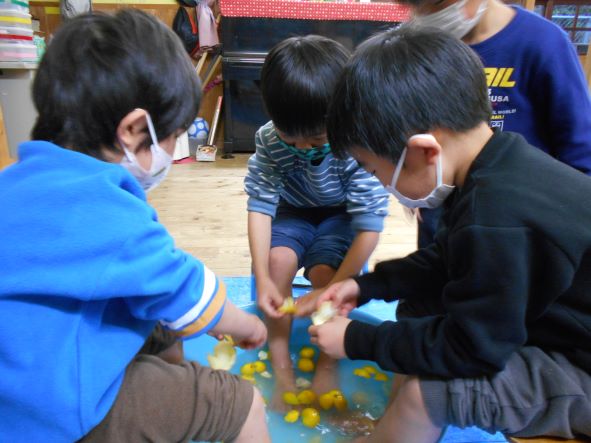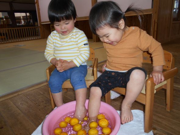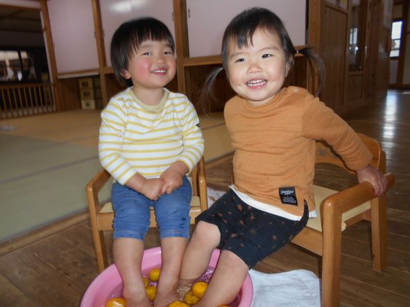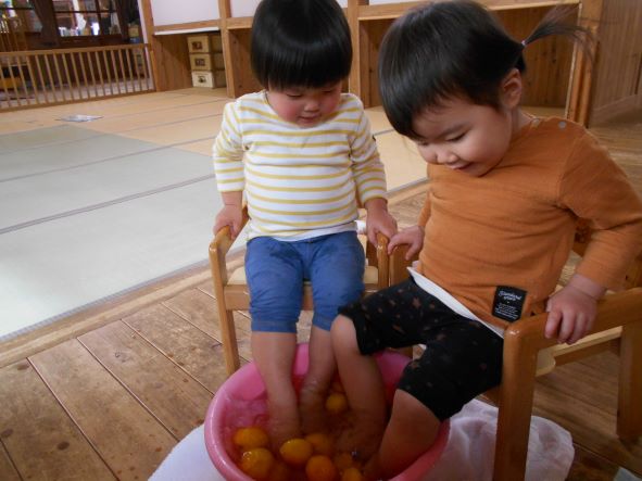 暦の上では今日は『冬至』。地域講師の高井さんから頂いた柚子を使って足湯をしました。「あったかーい」「わ!あしもいいにおいがしてきた!」「ここでごはんたべたーい」と、足湯の心地よさを味わっていました。