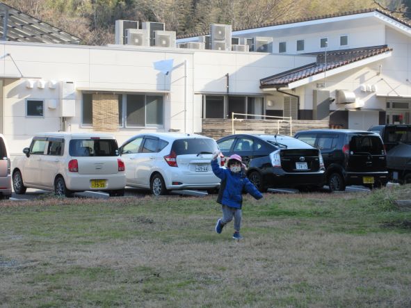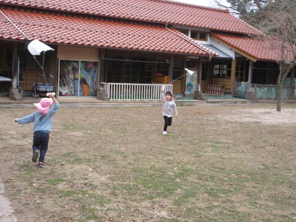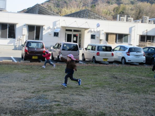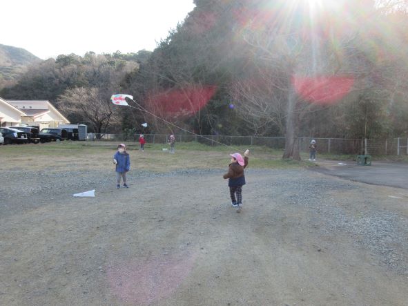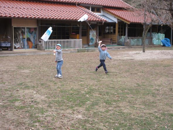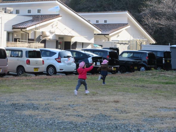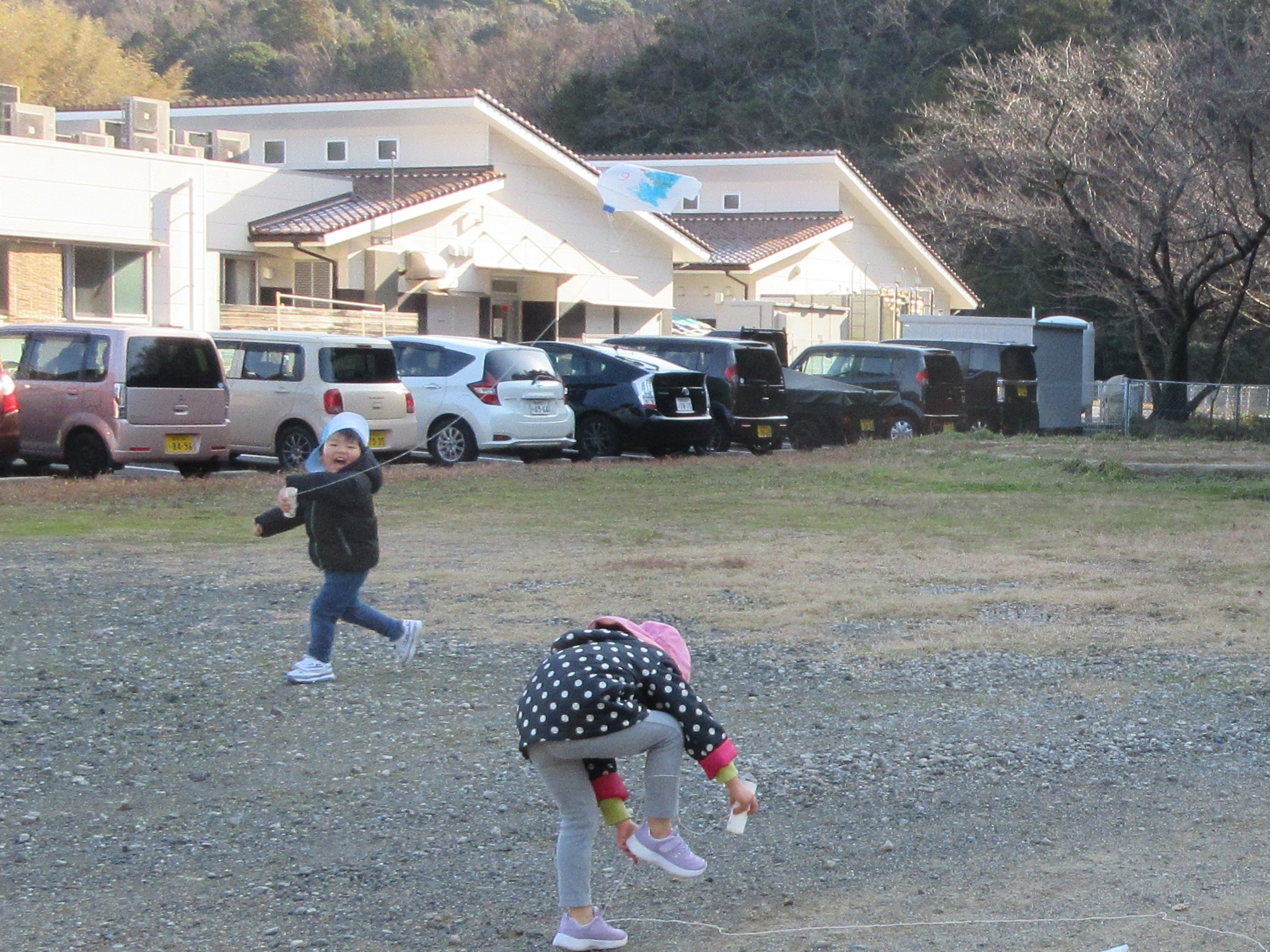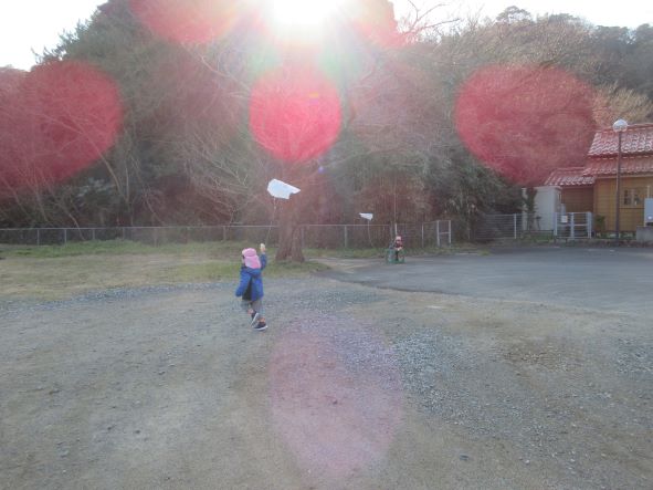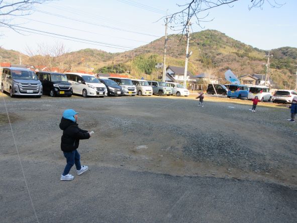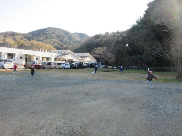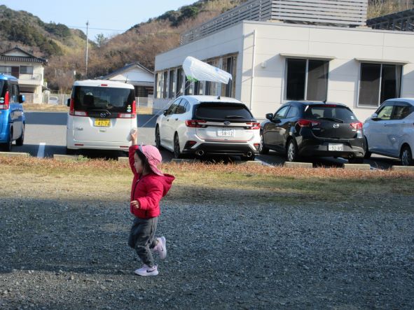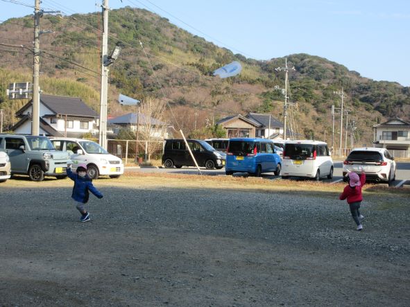 早速、玄関前の駐車場へ行き上げてみました。遊ぶ前は「やったことない」と言っていた子ども達でしたが、凧を手にするとすぐに走り出し、風に乗せて上げることが出来ていました。