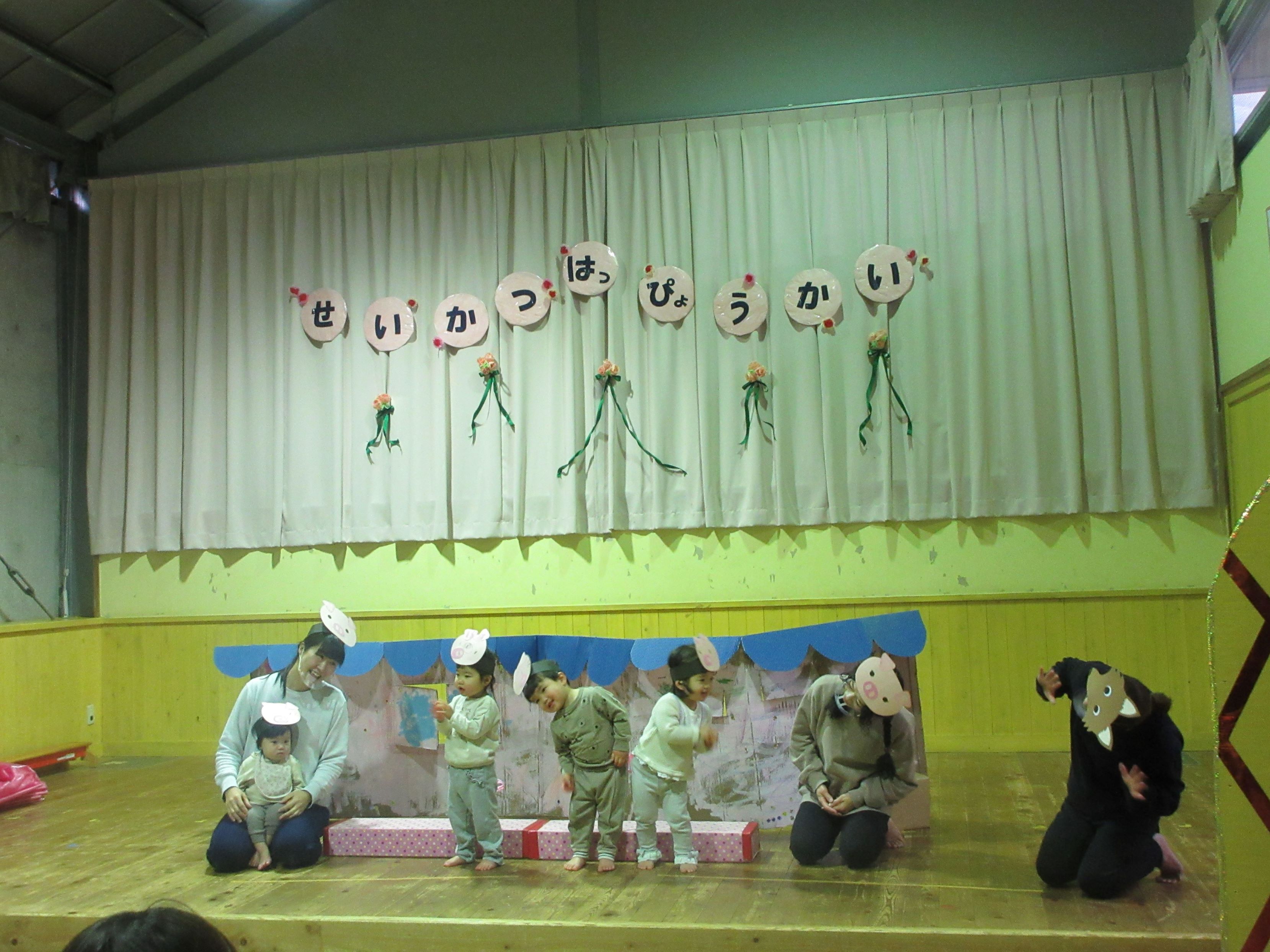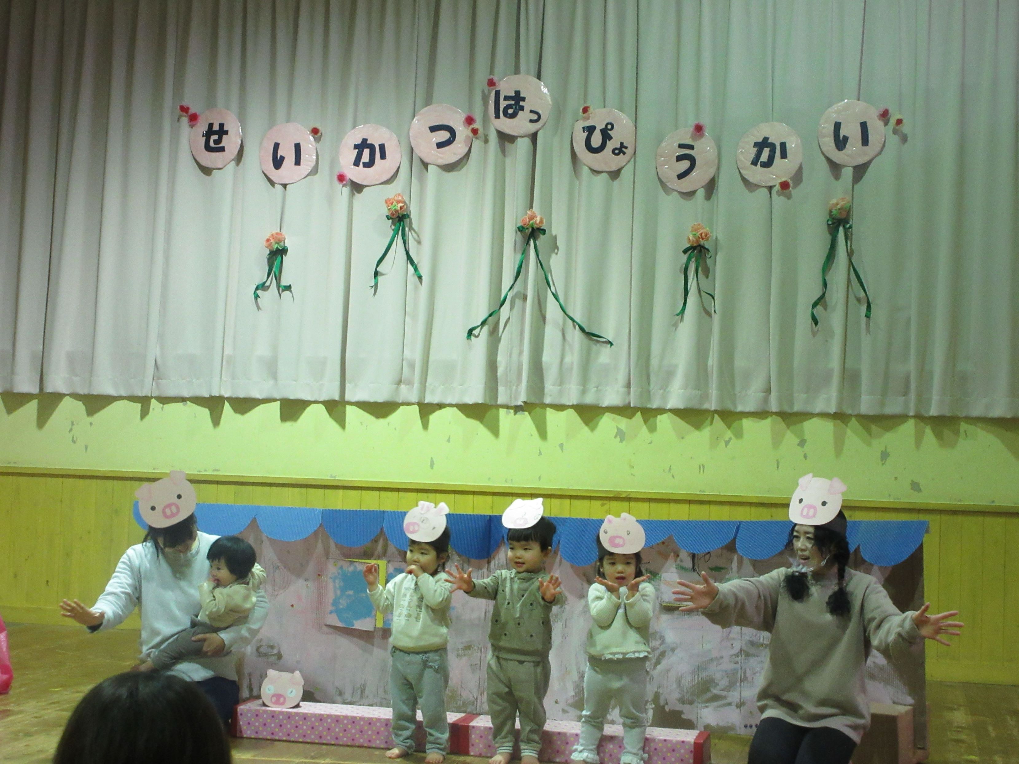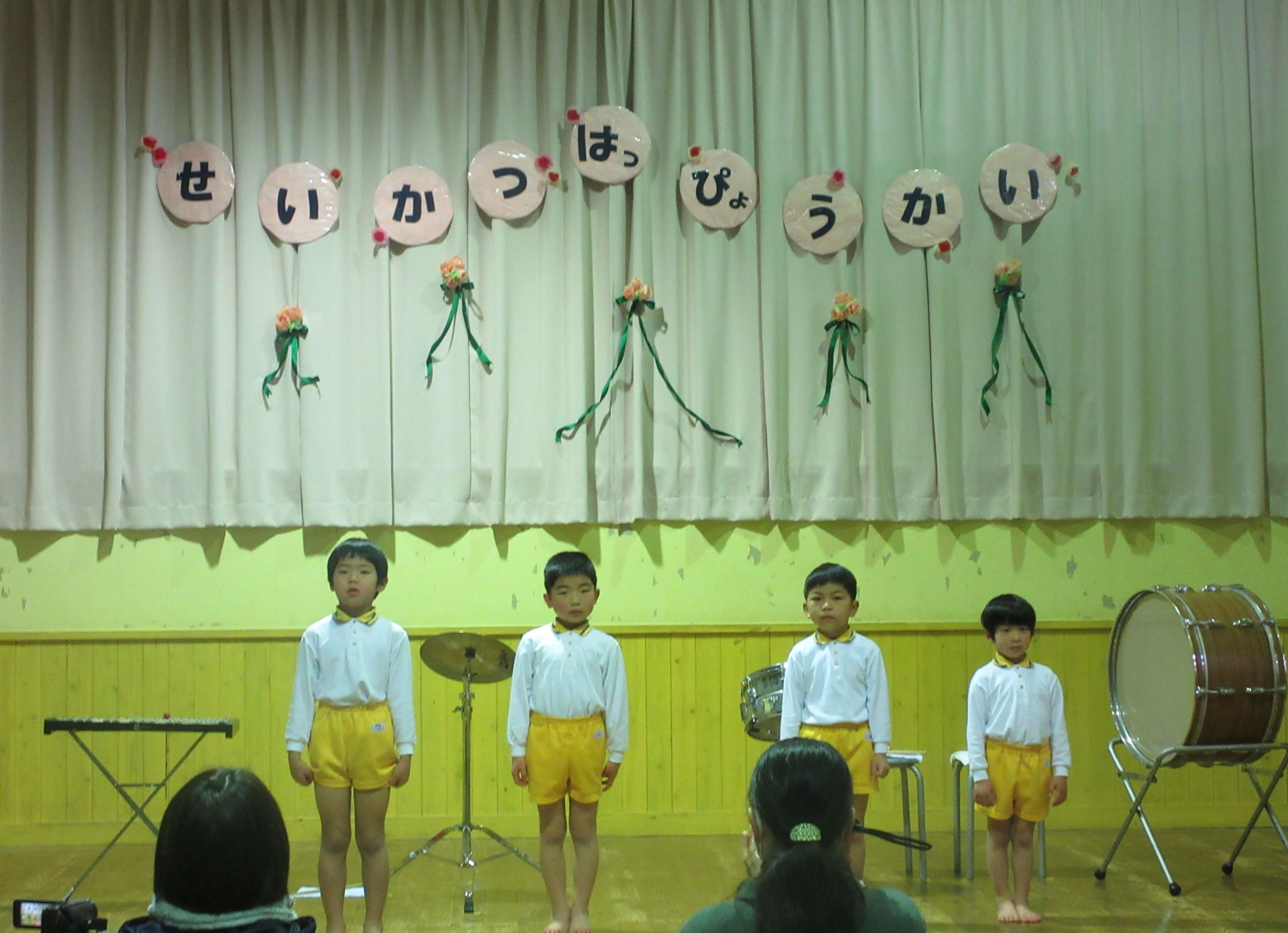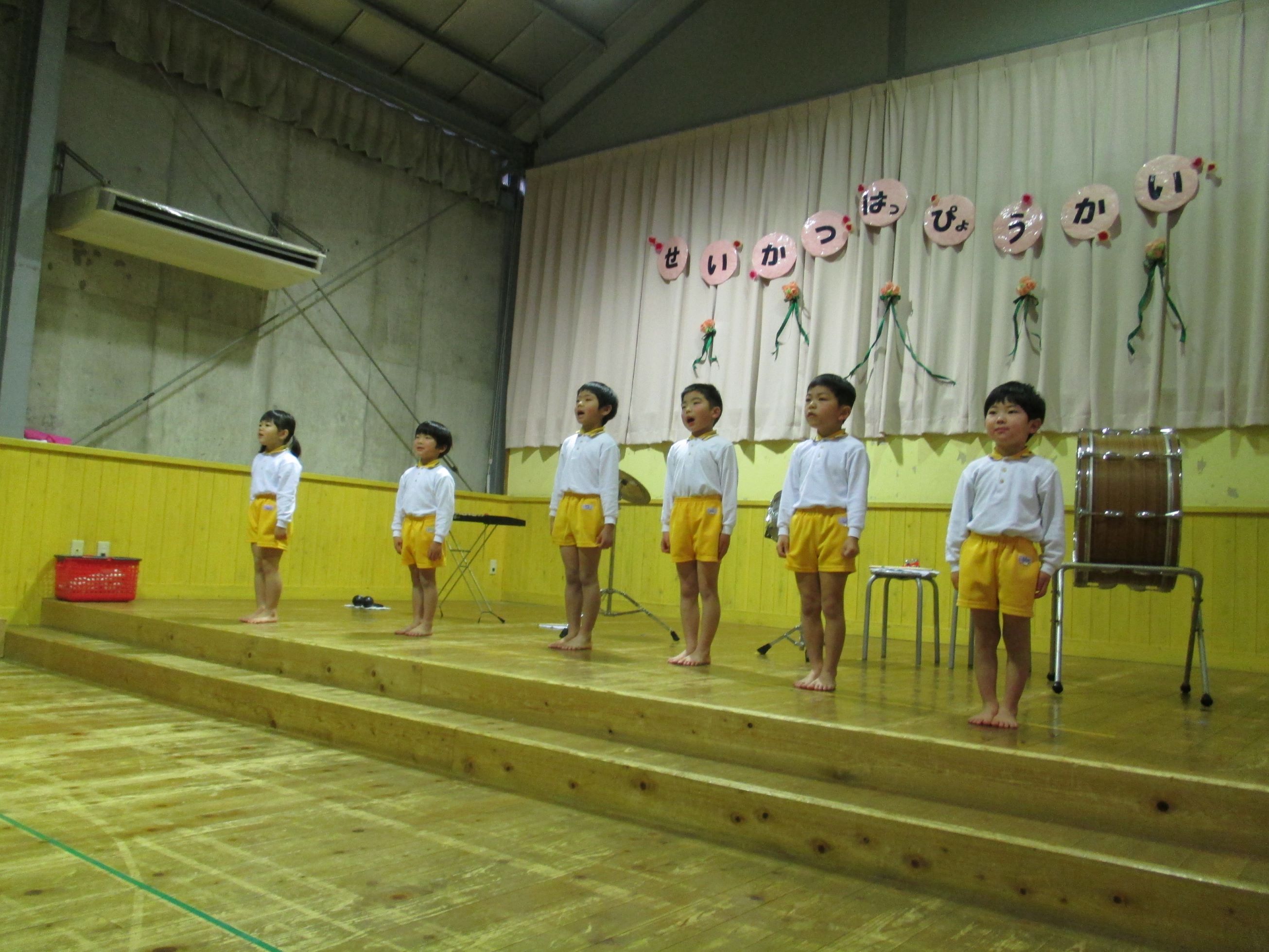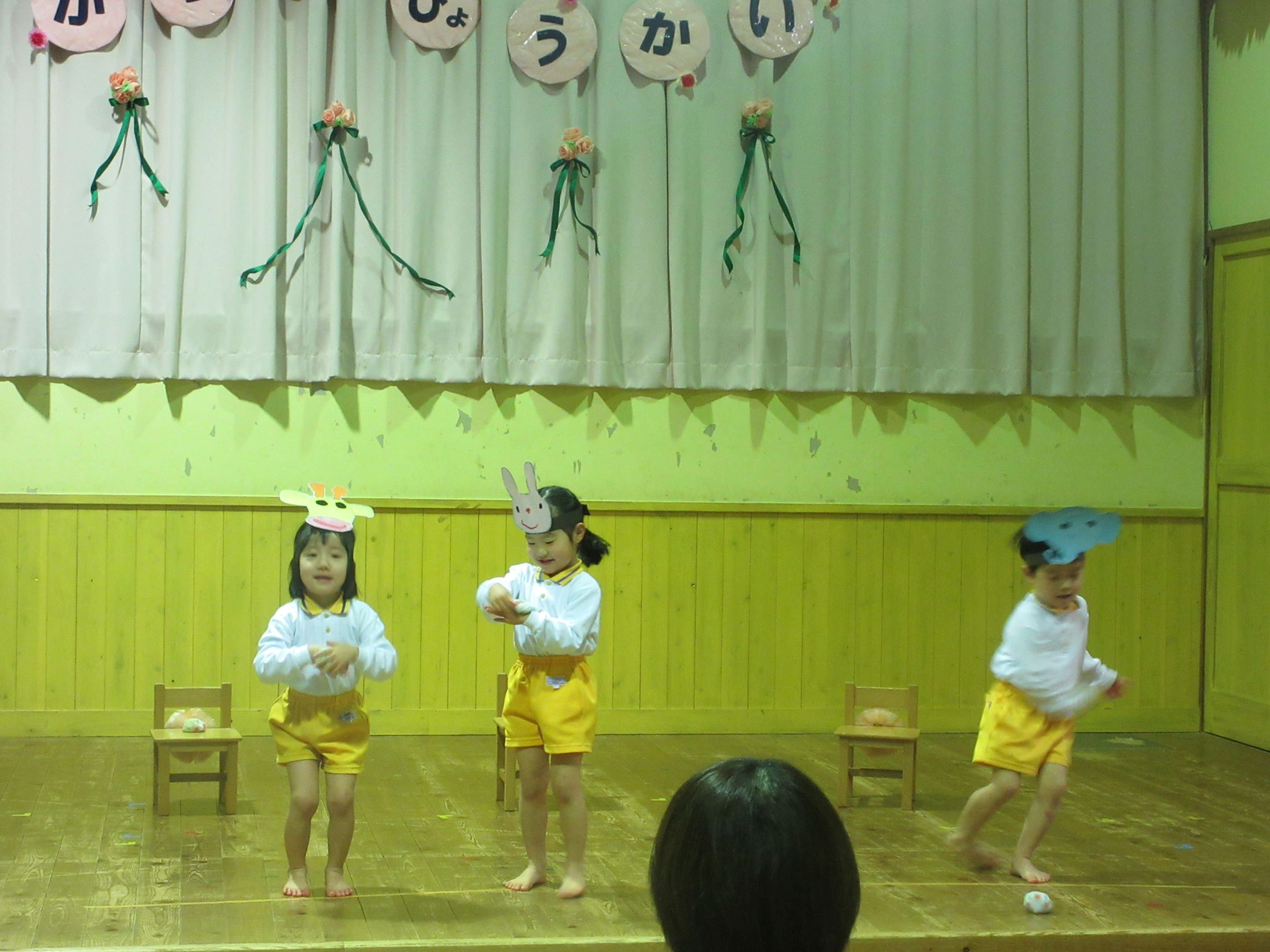 今年の発表会も、クラスごとに保護者の方に見てもらいました。どのクラスの子どもも、練習の時以上の力を発揮することが出来ました。小さいクラスのほし組は、保護者の姿が見えても泣くことなくかわいい姿を見せていました。ゆめ・そら組は、初めは声が小さくて恥ずかしそうにしていましたが、途中から大きな声で元気な姿を披露していました。にじ組は、一人一人が自分の力を出し切って成長した姿を見せてくれました。今日の頑張りが、これからの自信に繋がっていくと思います。