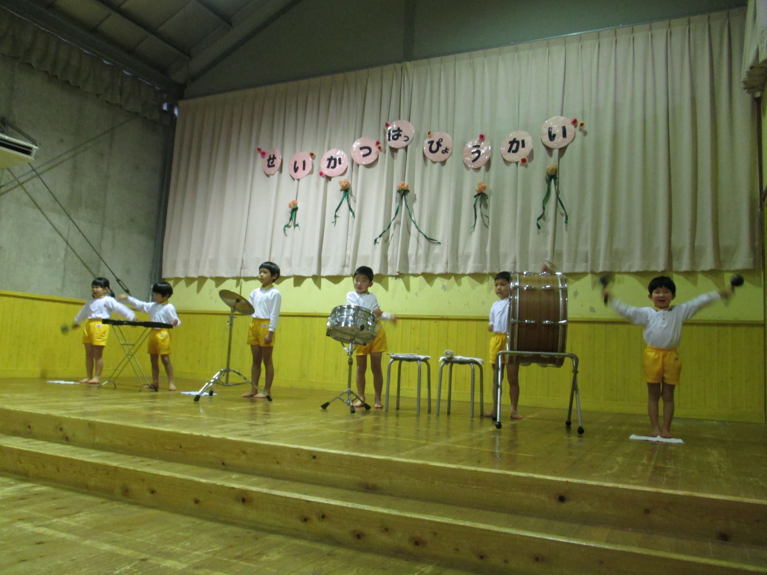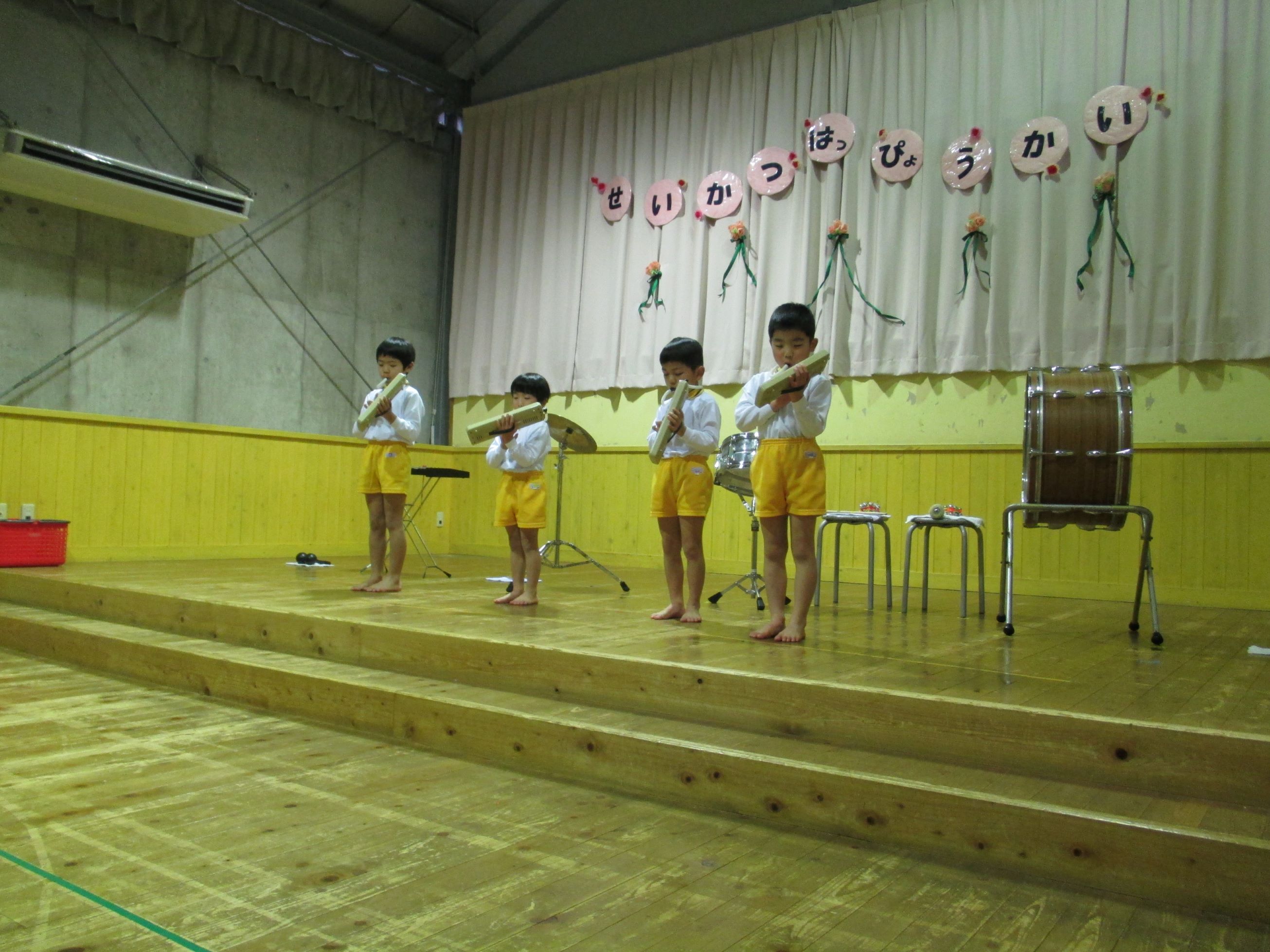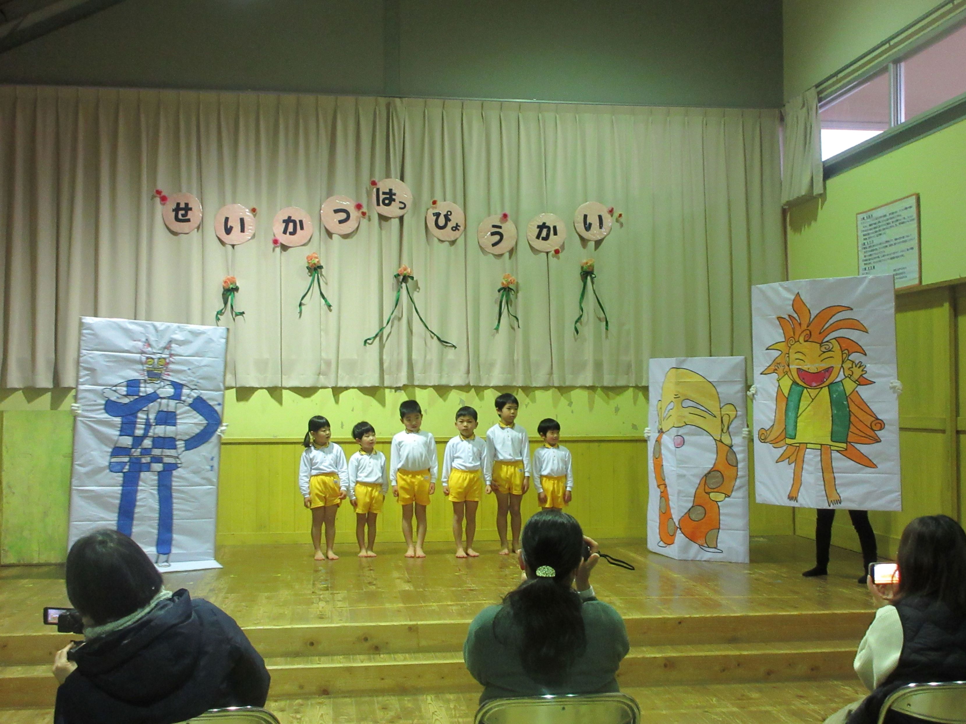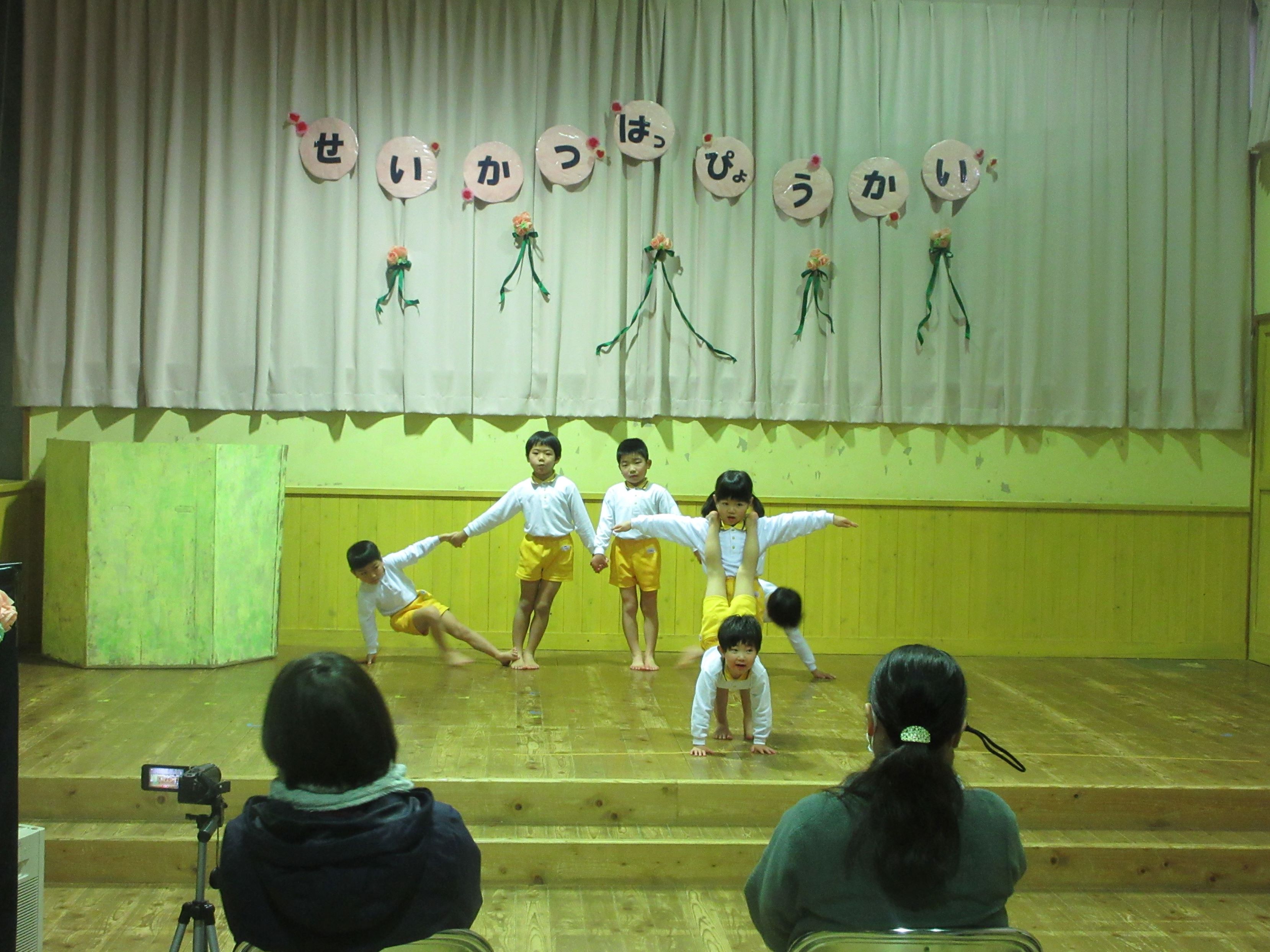 今年の発表会も、クラスごとに保護者の方に見てもらいました。どのクラスの子どもも、練習の時以上の力を発揮することが出来ました。小さいクラスのほし組は、保護者の姿が見えても泣くことなくかわいい姿を見せていました。ゆめ・そら組は、初めは声が小さくて恥ずかしそうにしていましたが、途中から大きな声で元気な姿を披露していました。にじ組は、一人一人が自分の力を出し切って成長した姿を見せてくれました。今日の頑張りが、これからの自信に繋がっていくと思います。