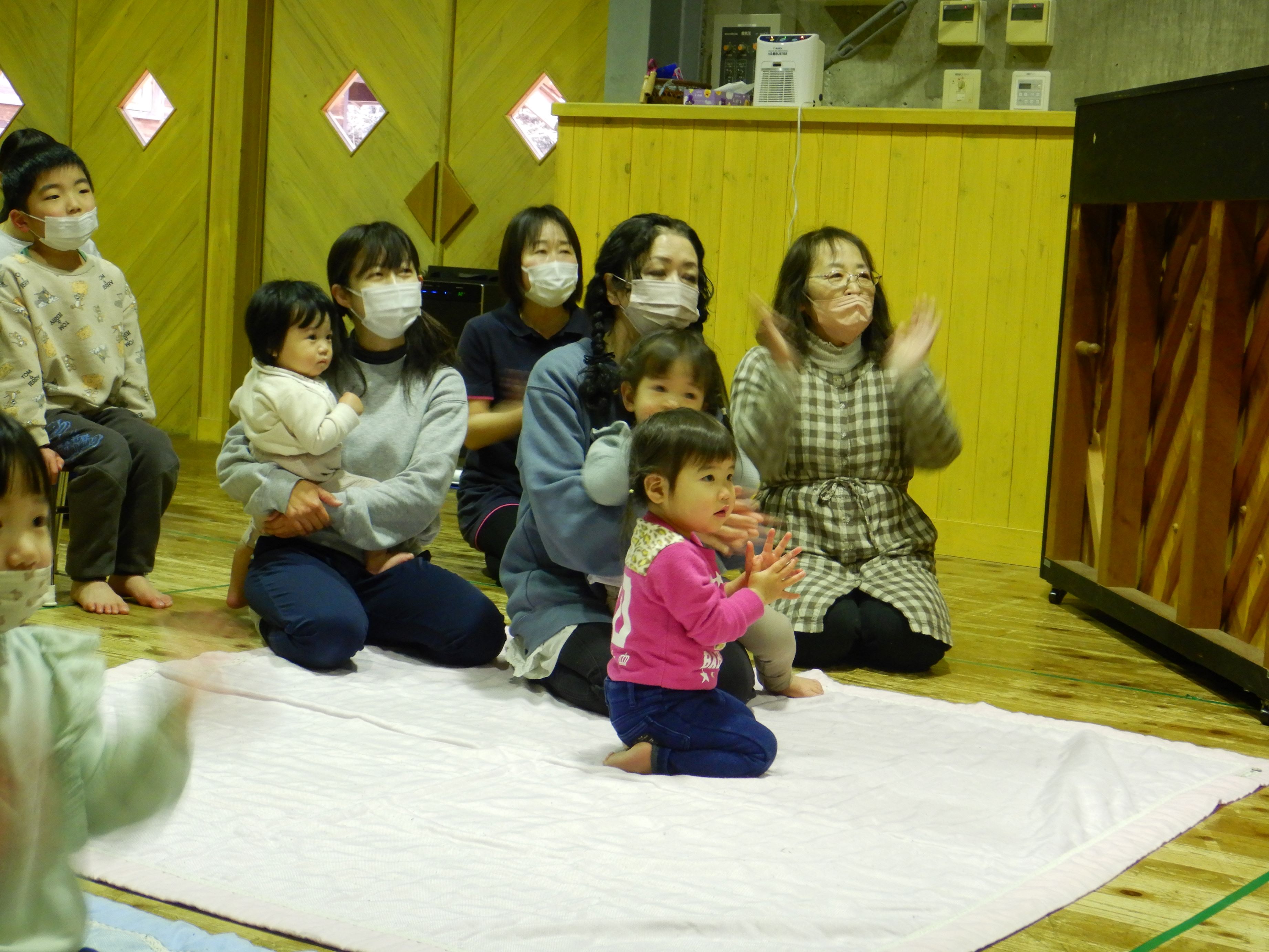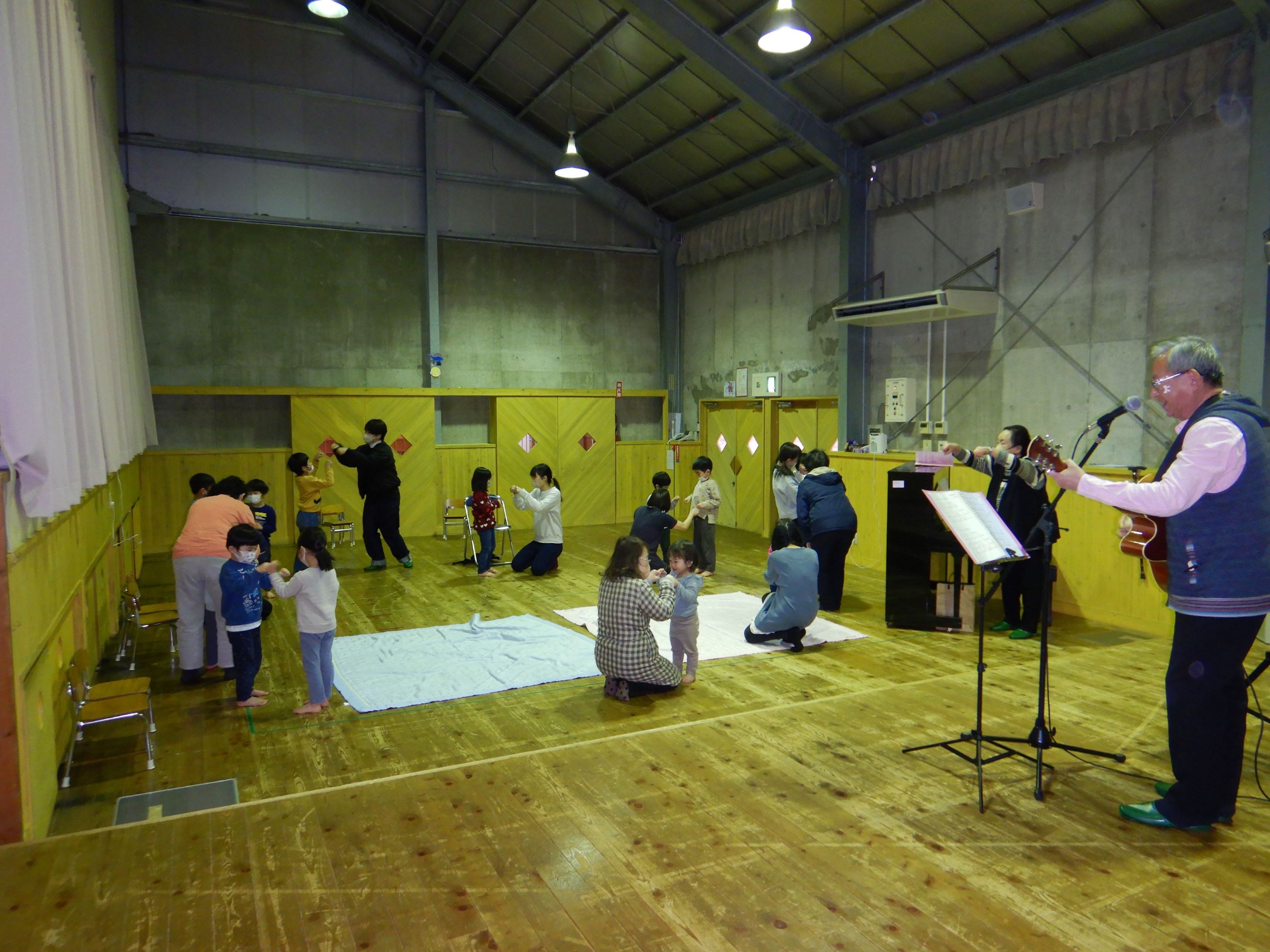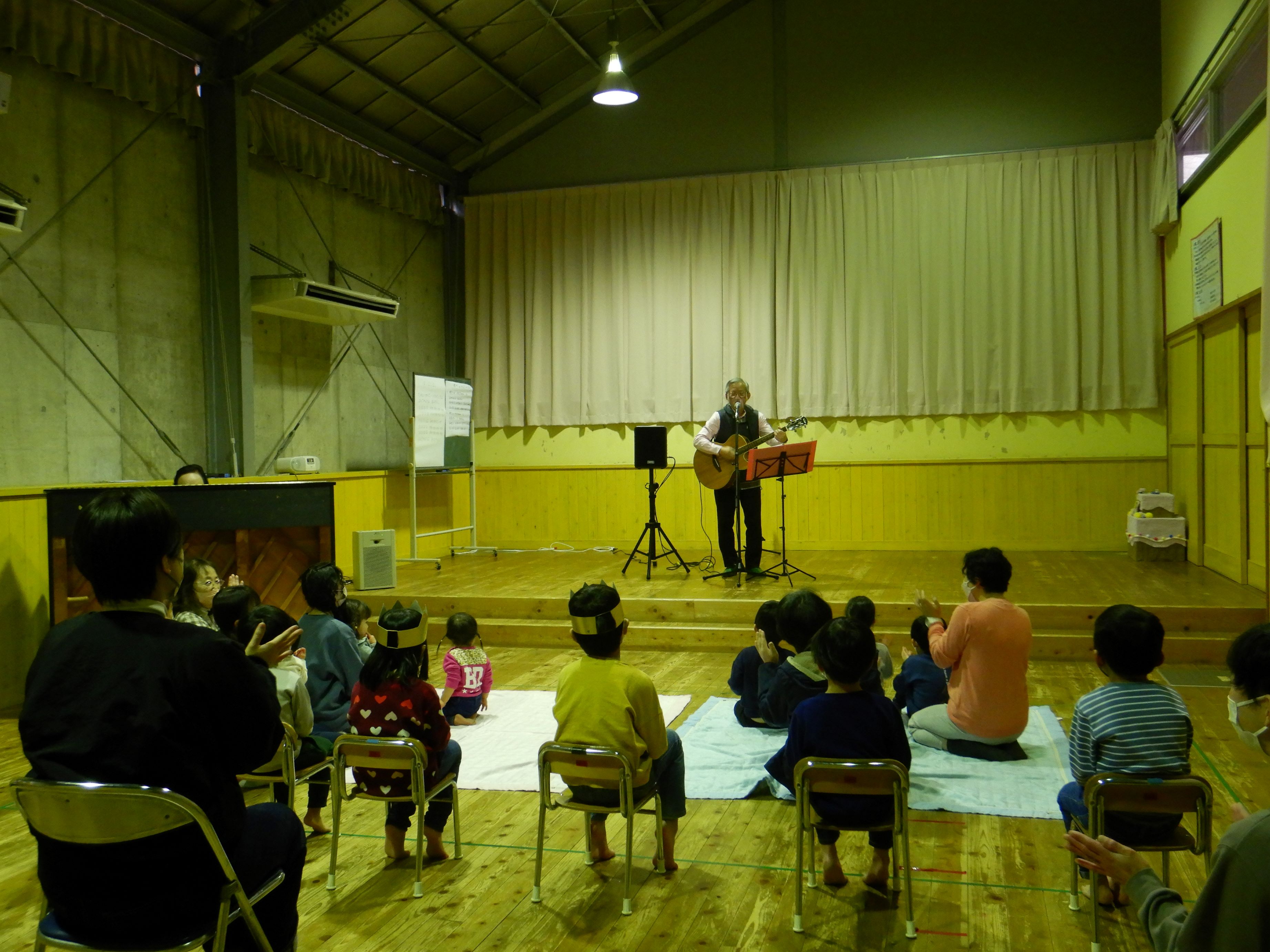 今回はスペシャルゲストにおっくんバンドが登場しました。おっくんのギターとうっちーのピアノに合わせて、みんなで手拍子をしたり、体を動かしたりしながら楽しみました。
