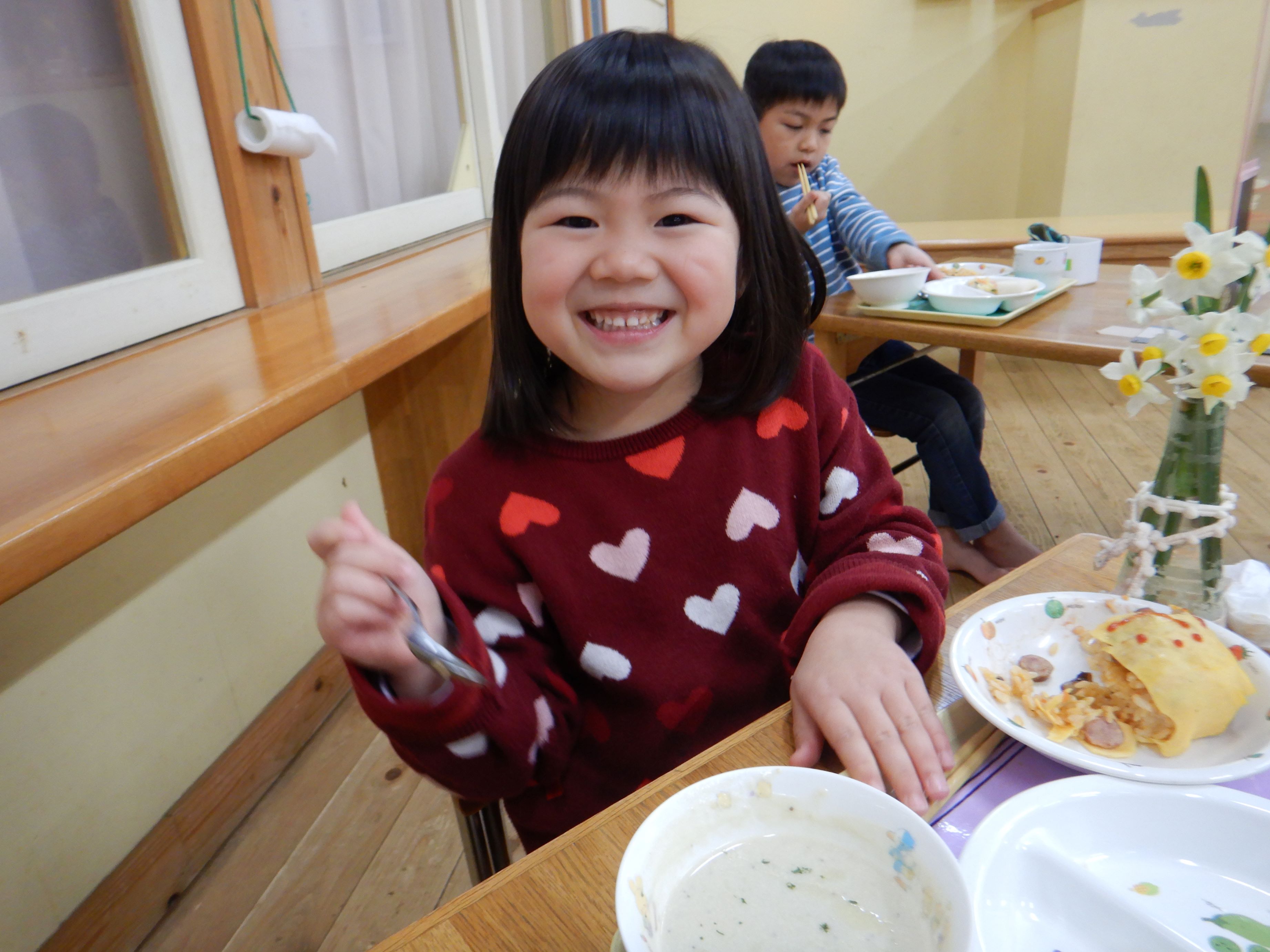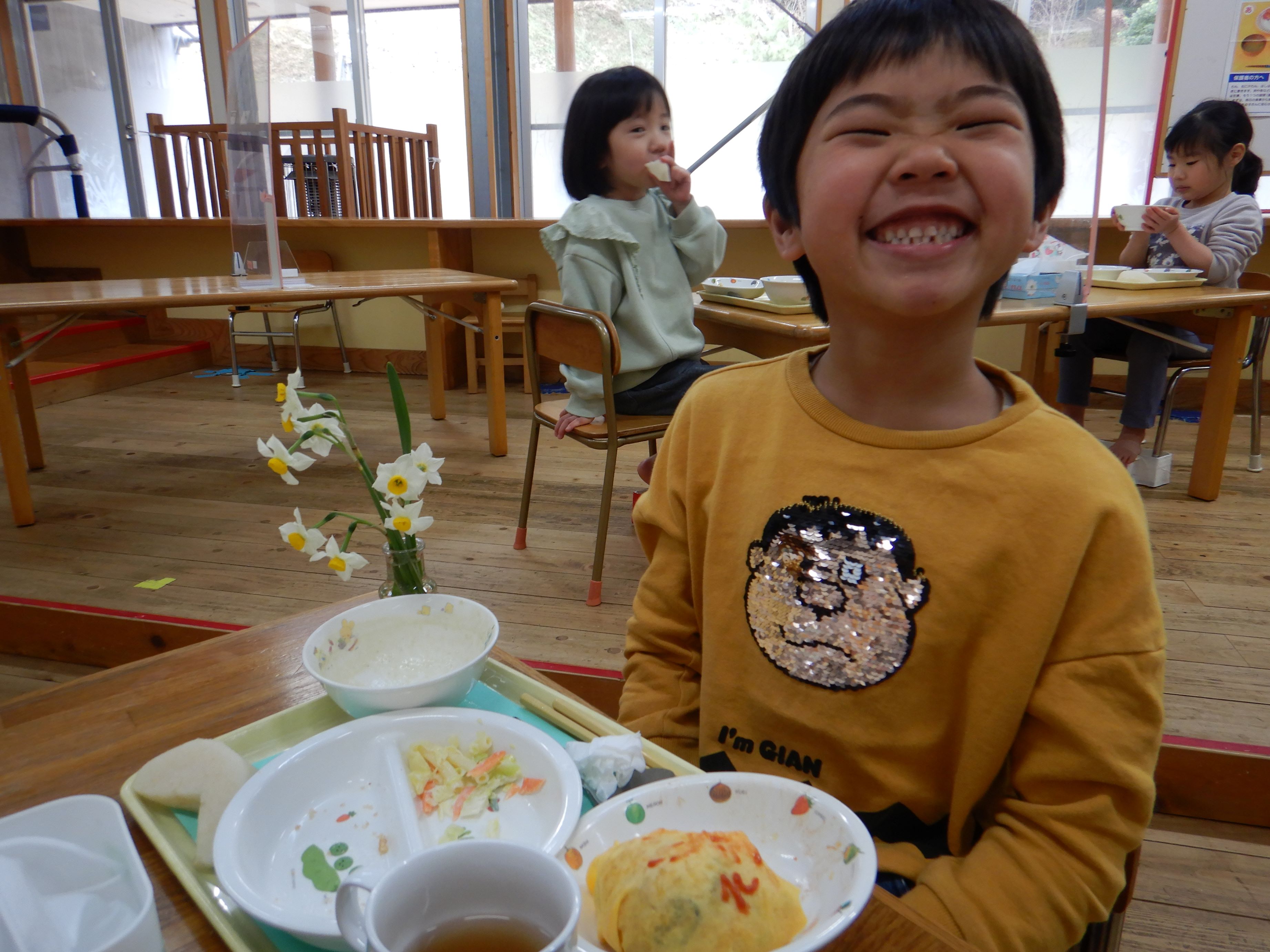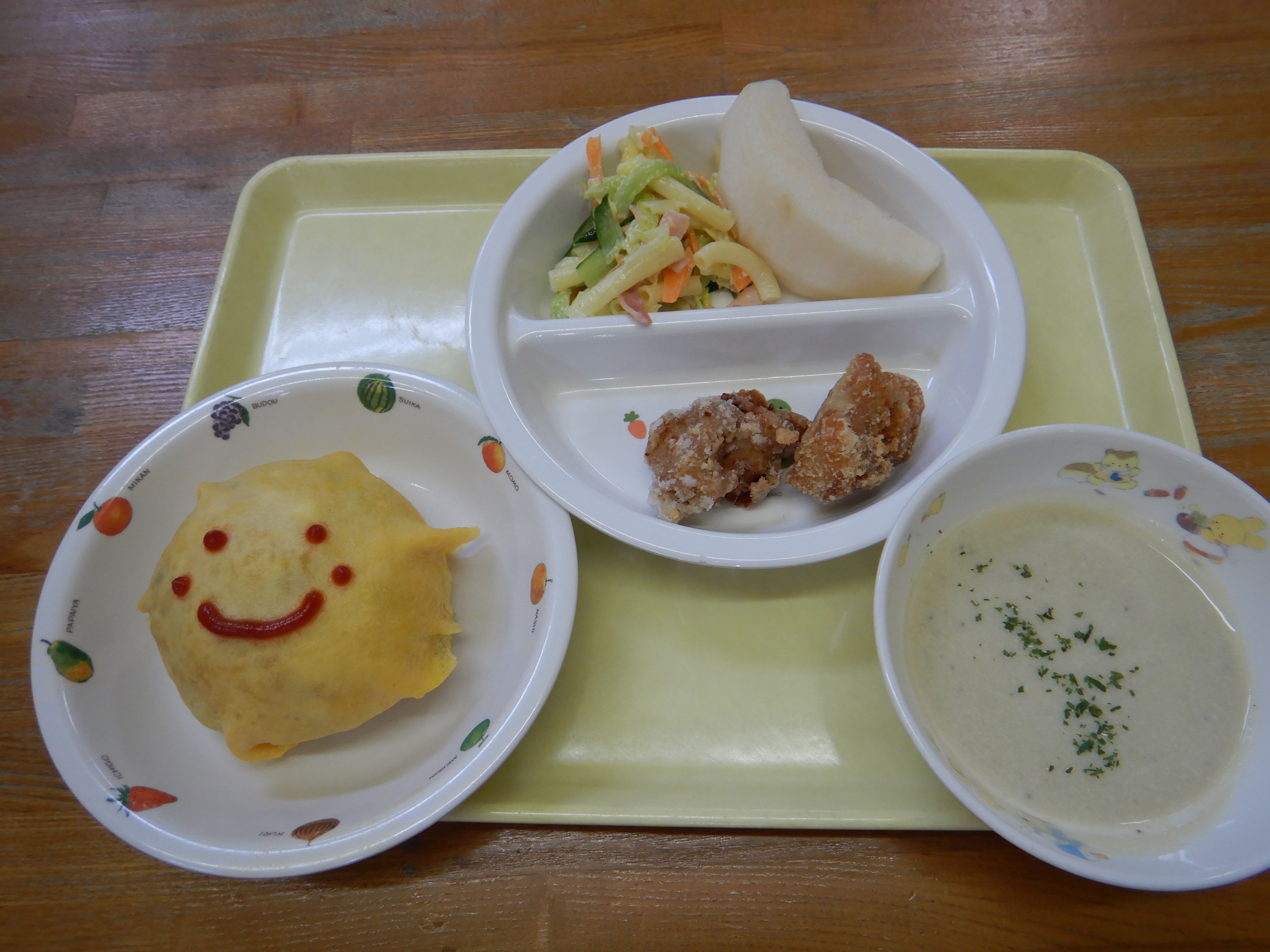 給食は、誕生会の特別メニューで、名前入りのかわいいオムライスでした。その他にも子ども達の好きなものがたくさんあり、喜んで食べていました。