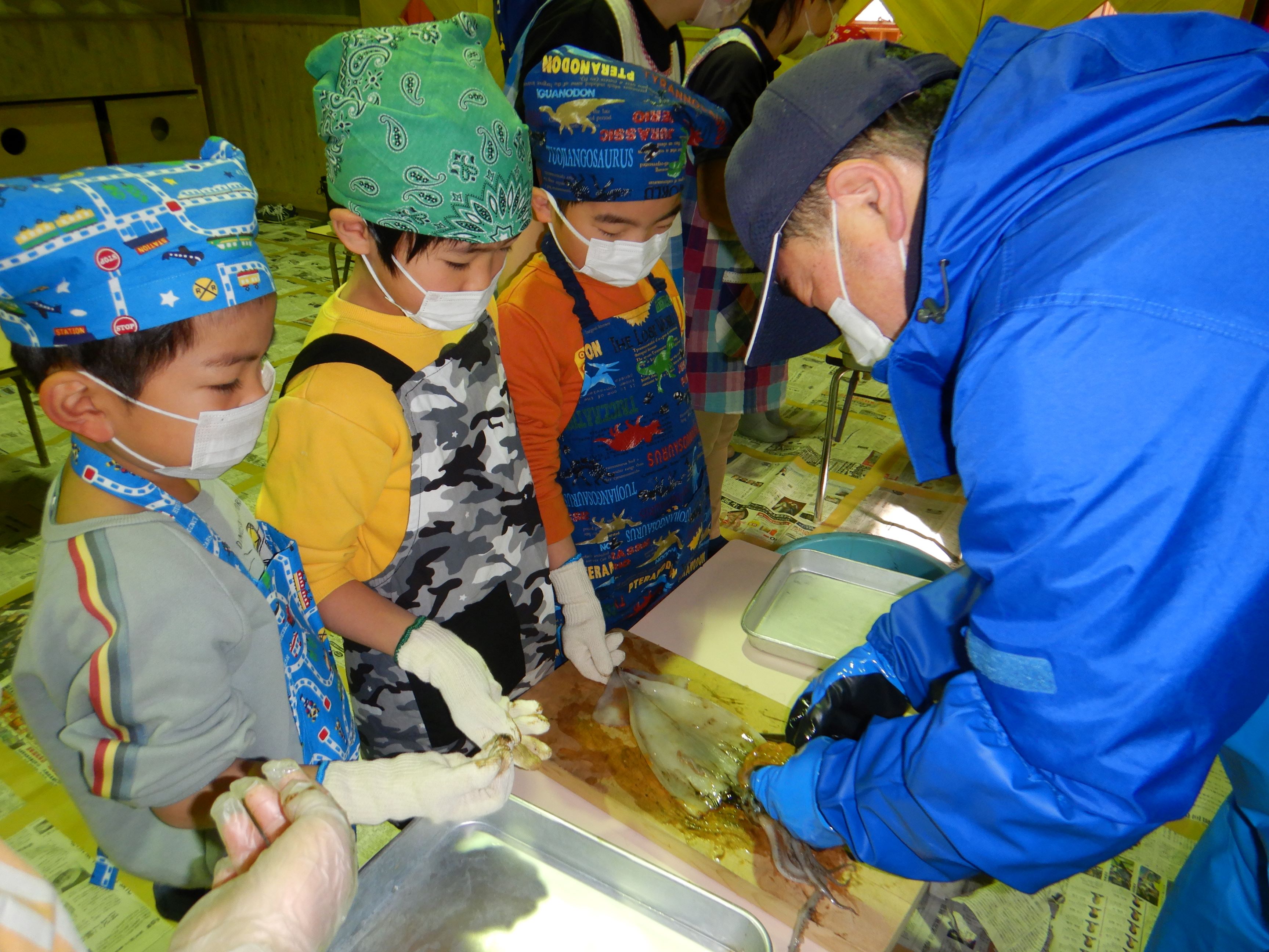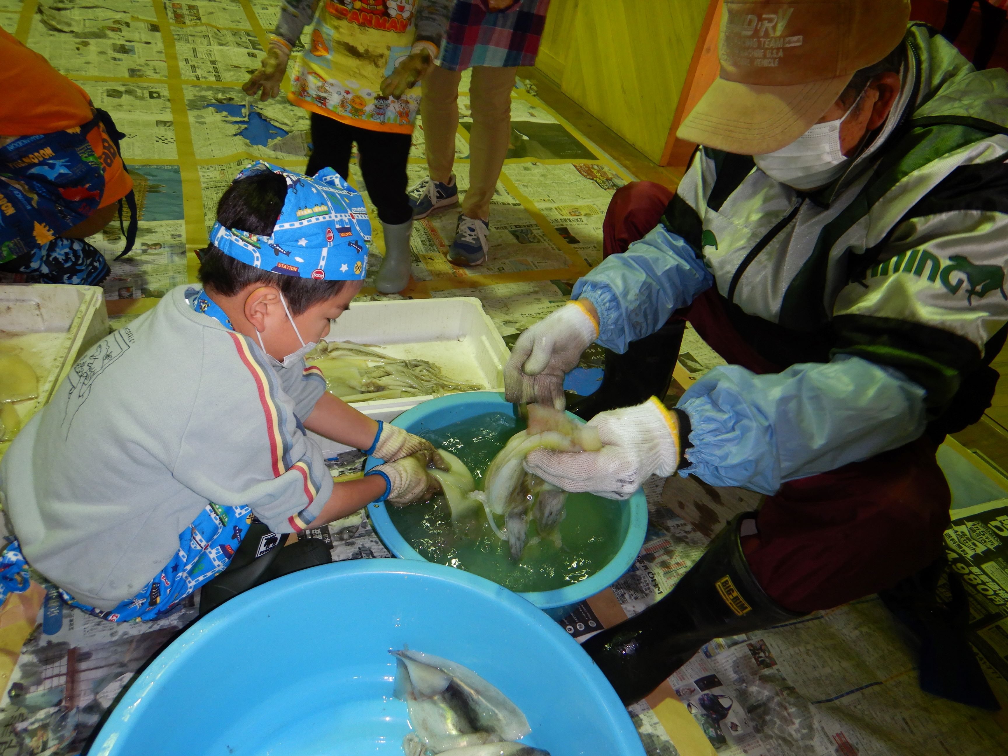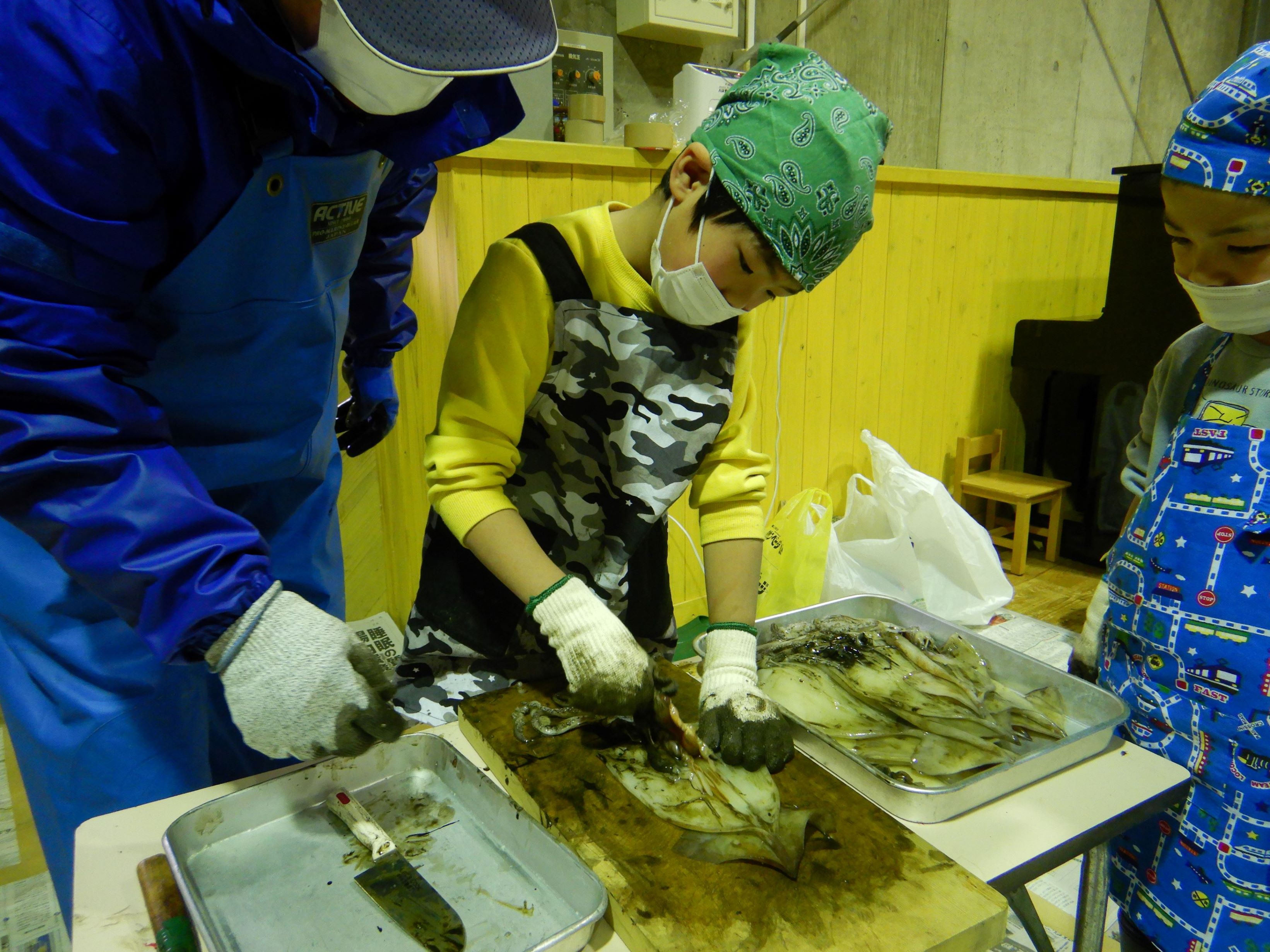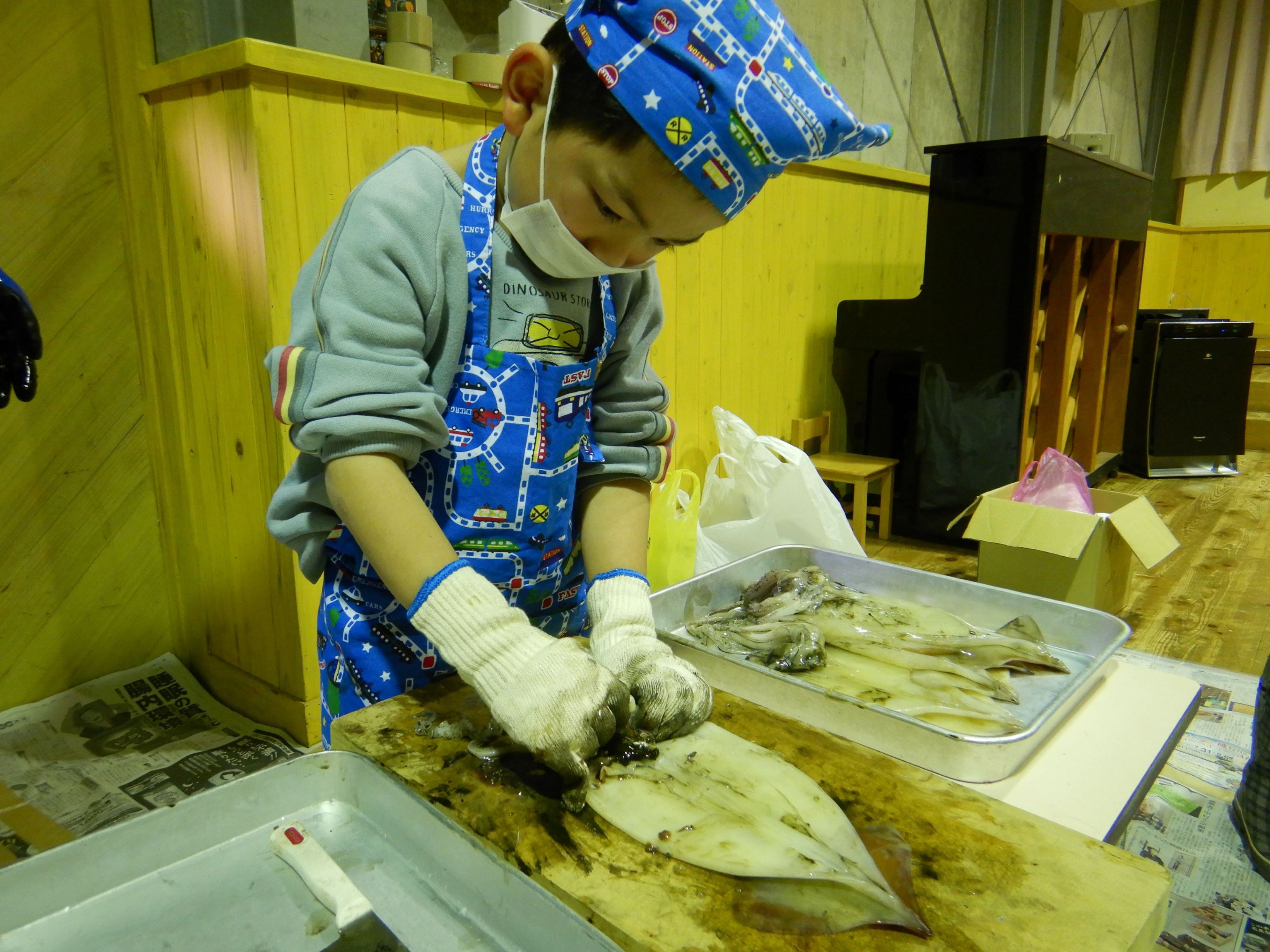 はじめに、地域講師さんからイカの捌き方を見たり聞いたりした後、実際に子ども達が体験しました。最初は、ツルツル滑るイカに「うまく出来ない・・・」と少し苦戦していました。でも、さすが野波っ子、地域講師さんにコツを教わるとすぐに上達し、終わる頃には1人でも捌けるまでになっていました。