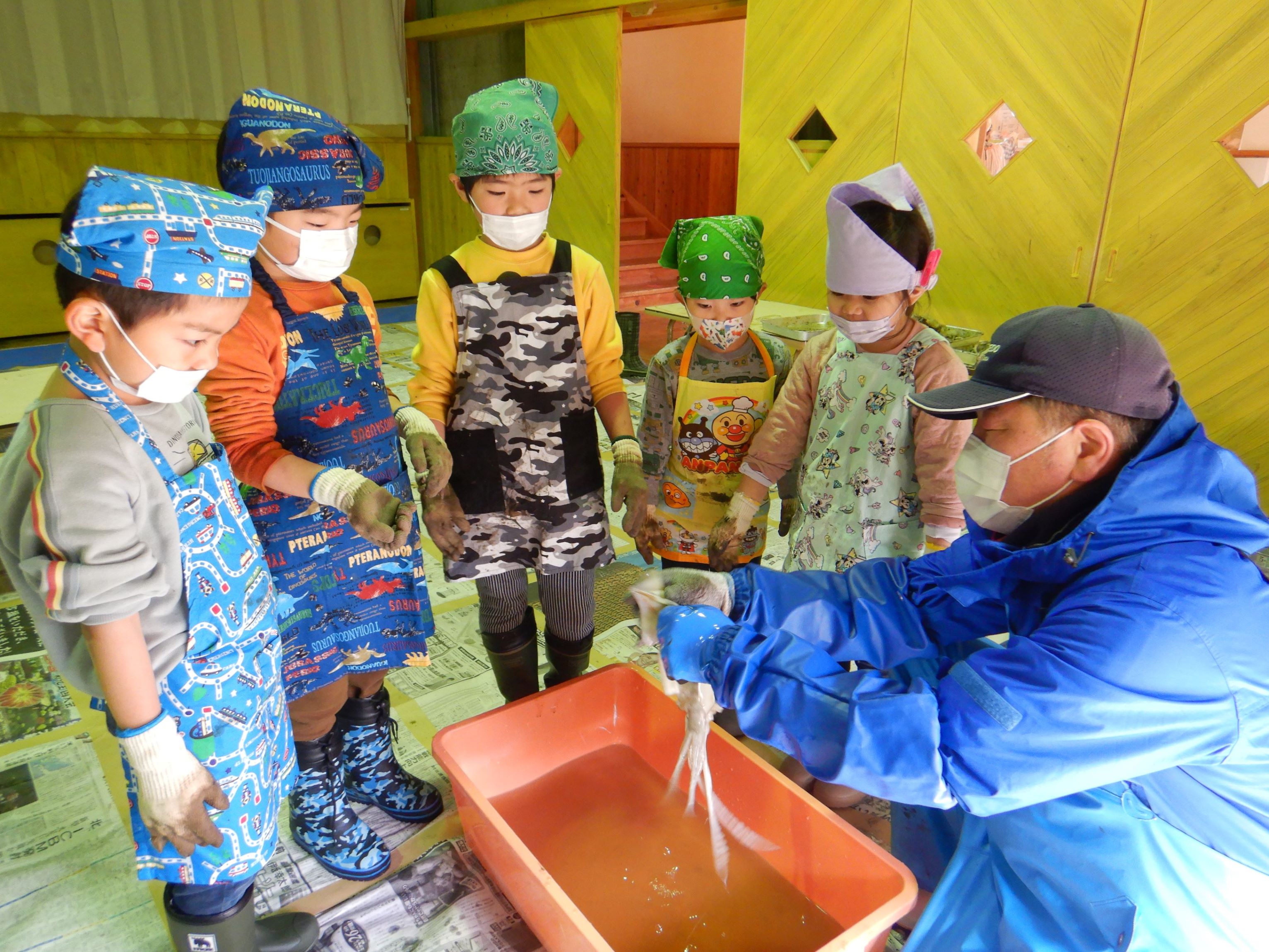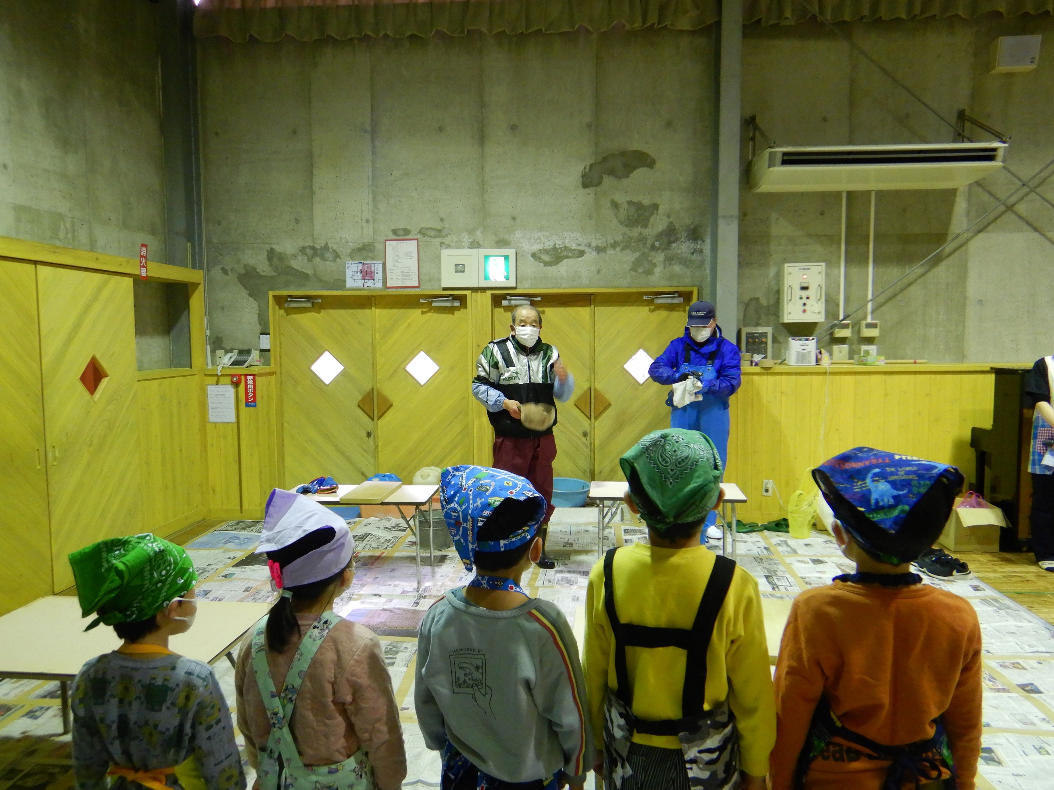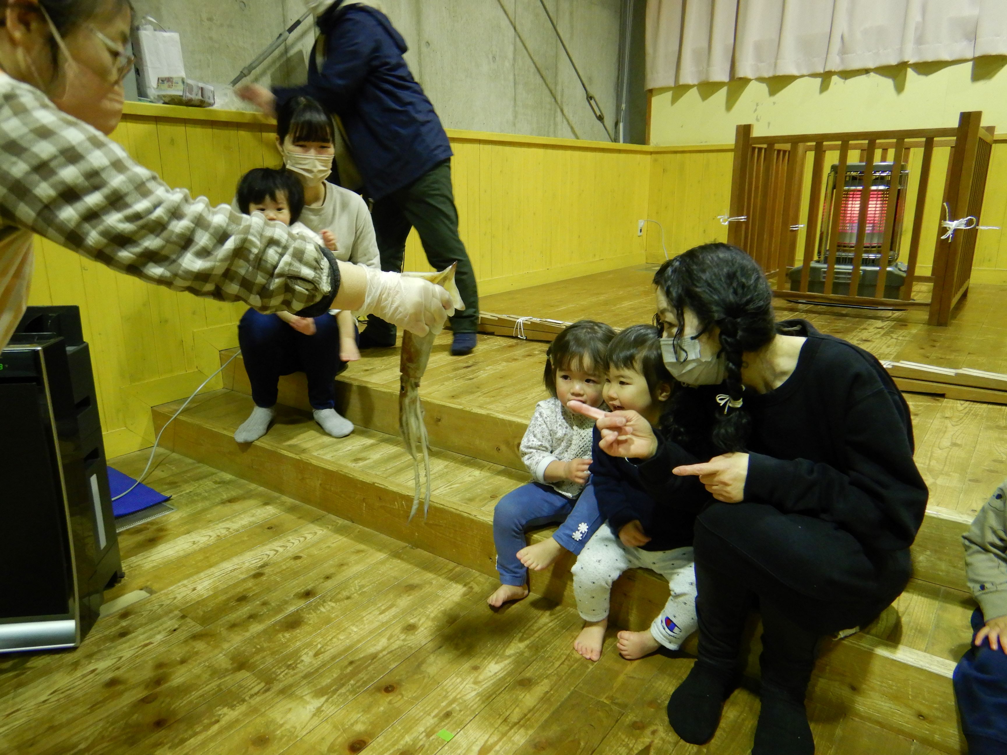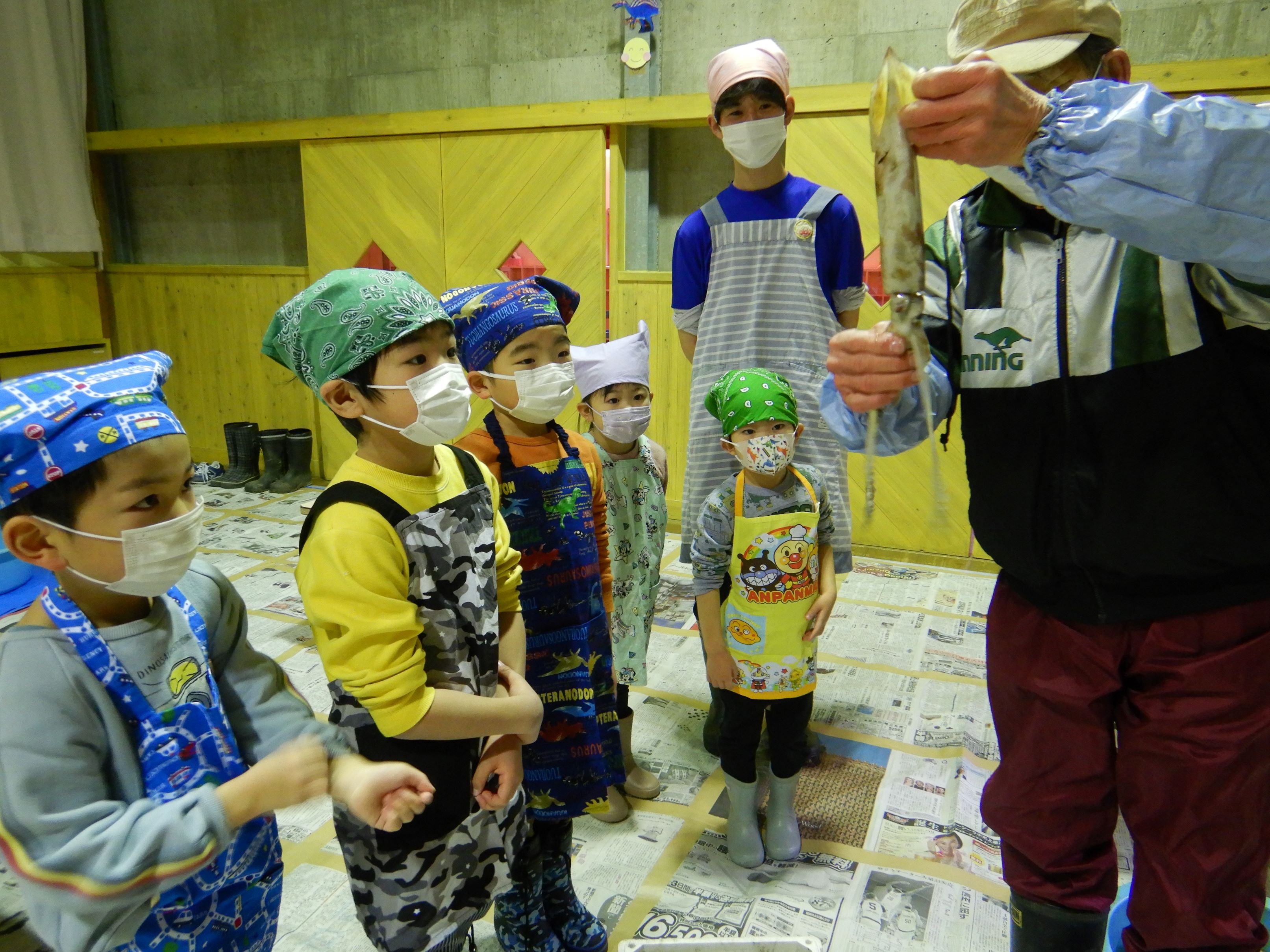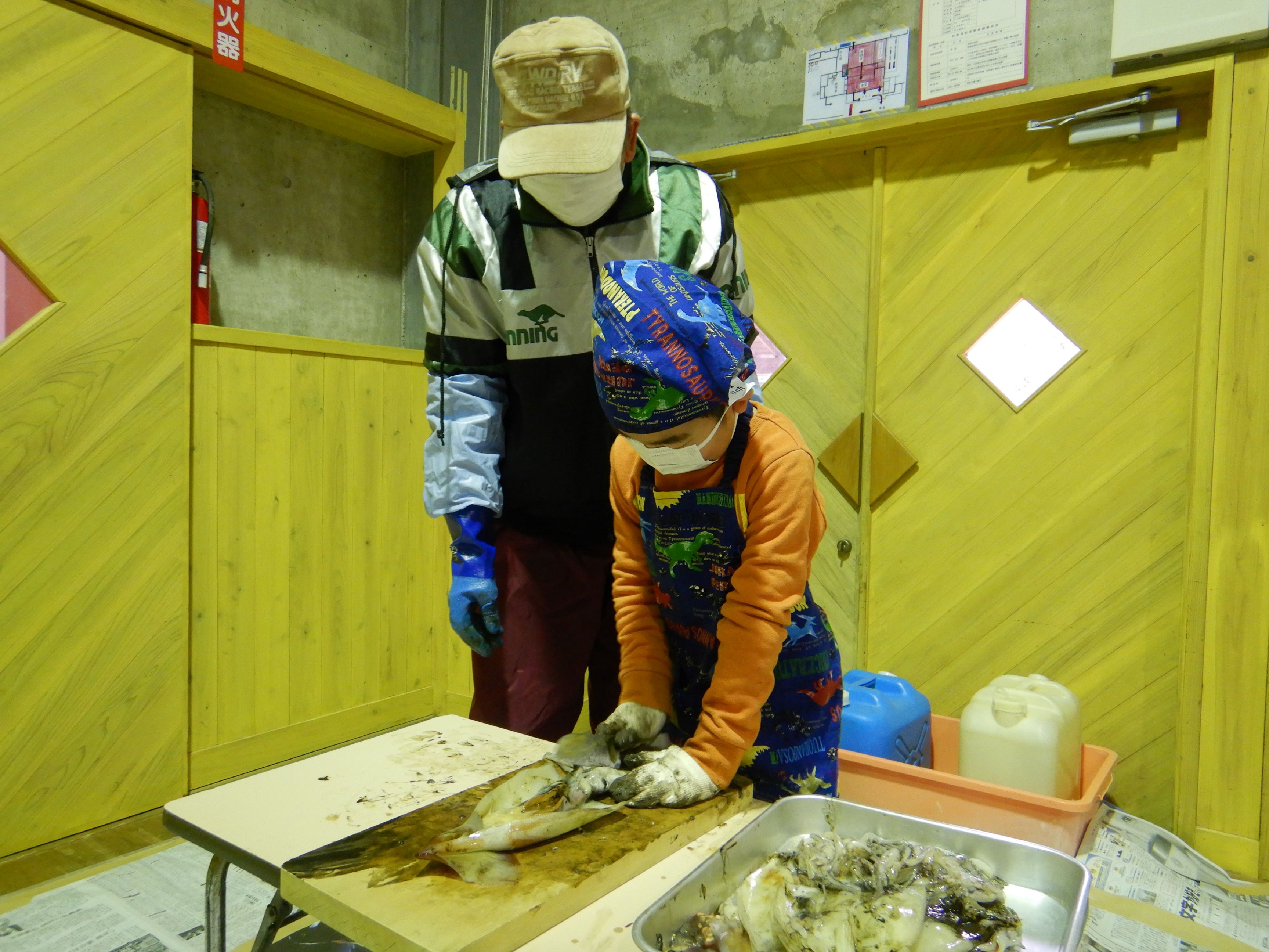 はじめに、地域講師さんからイカの捌き方を見たり聞いたりした後、実際に子ども達が体験しました。最初は、ツルツル滑るイカに「うまく出来ない・・・」と少し苦戦していました。でも、さすが野波っ子、地域講師さんにコツを教わるとすぐに上達し、終わる頃には1人でも捌けるまでになっていました。