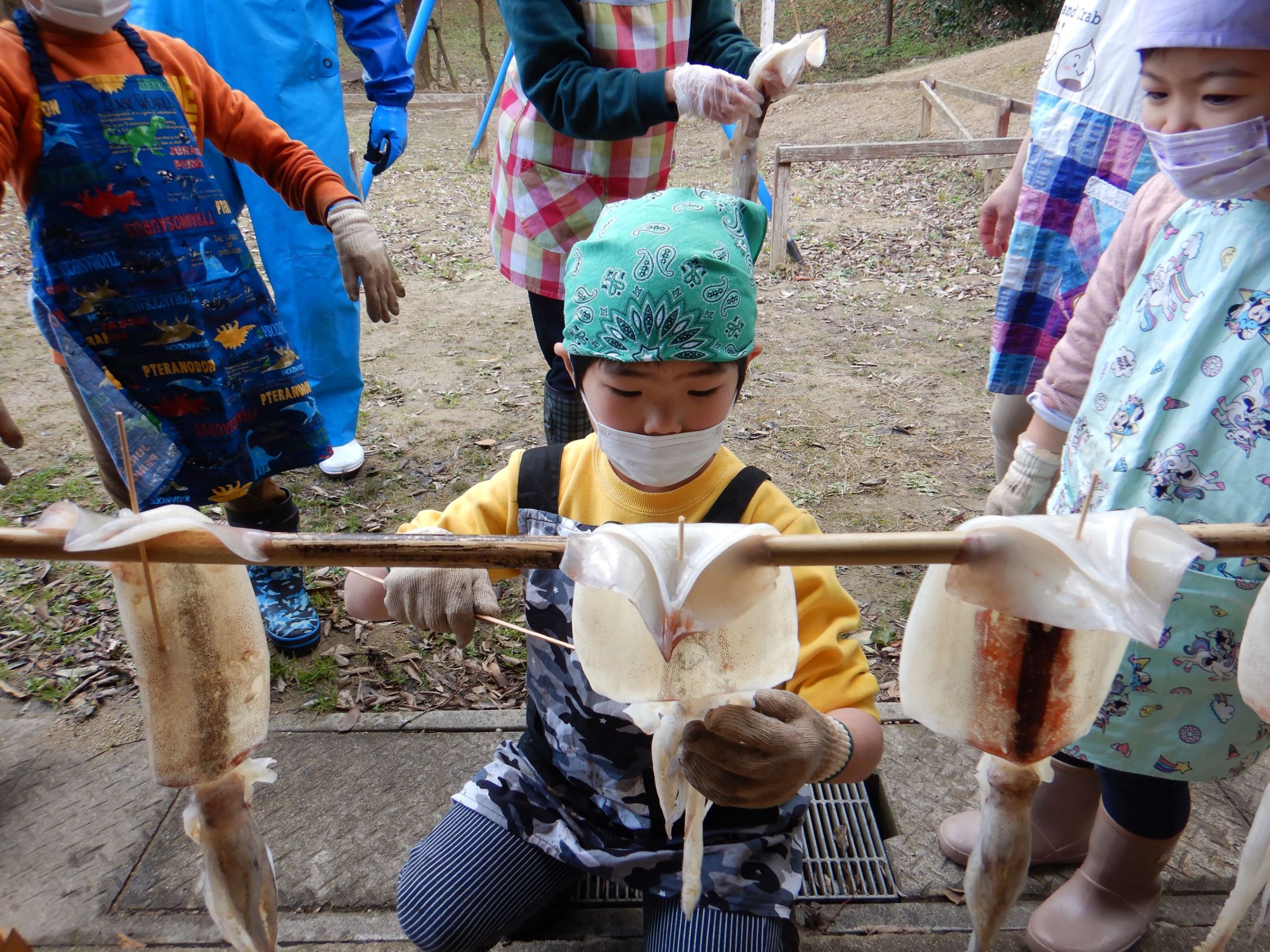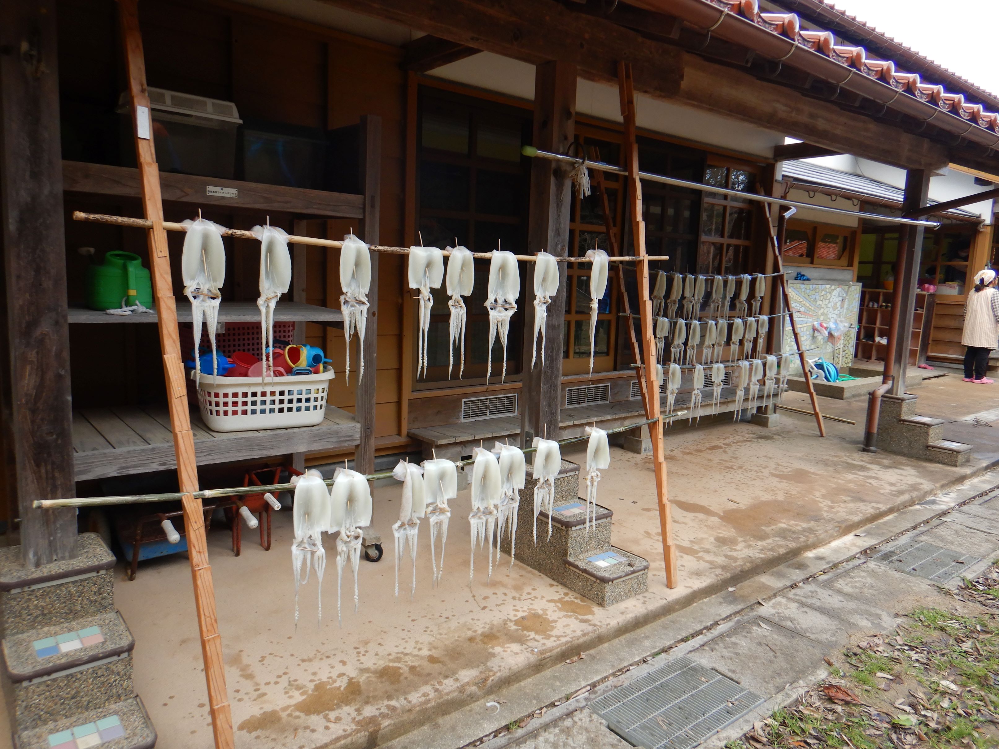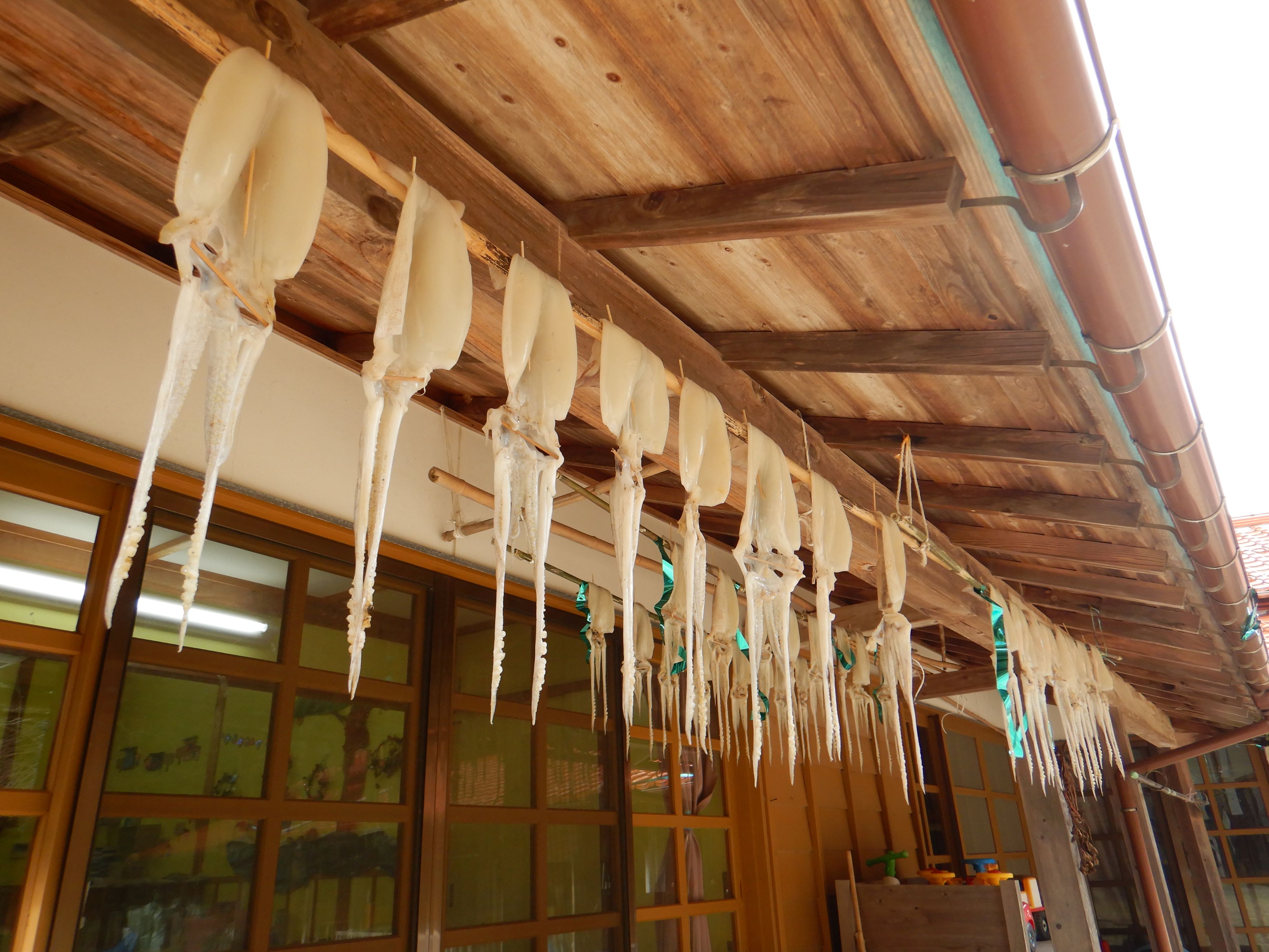 きれいに並べ軒下に吊るし、風に揺れるイカを見て「早く食べたいな」と、楽しみにしている子ども達でした。