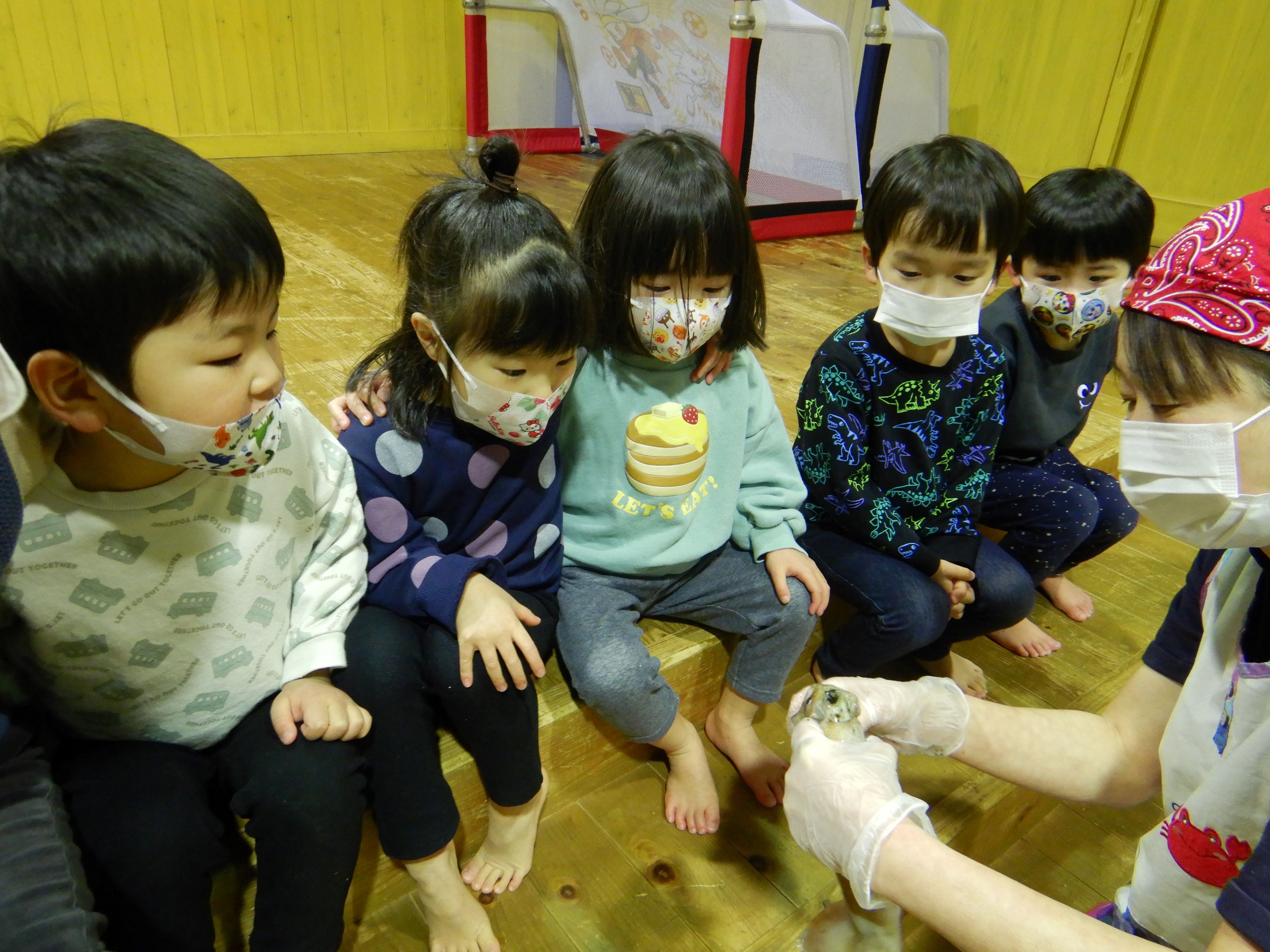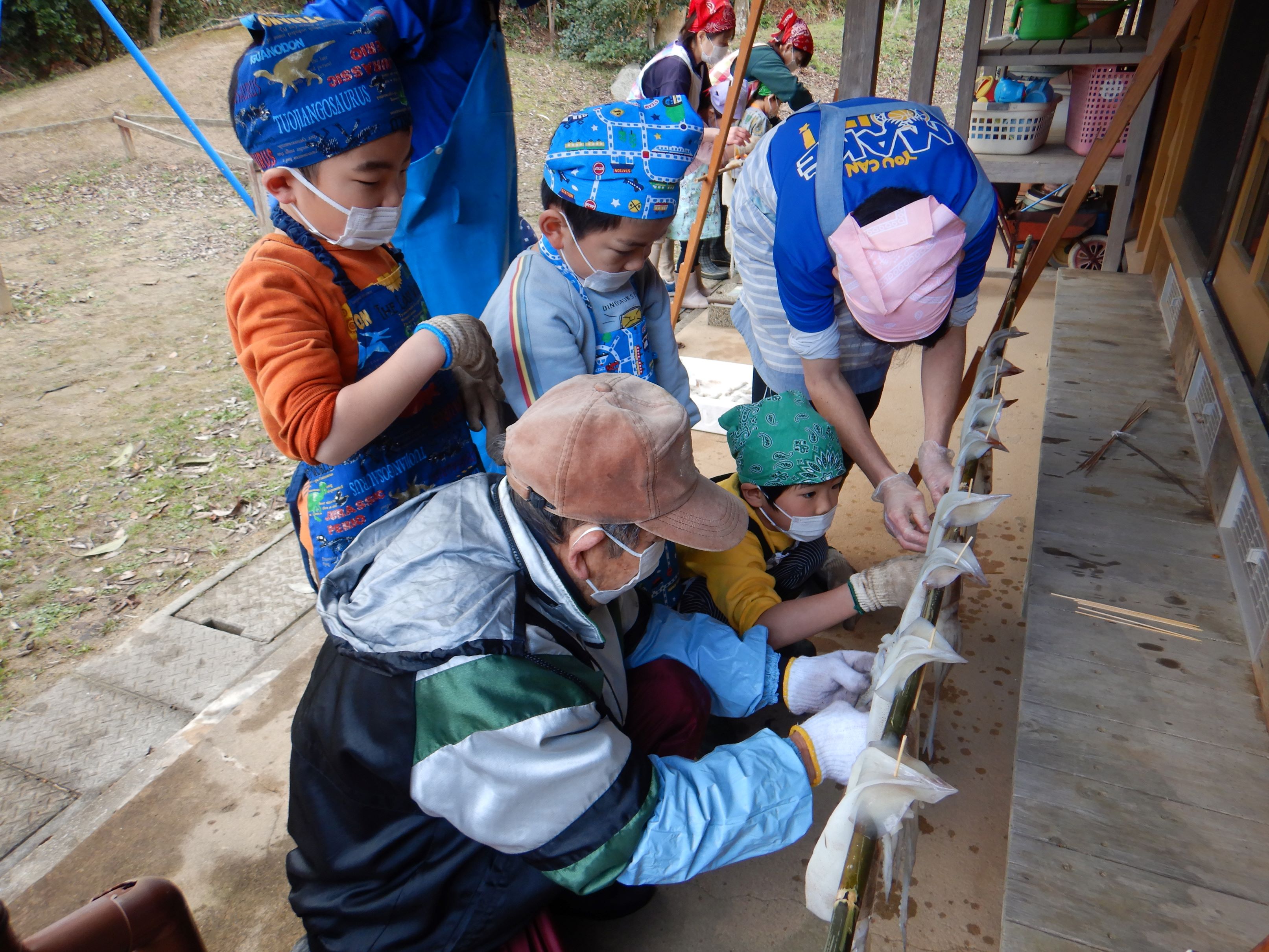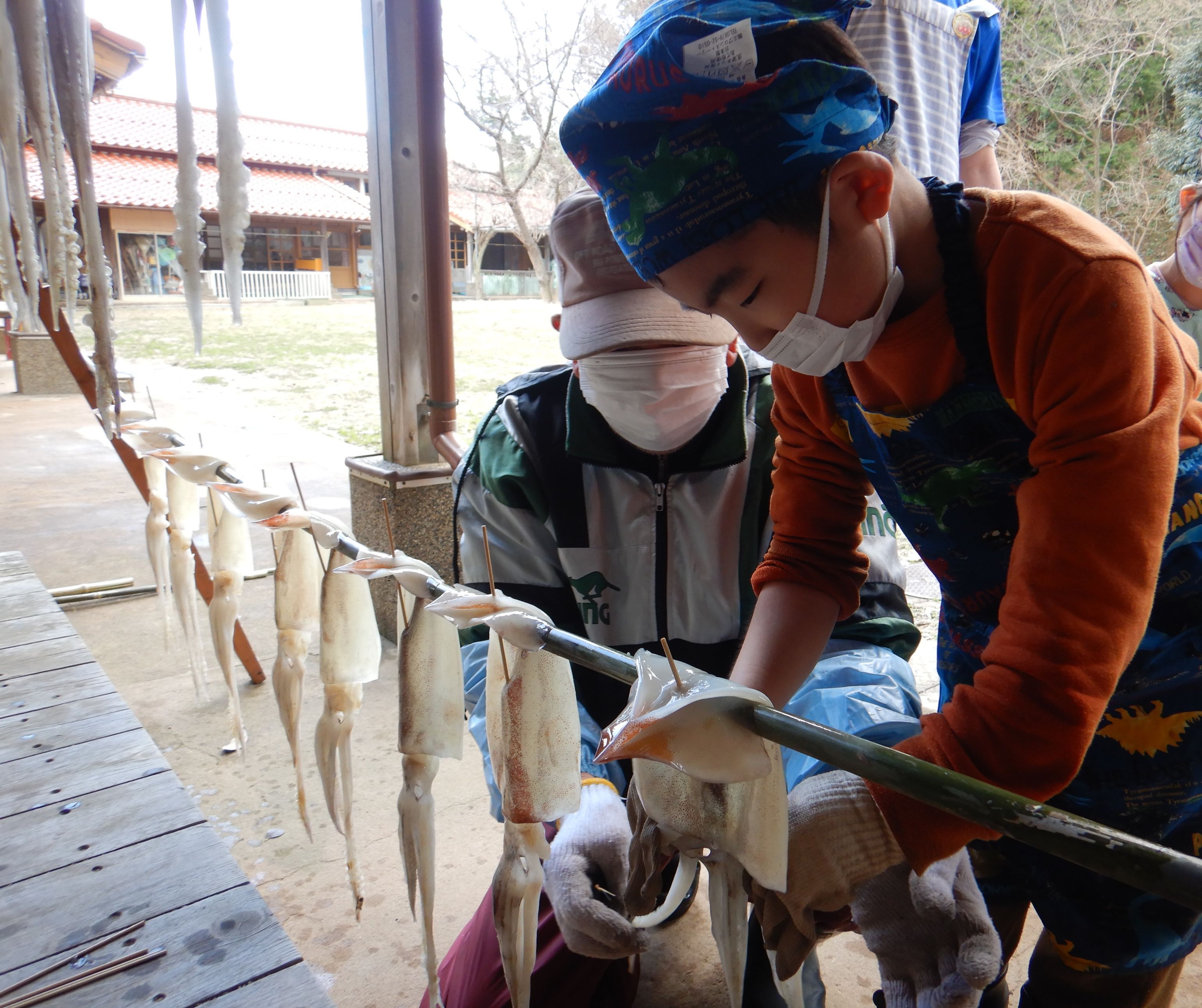 きれいに並べ軒下に吊るし、風に揺れるイカを見て「早く食べたいな」と、楽しみにしている子ども達でした。