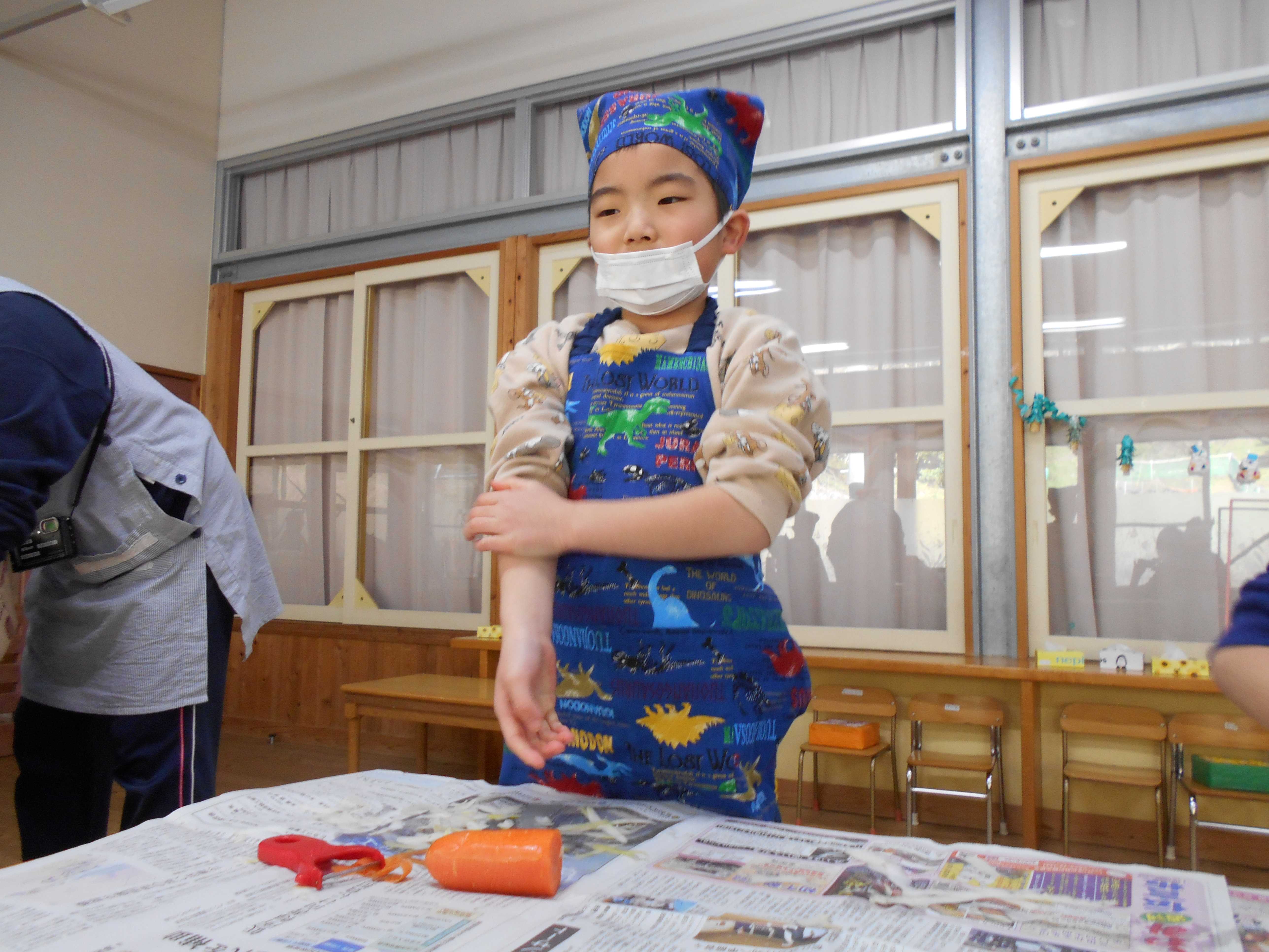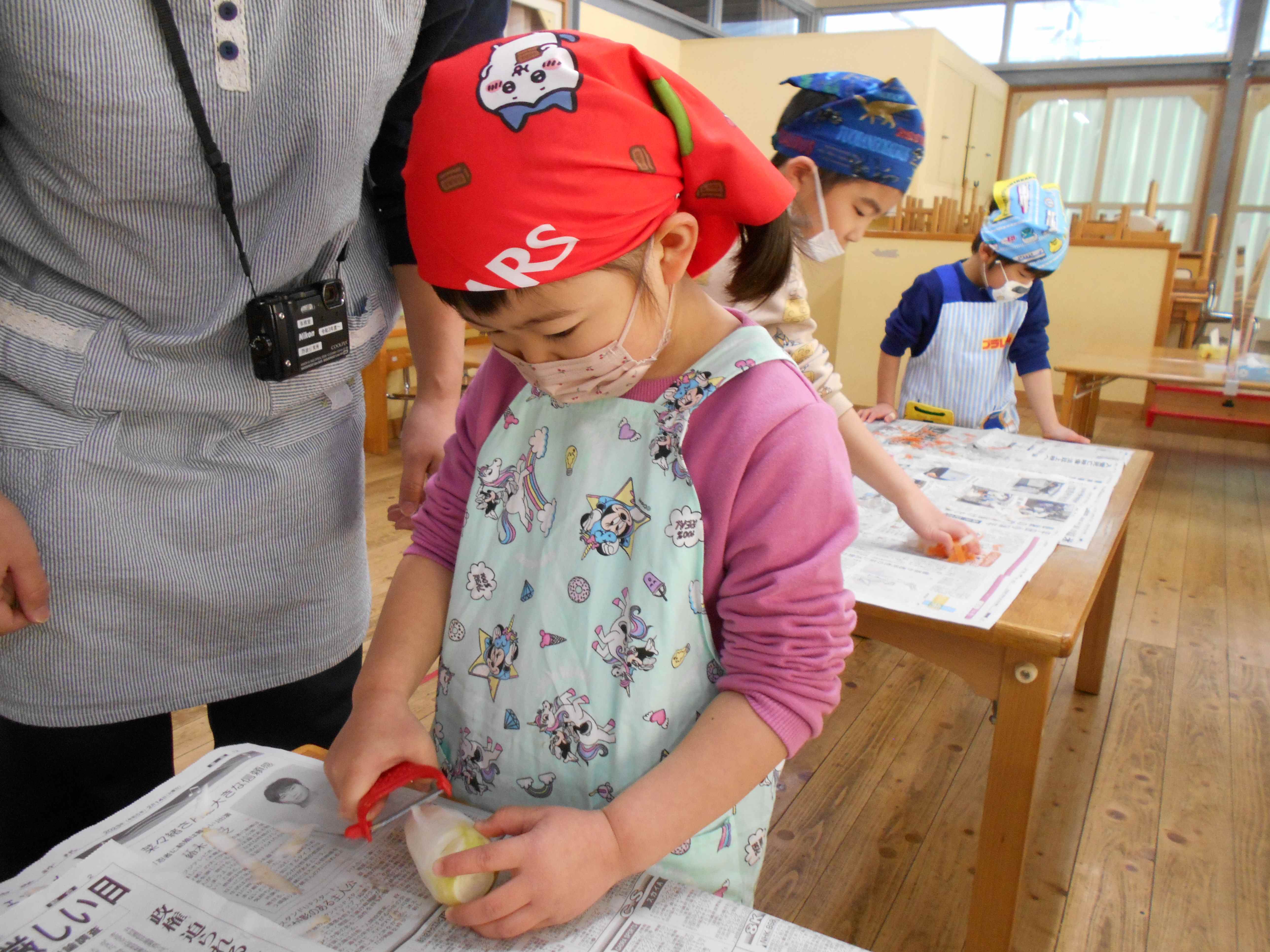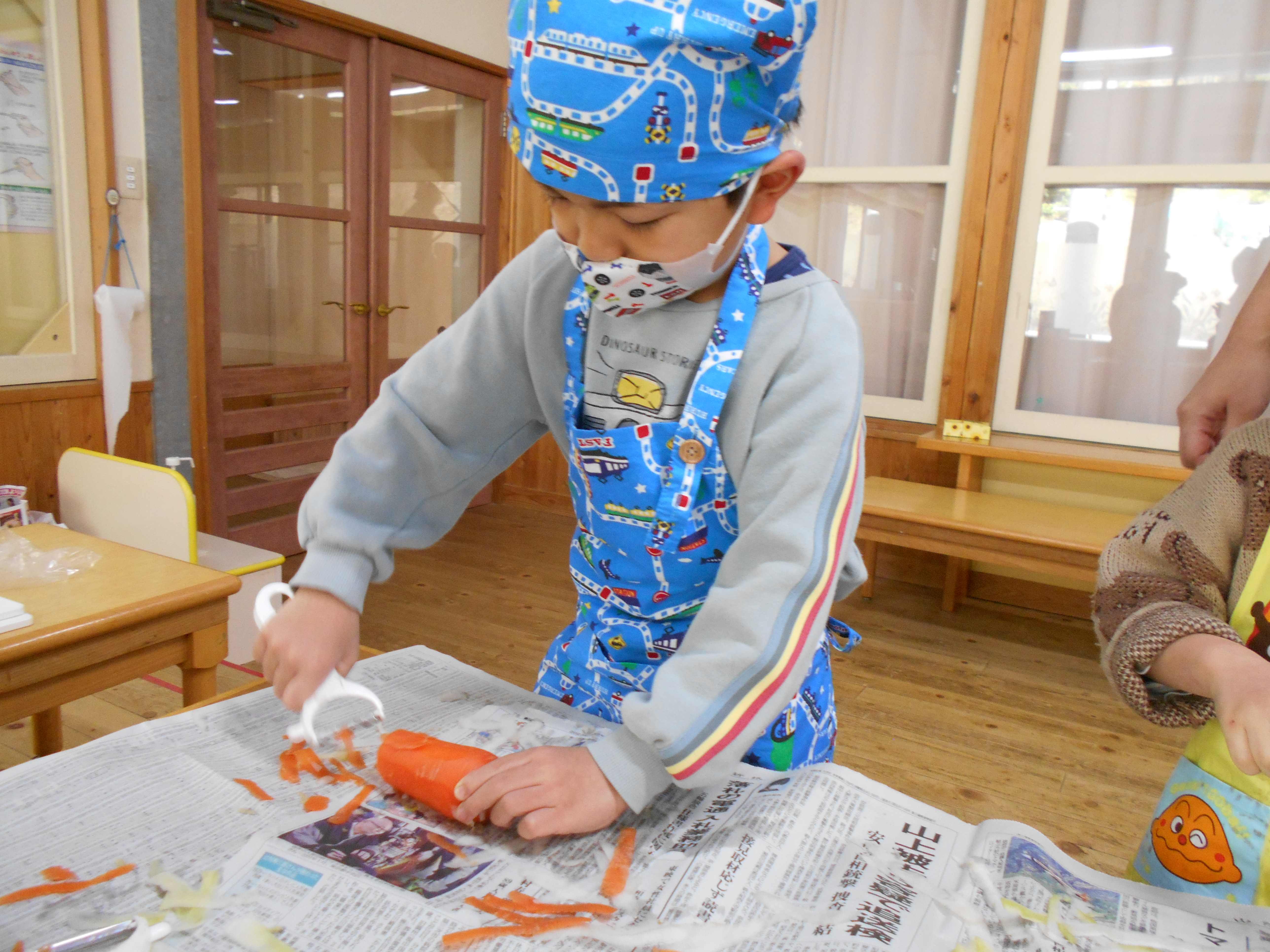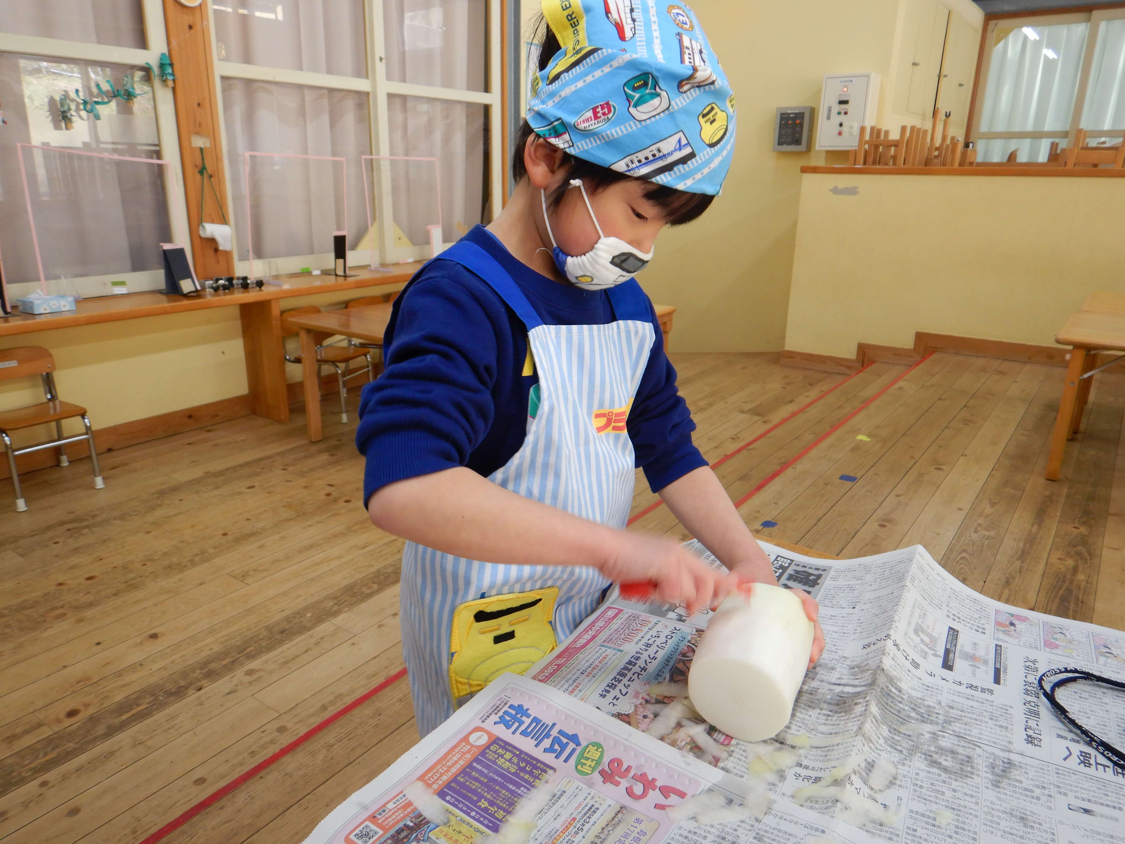 ピーラーを使った皮むき。 保育所で育てた大根も使いました。