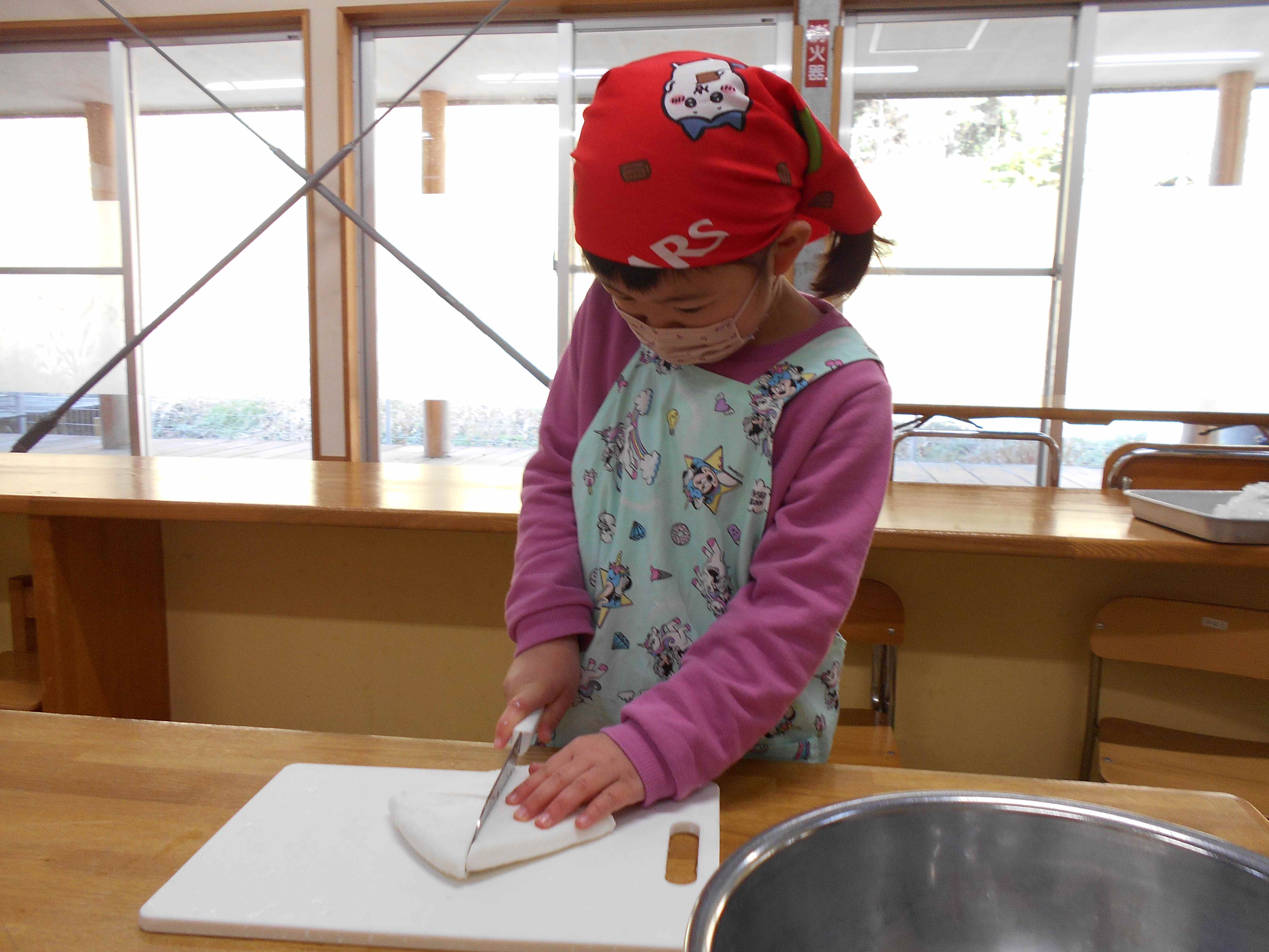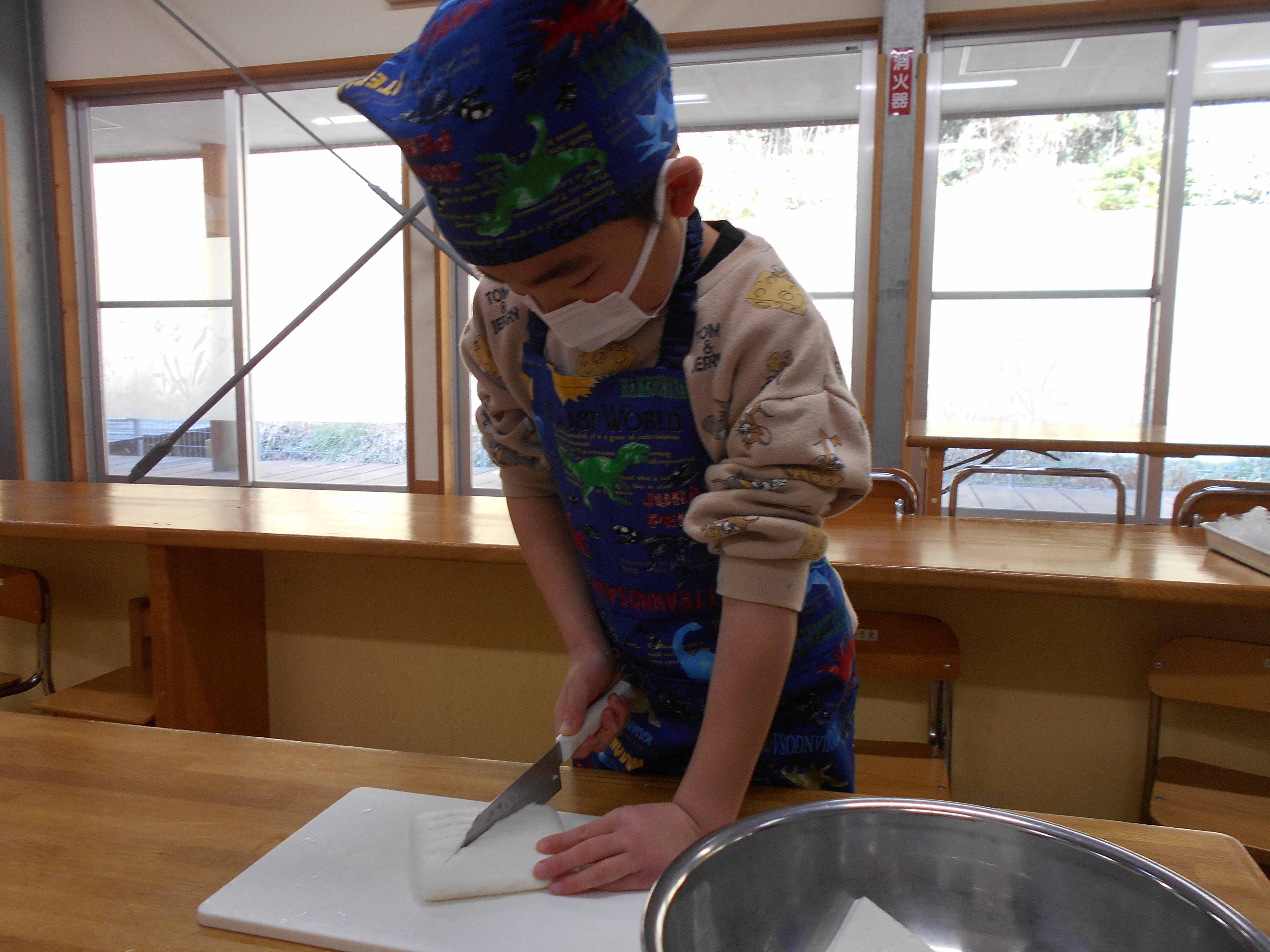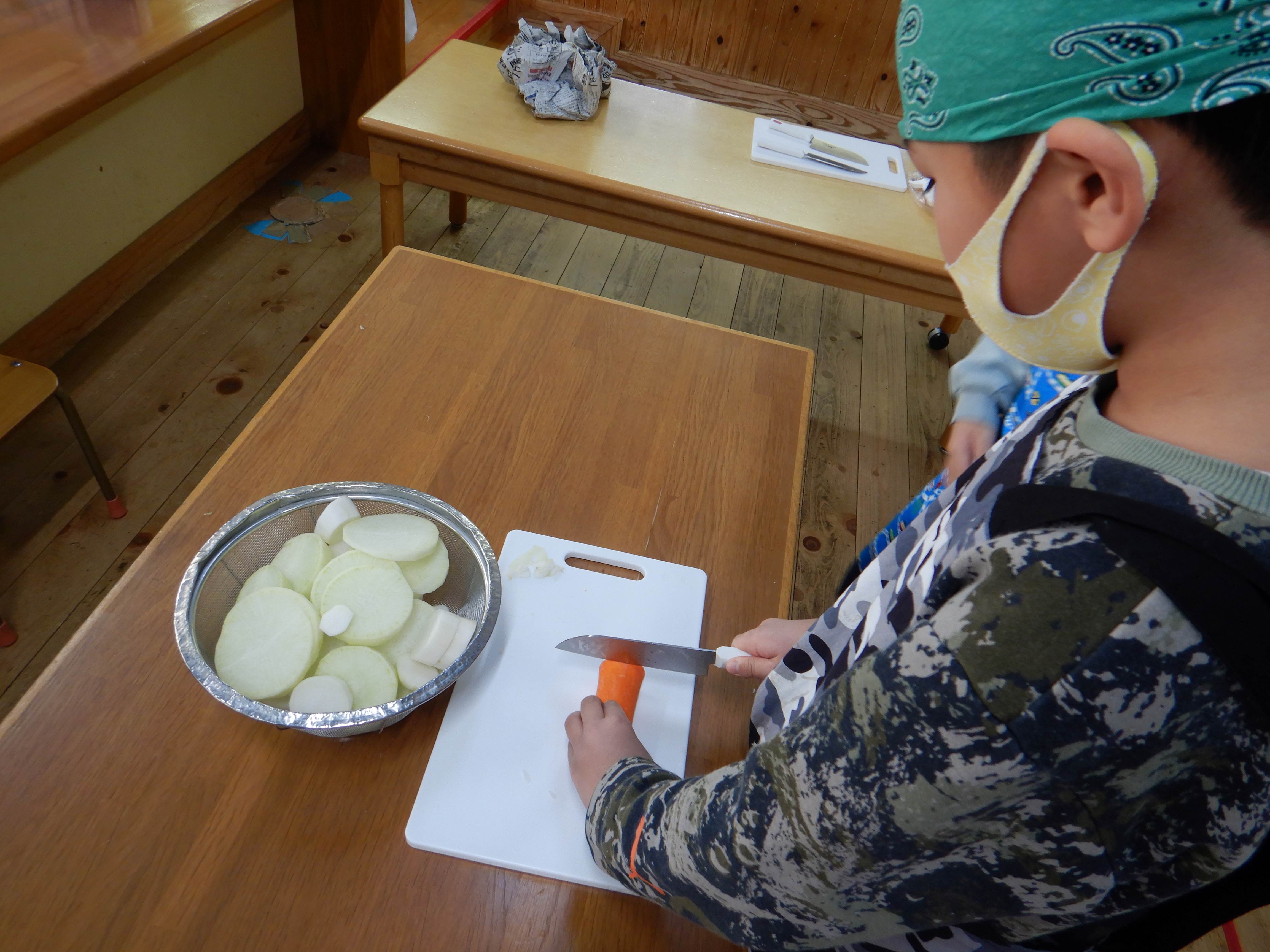 しっかりと野菜を押さえ、上手に切っていました。