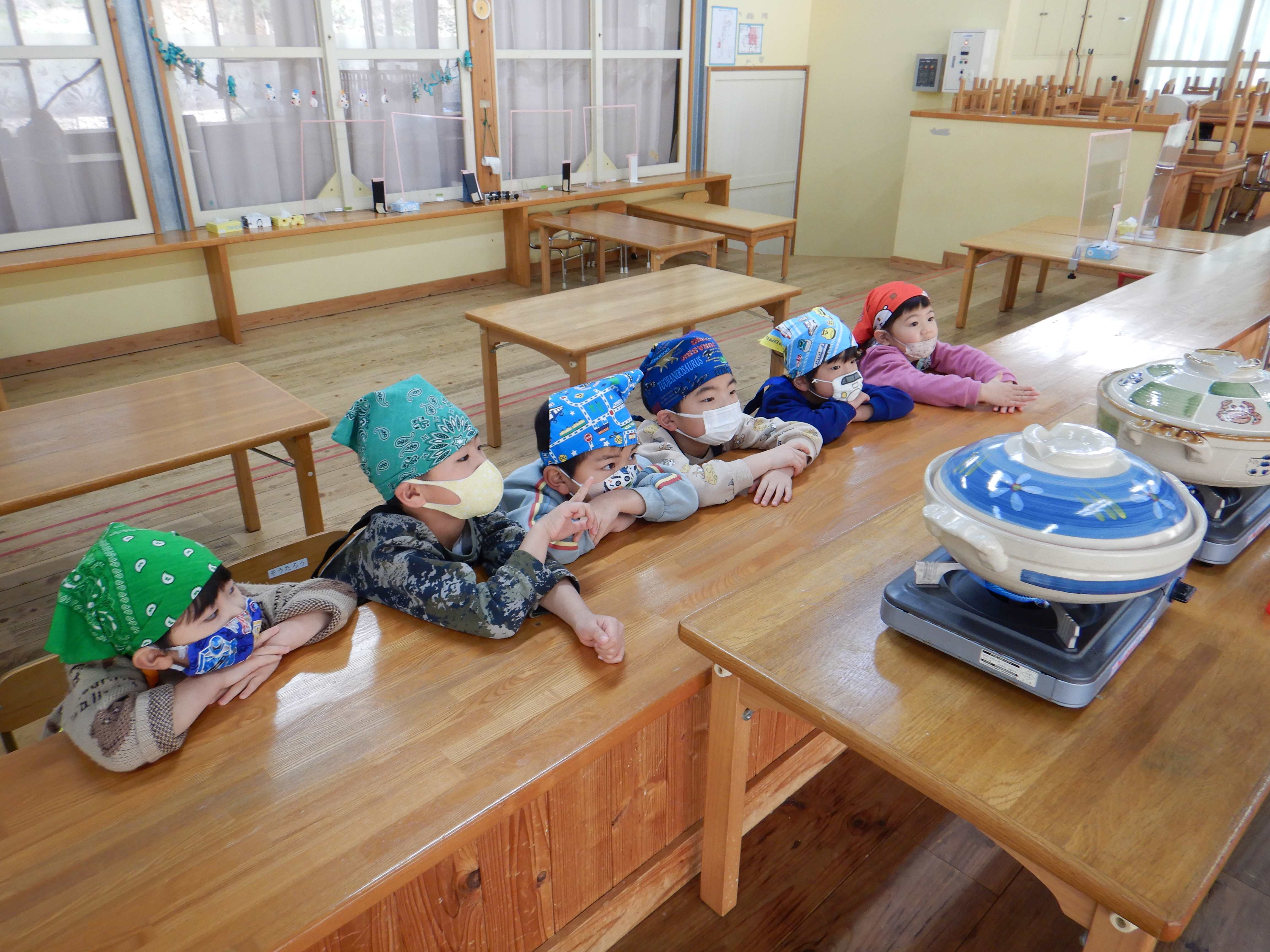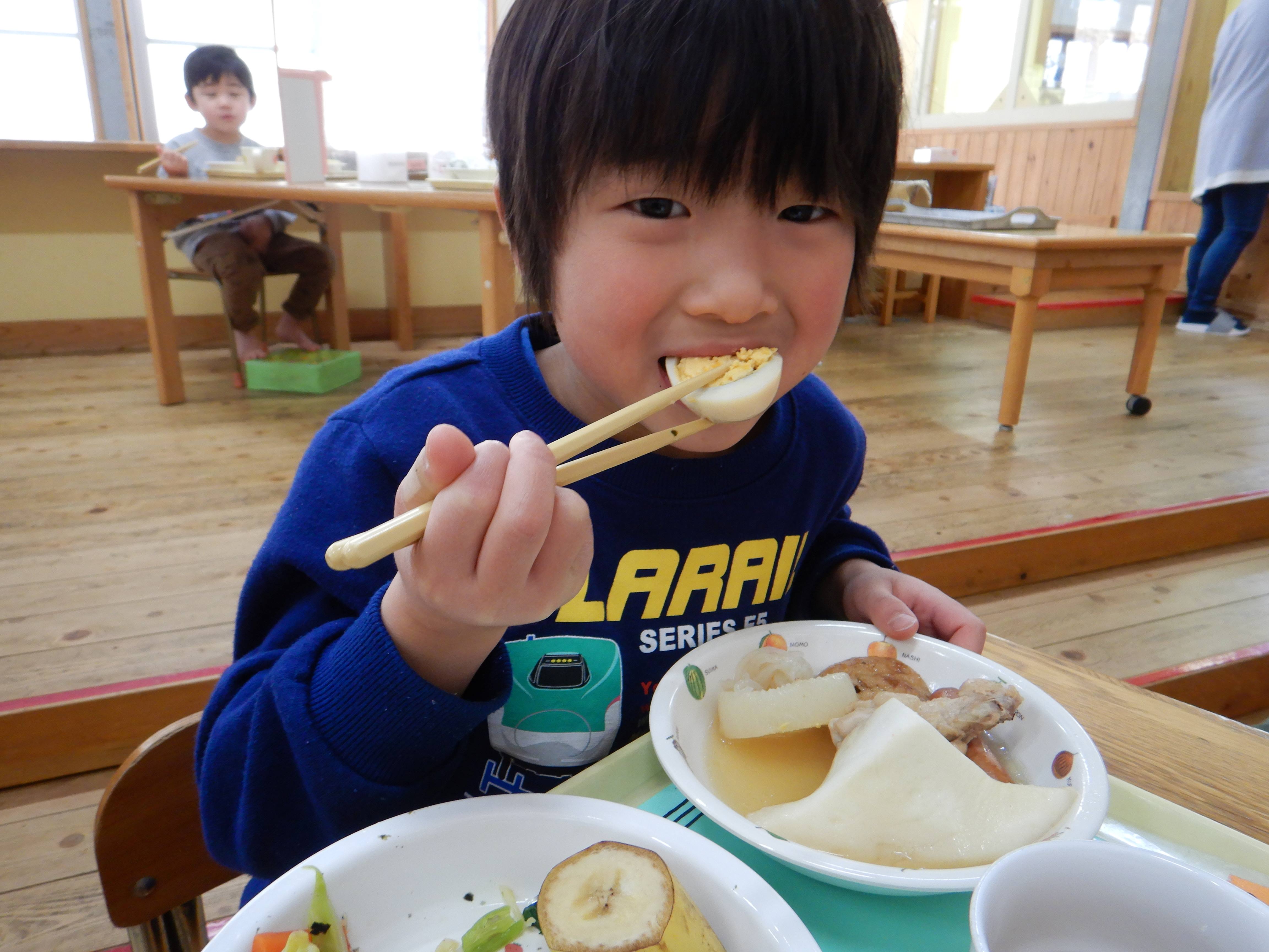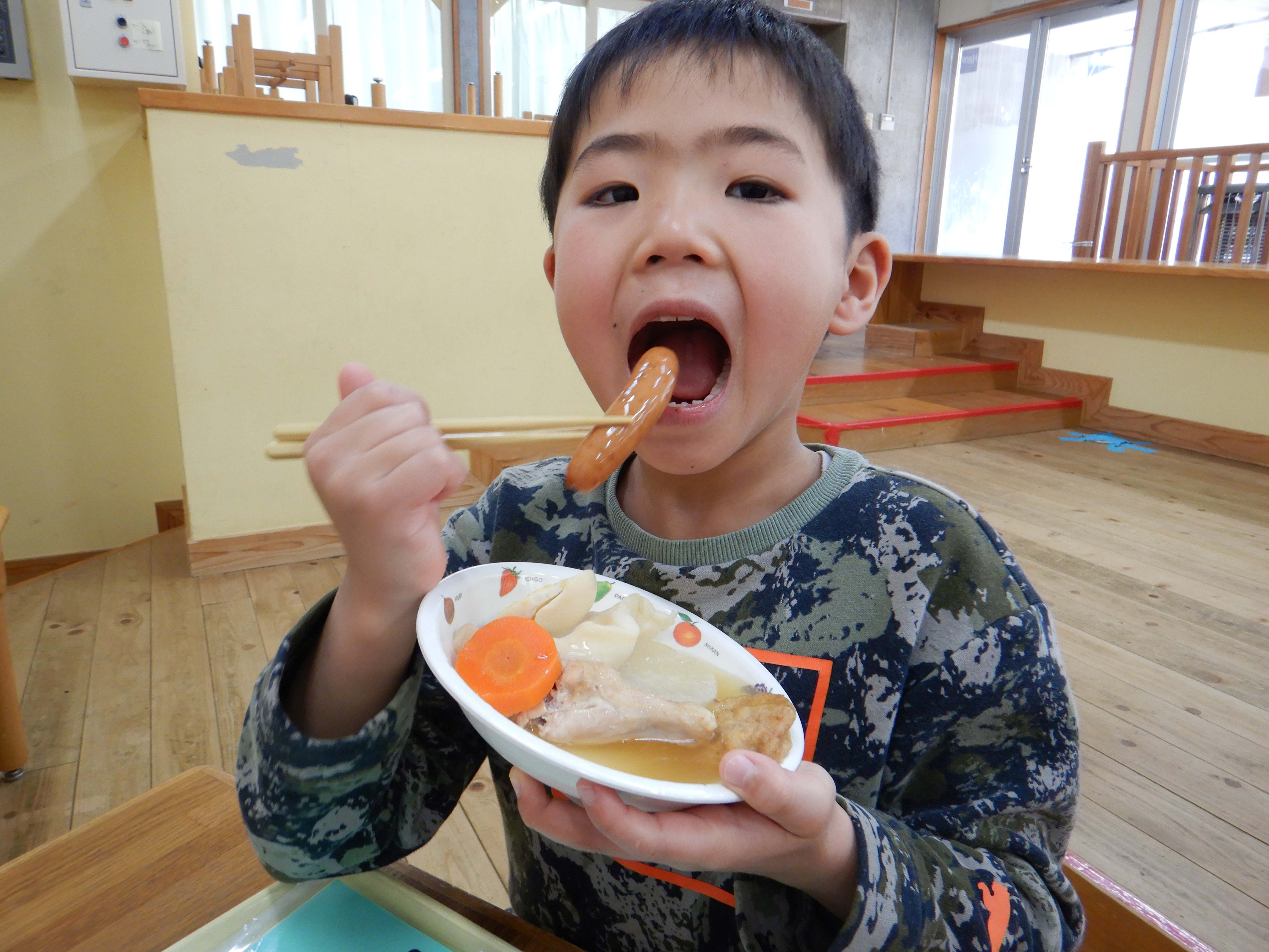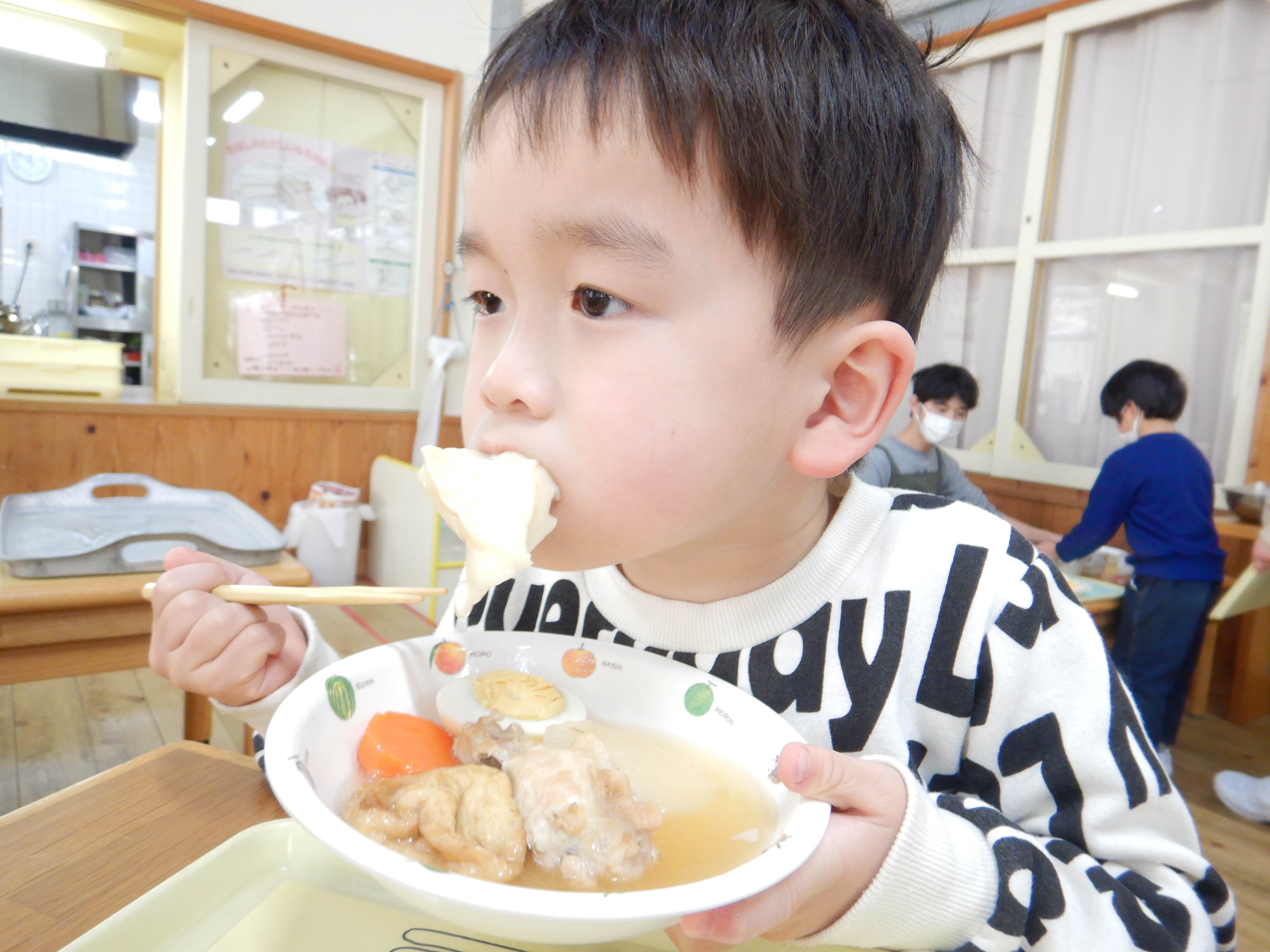 今日は楽しみにしていたおでんクッキングの日です。エプロンと三角巾を身につけ、「おいしいおでんをつくるぞー!」と意気込む子ども達でした。ピーラーや包丁を使う場面では、指を切らないように気を付けていました。卵の殻むきはとても上手で、2個をアッという間に綺麗にむいていました。自分たちが切った食材と、給食室で茹でてもらった食材を土鍋に盛り付け、出汁を入れて火にかけると、「なんだかいいにおいがしてきた」「はやくたべたい!」と出来上がりを楽しみにしていました。鍋がぐつぐつしてきた時にふたを開けると、湯気の向こうに美味しそうなおでんが出来上がっており、子ども達は「わぁー!」と歓声を上げていました。給食の時間に皆で食べると、「これ、ぼくがかったウインナーだよ」「はんぺんがおっきくなってる、なんで?」と大喜びでした。他のクラスの子ども達や先生達からも「おいしかったよ」「ありがとう」と言ってもらい、とても嬉しそうでした。