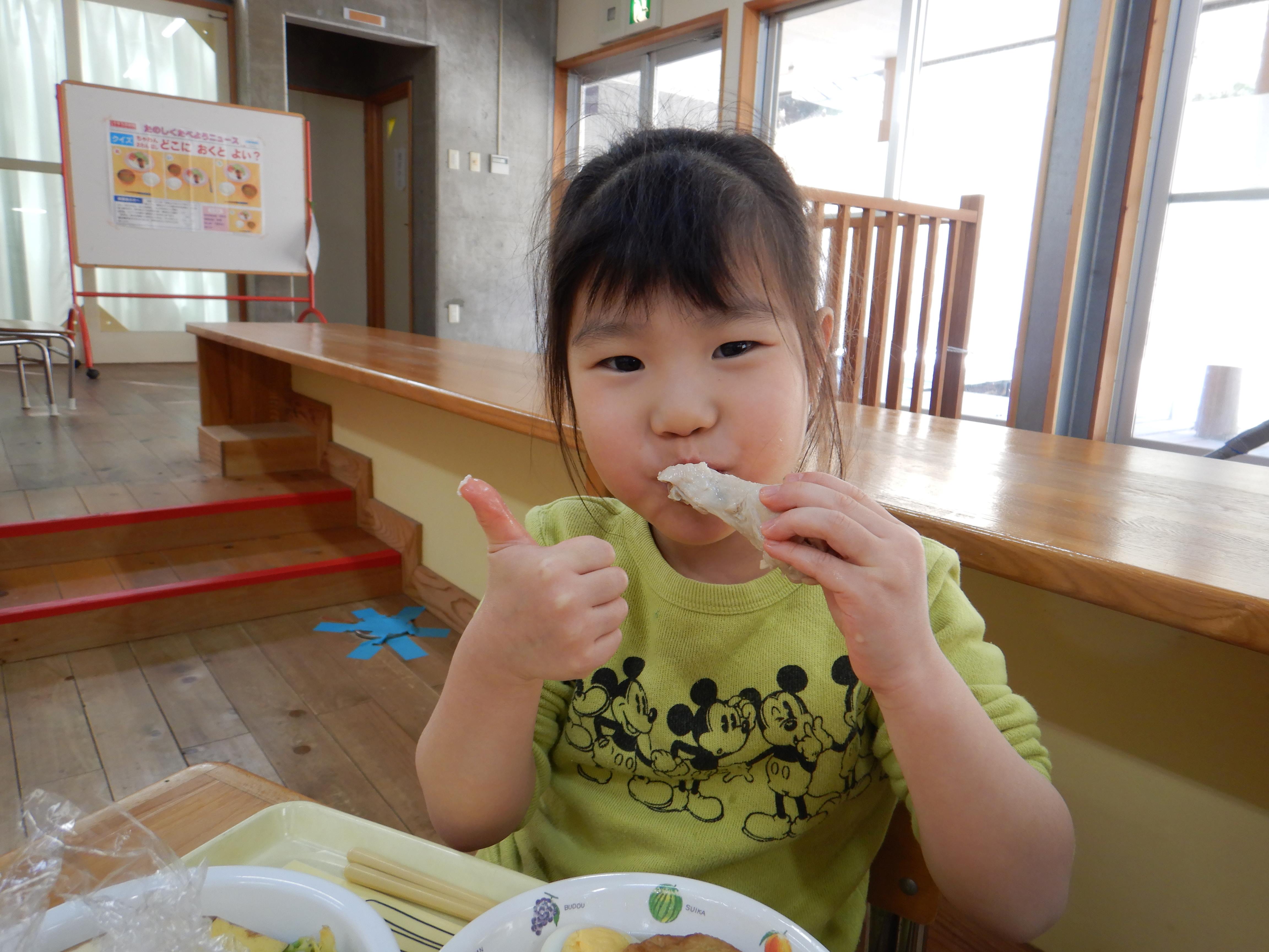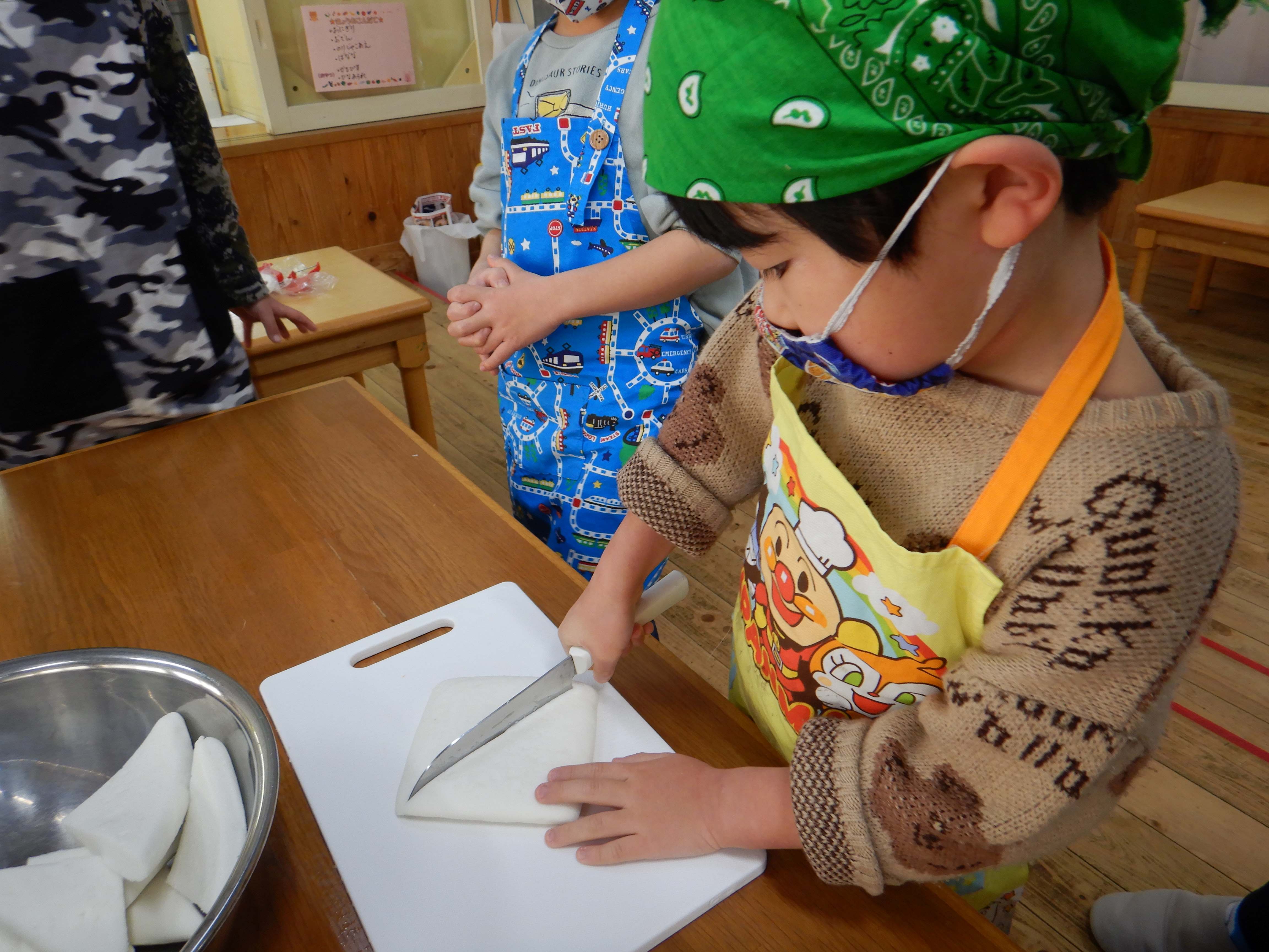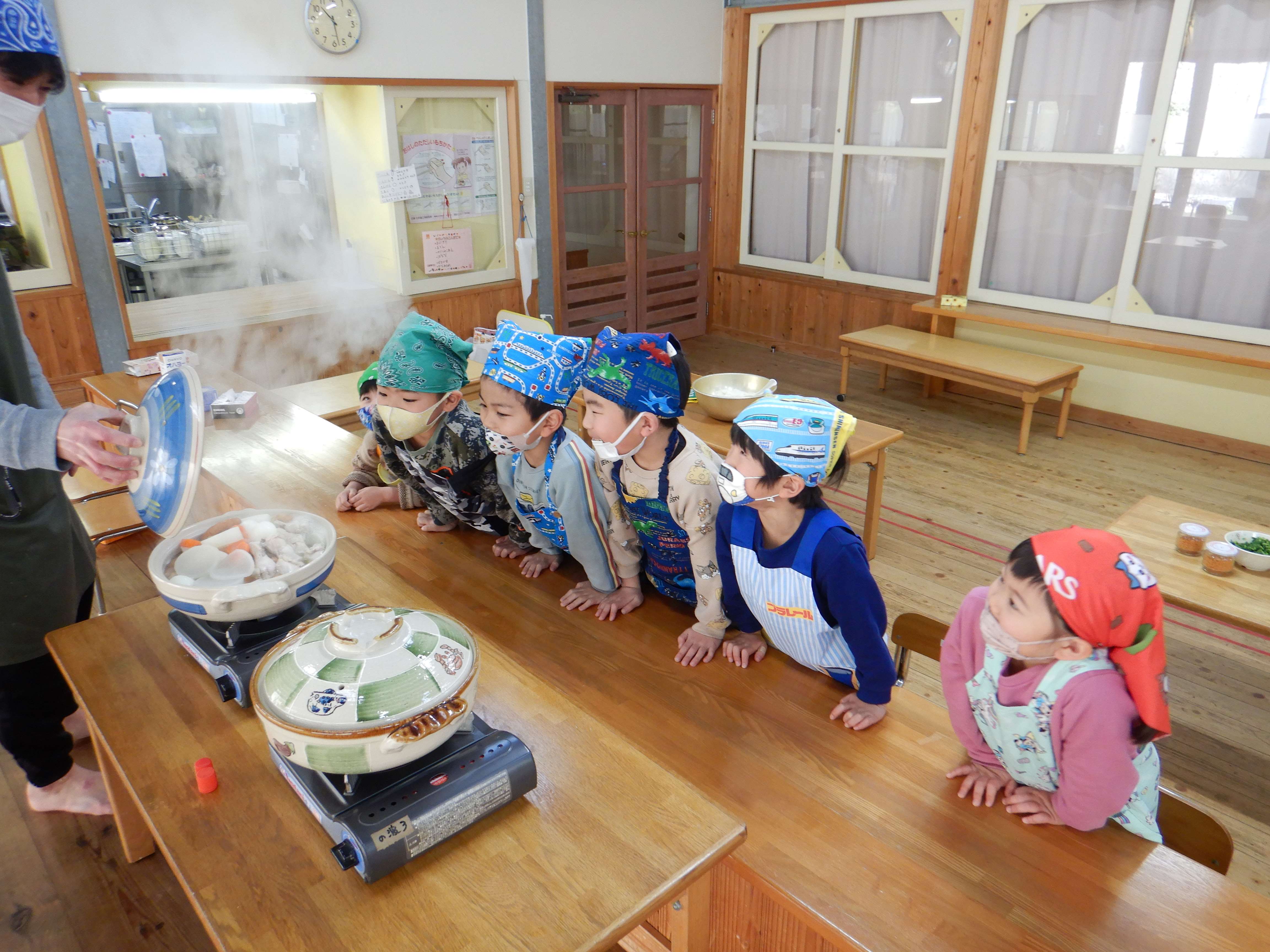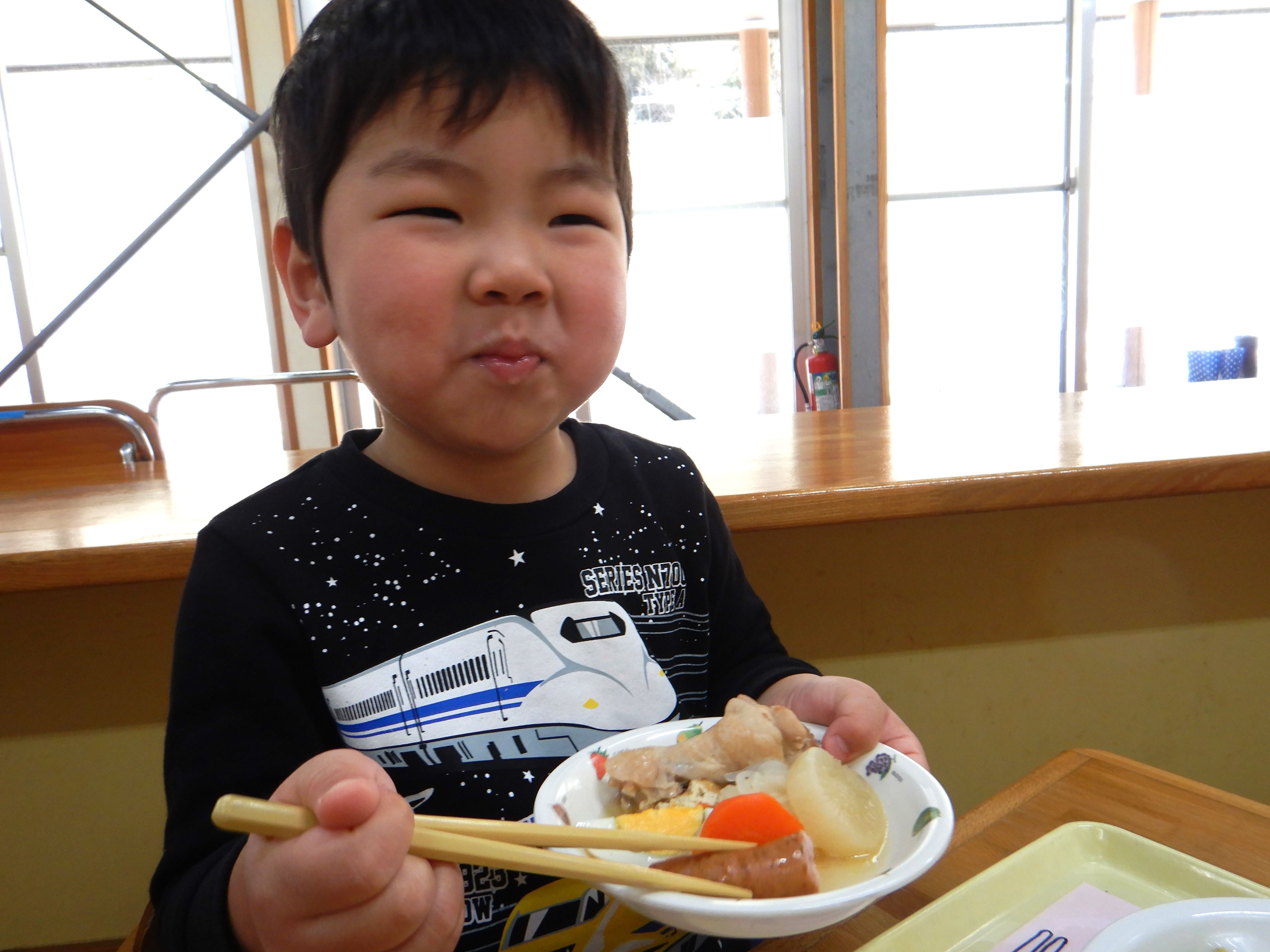 今日は楽しみにしていたおでんクッキングの日です。エプロンと三角巾を身につけ、「おいしいおでんをつくるぞー!」と意気込む子ども達でした。ピーラーや包丁を使う場面では、指を切らないように気を付けていました。卵の殻むきはとても上手で、2個をアッという間に綺麗にむいていました。自分たちが切った食材と、給食室で茹でてもらった食材を土鍋に盛り付け、出汁を入れて火にかけると、「なんだかいいにおいがしてきた」「はやくたべたい!」と出来上がりを楽しみにしていました。鍋がぐつぐつしてきた時にふたを開けると、湯気の向こうに美味しそうなおでんが出来上がっており、子ども達は「わぁー!」と歓声を上げていました。給食の時間に皆で食べると、「これ、ぼくがかったウインナーだよ」「はんぺんがおっきくなってる、なんで?」と大喜びでした。他のクラスの子ども達や先生達からも「おいしかったよ」「ありがとう」と言ってもらい、とても嬉しそうでした。