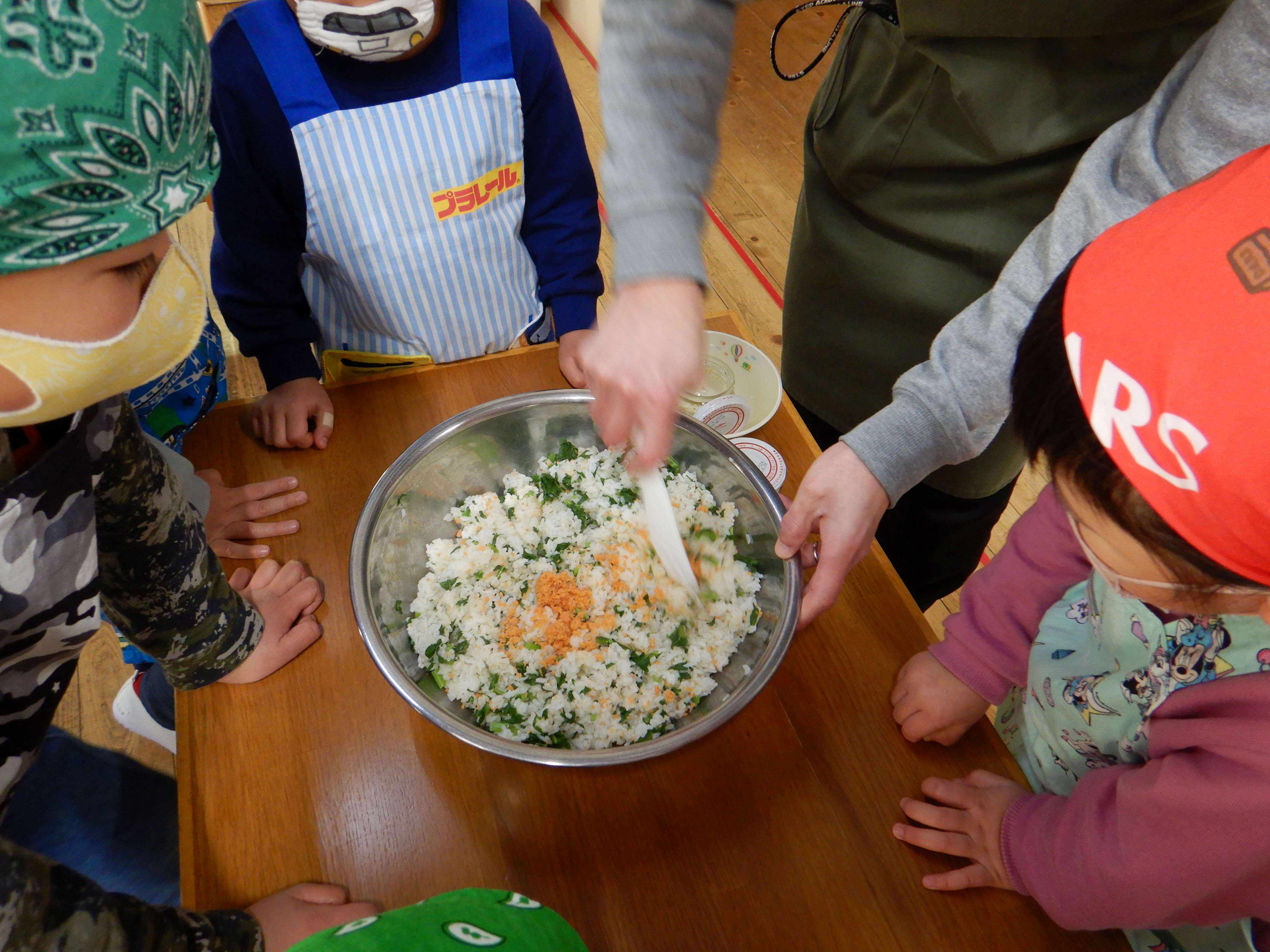 若布、大根の葉・サケフレークの2種類のおにぎりも作りました。