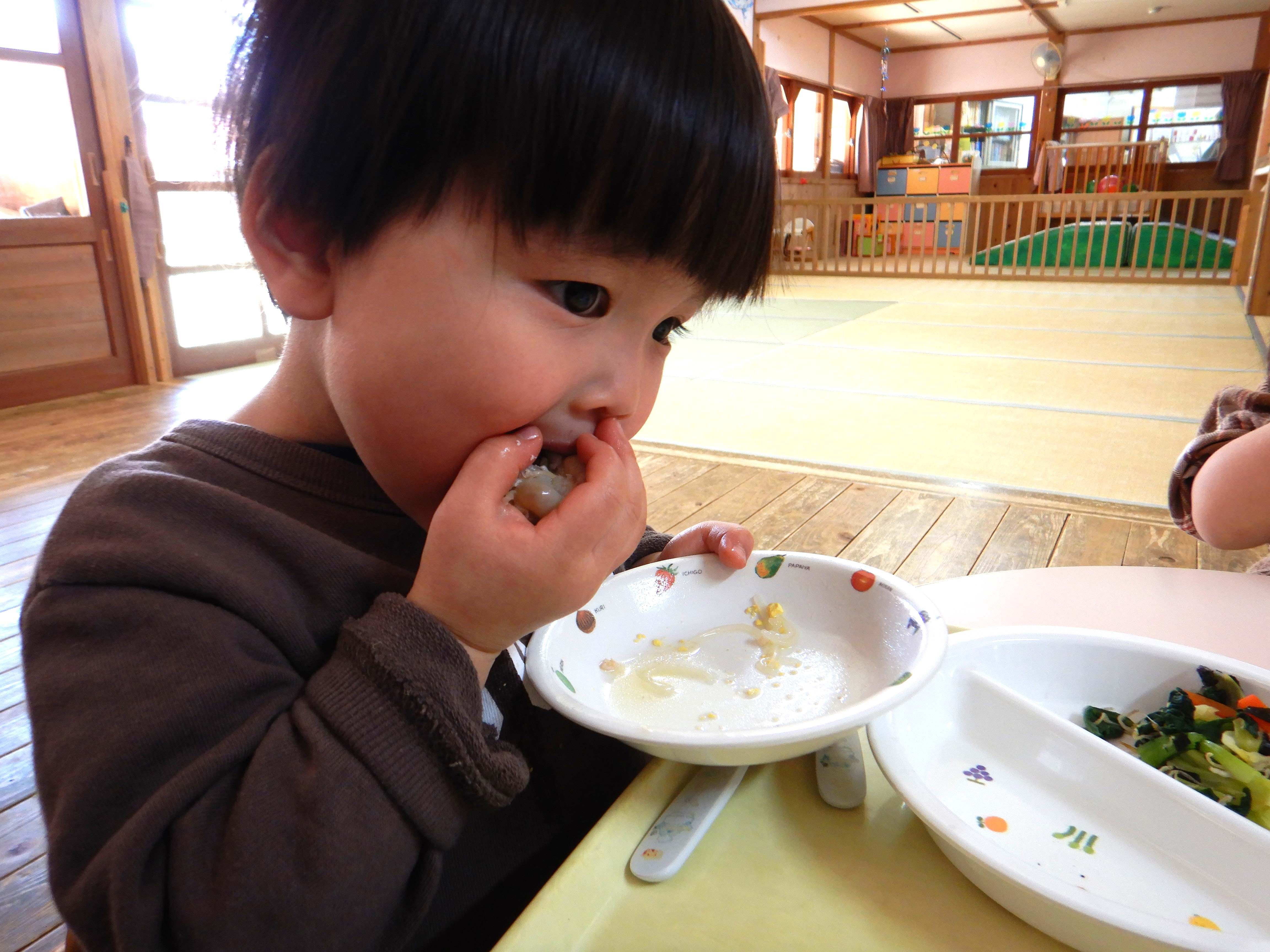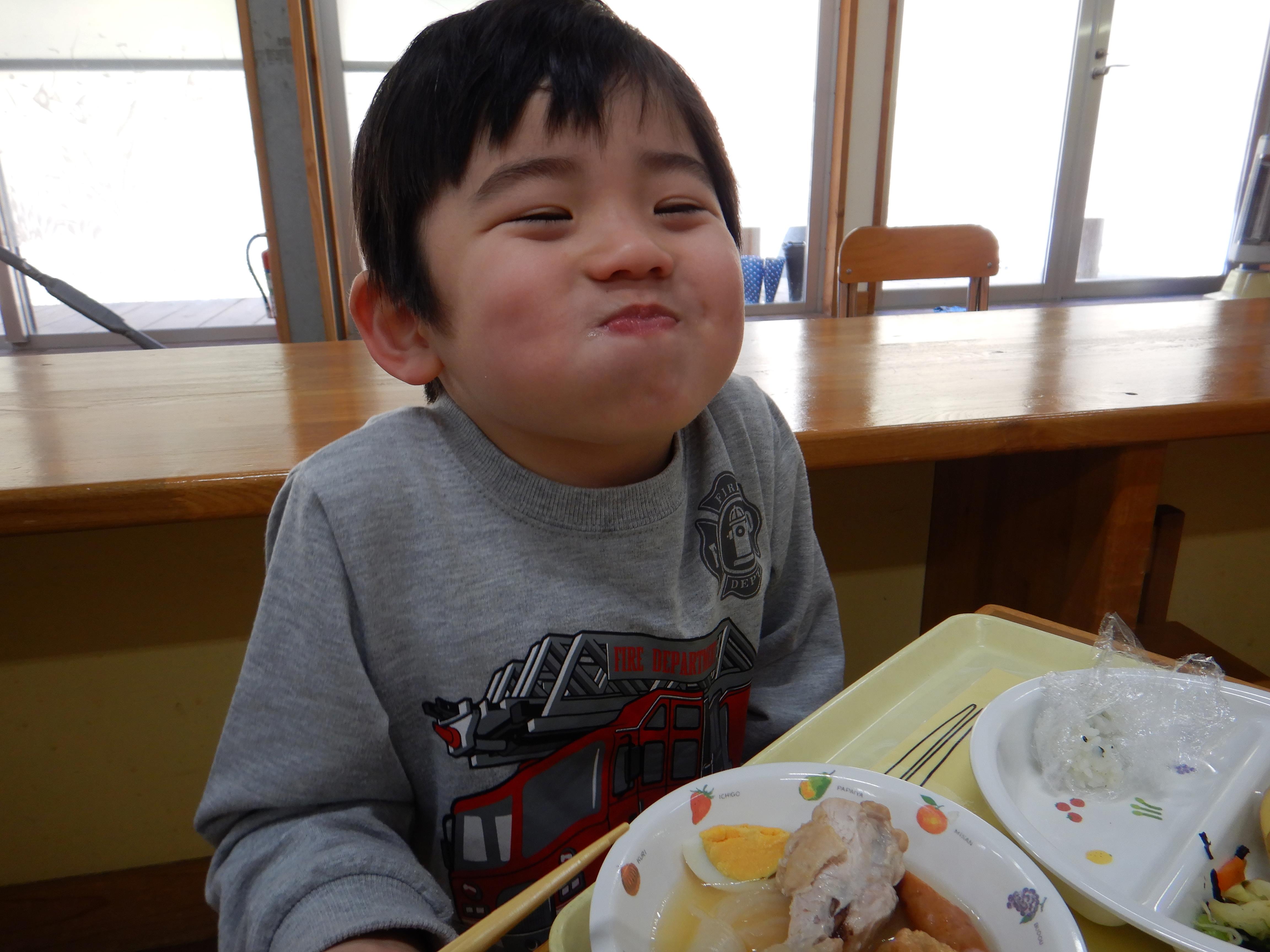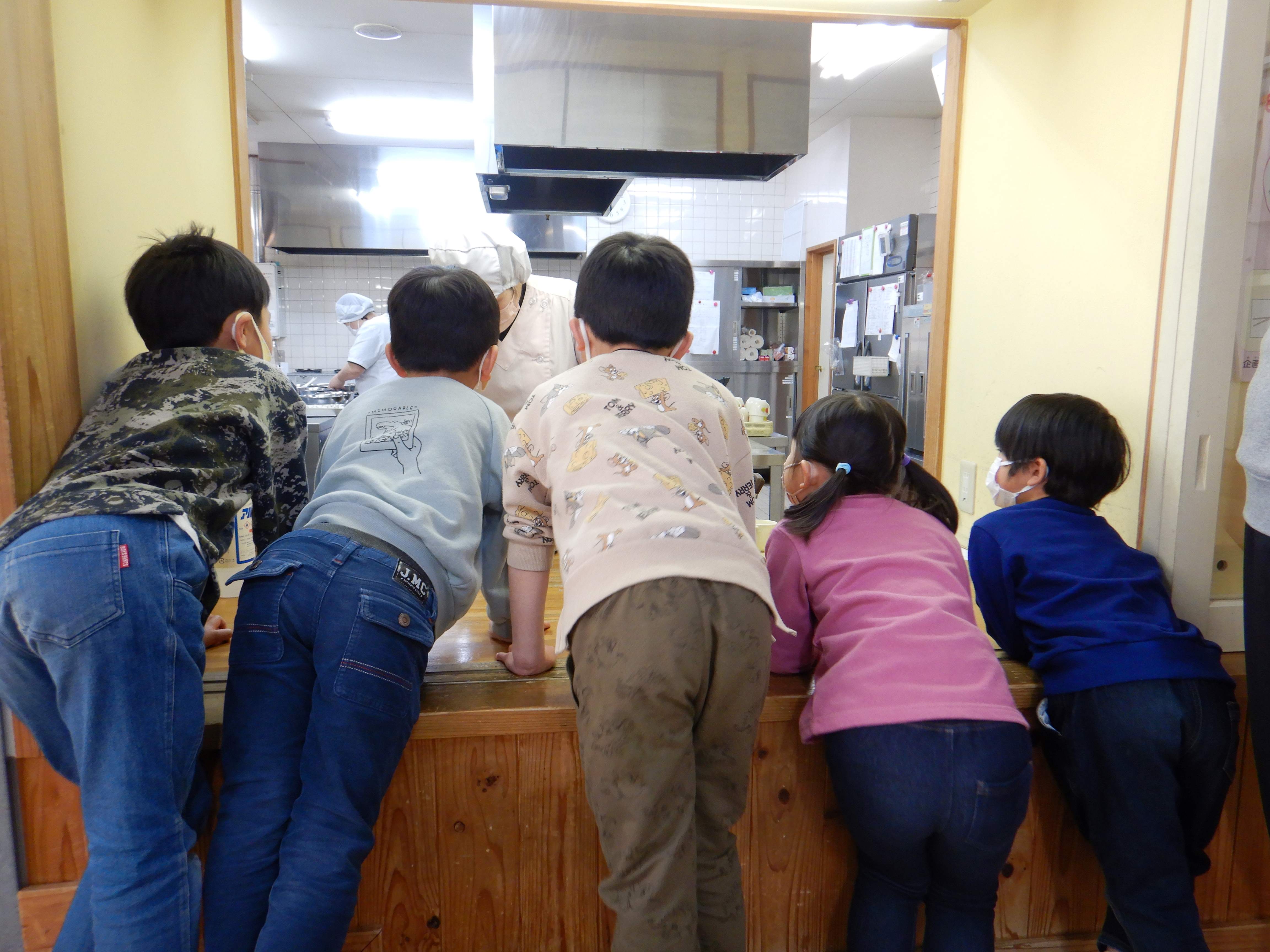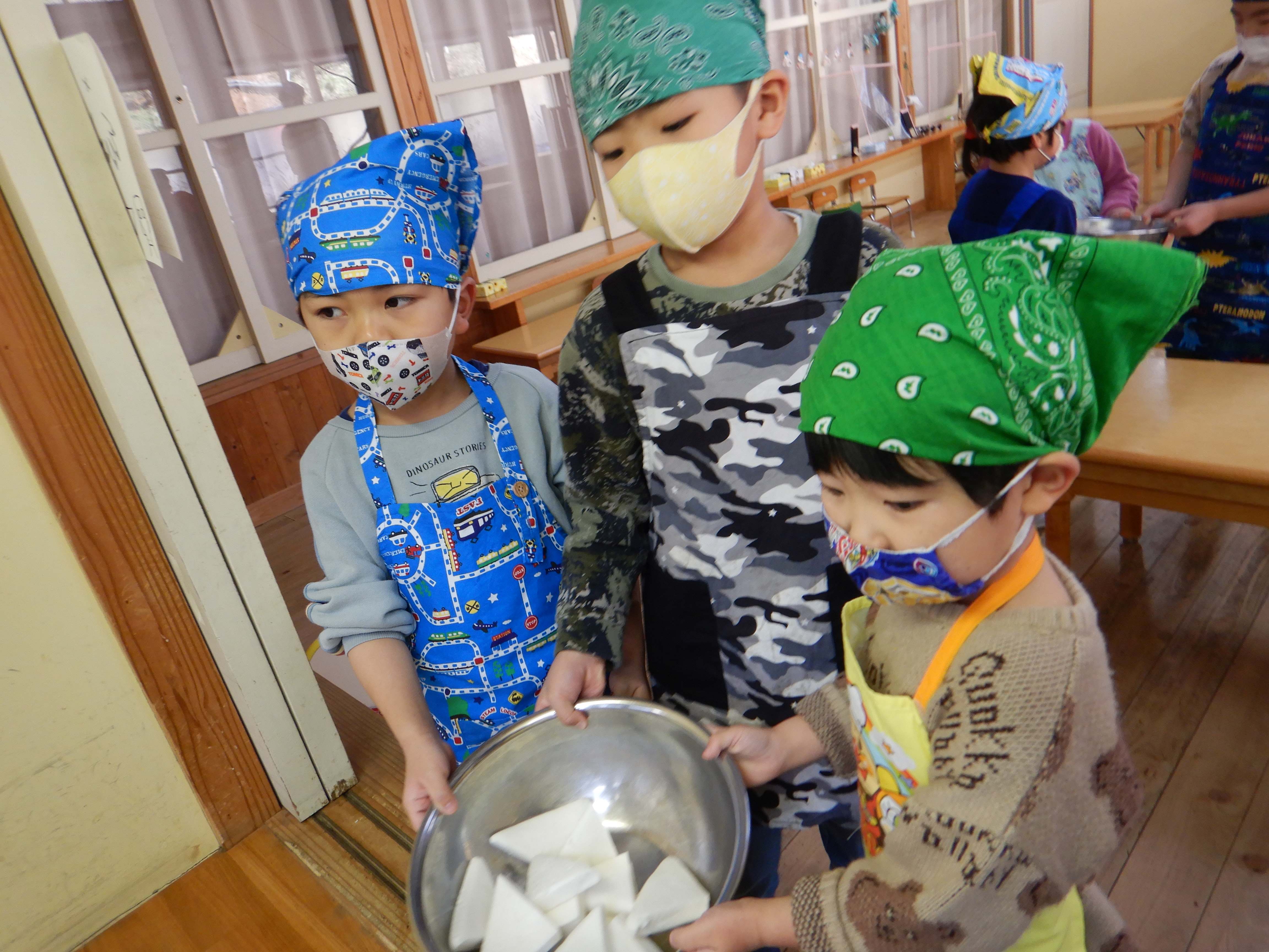 給食室で煮てもらいます。 「まだかなー」