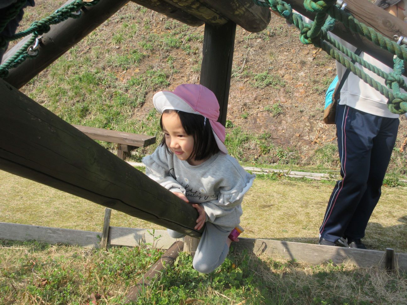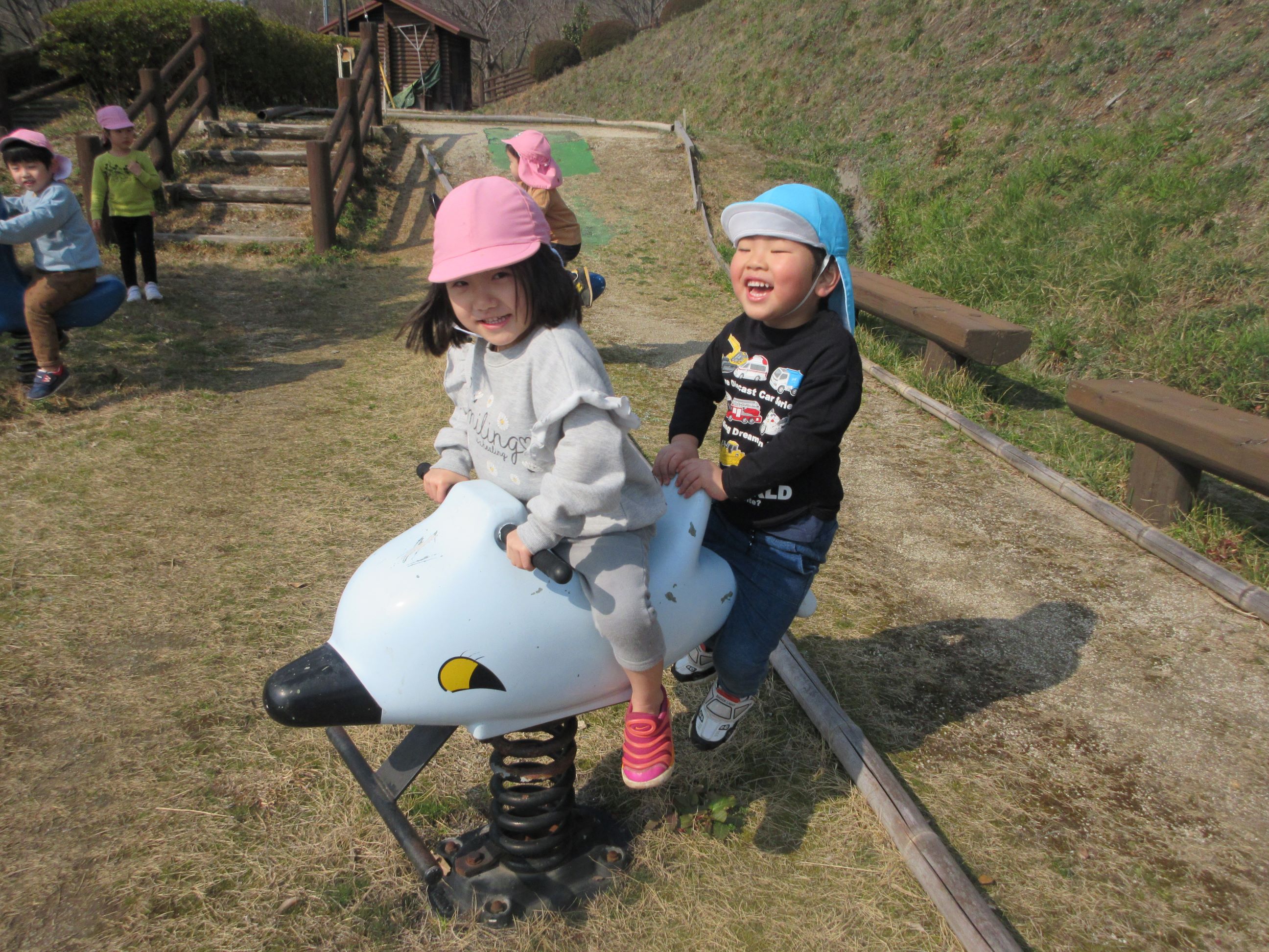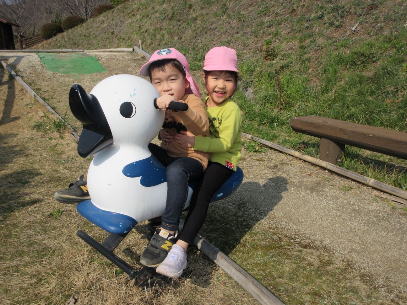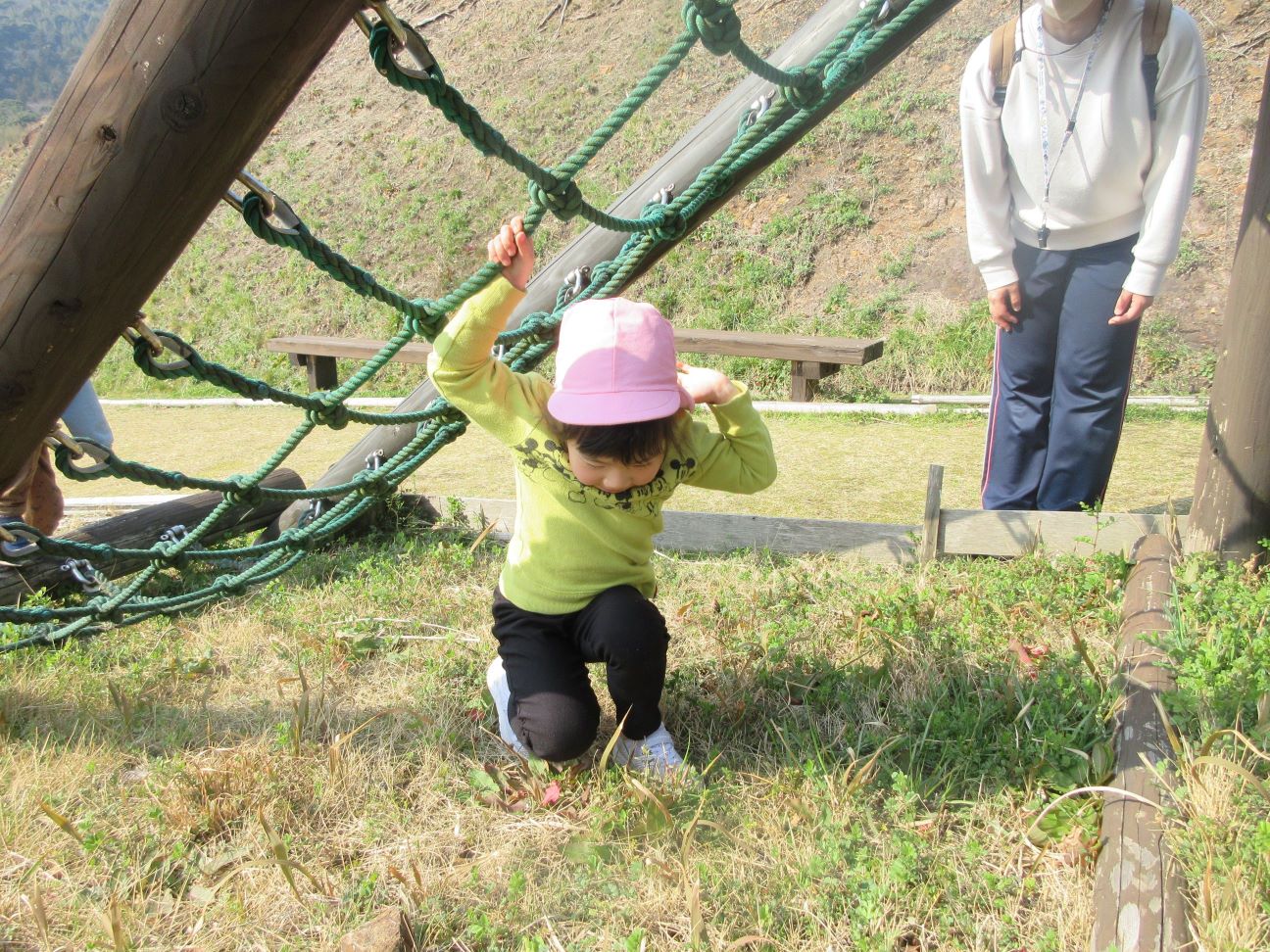 公園に着いて、ひと休みしてから遊具へ向かいました。ネットの遊具やばねのついた動物、ブランコと思い思いに楽しく遊びました。