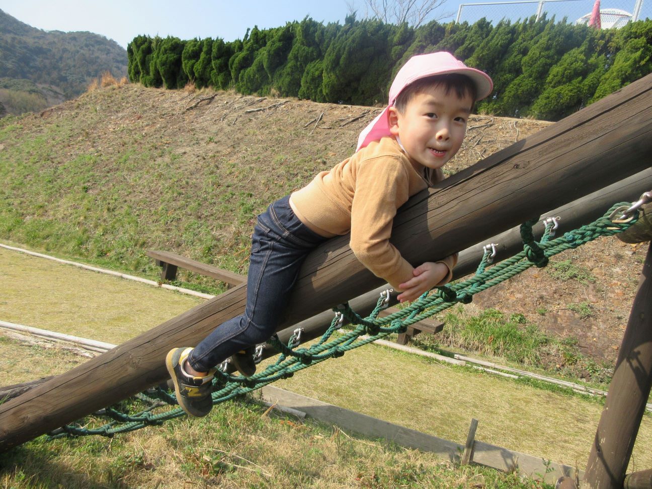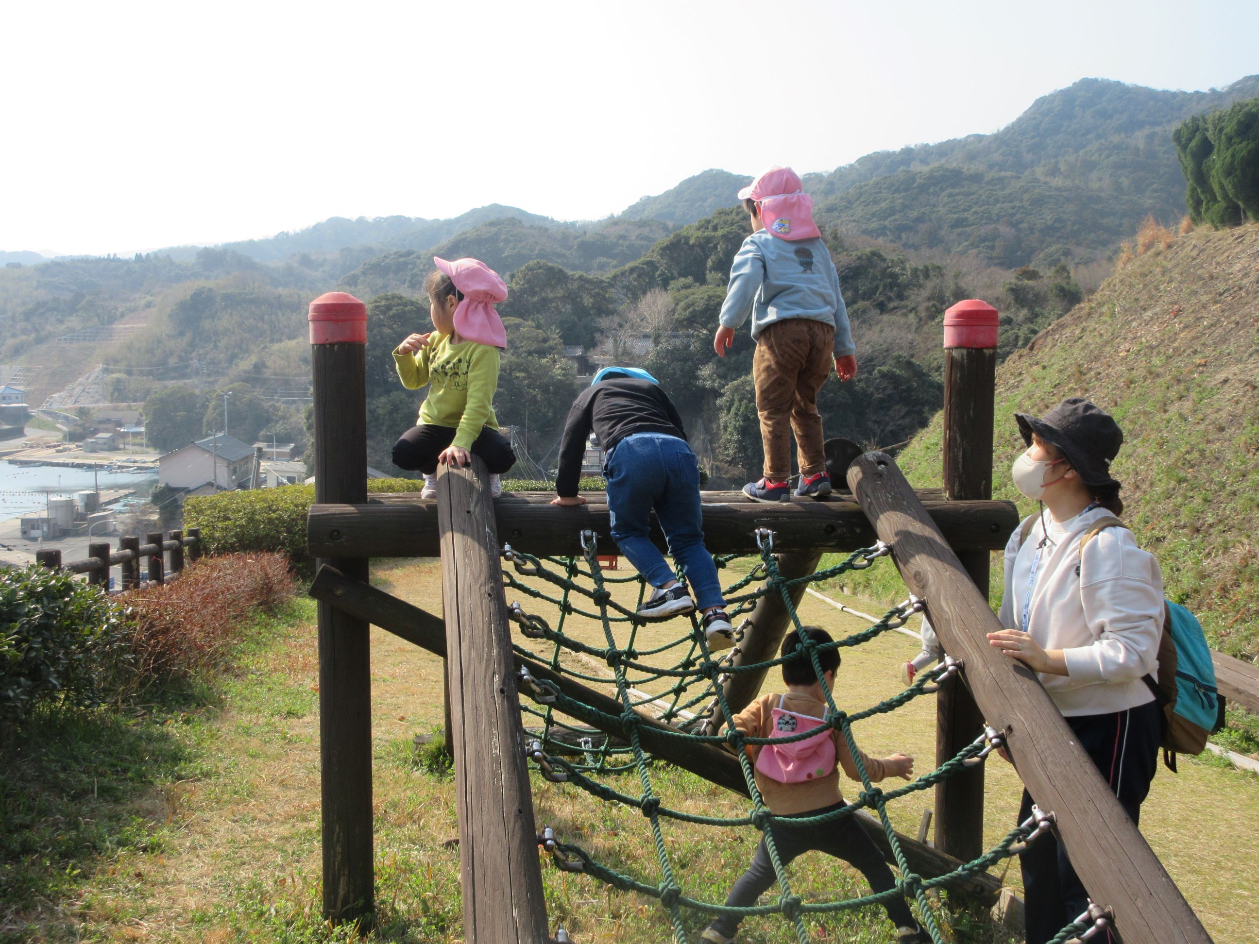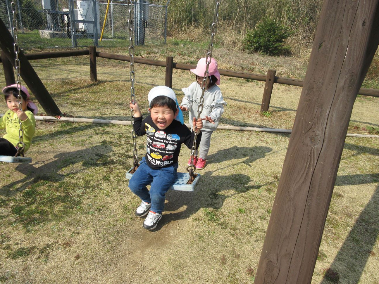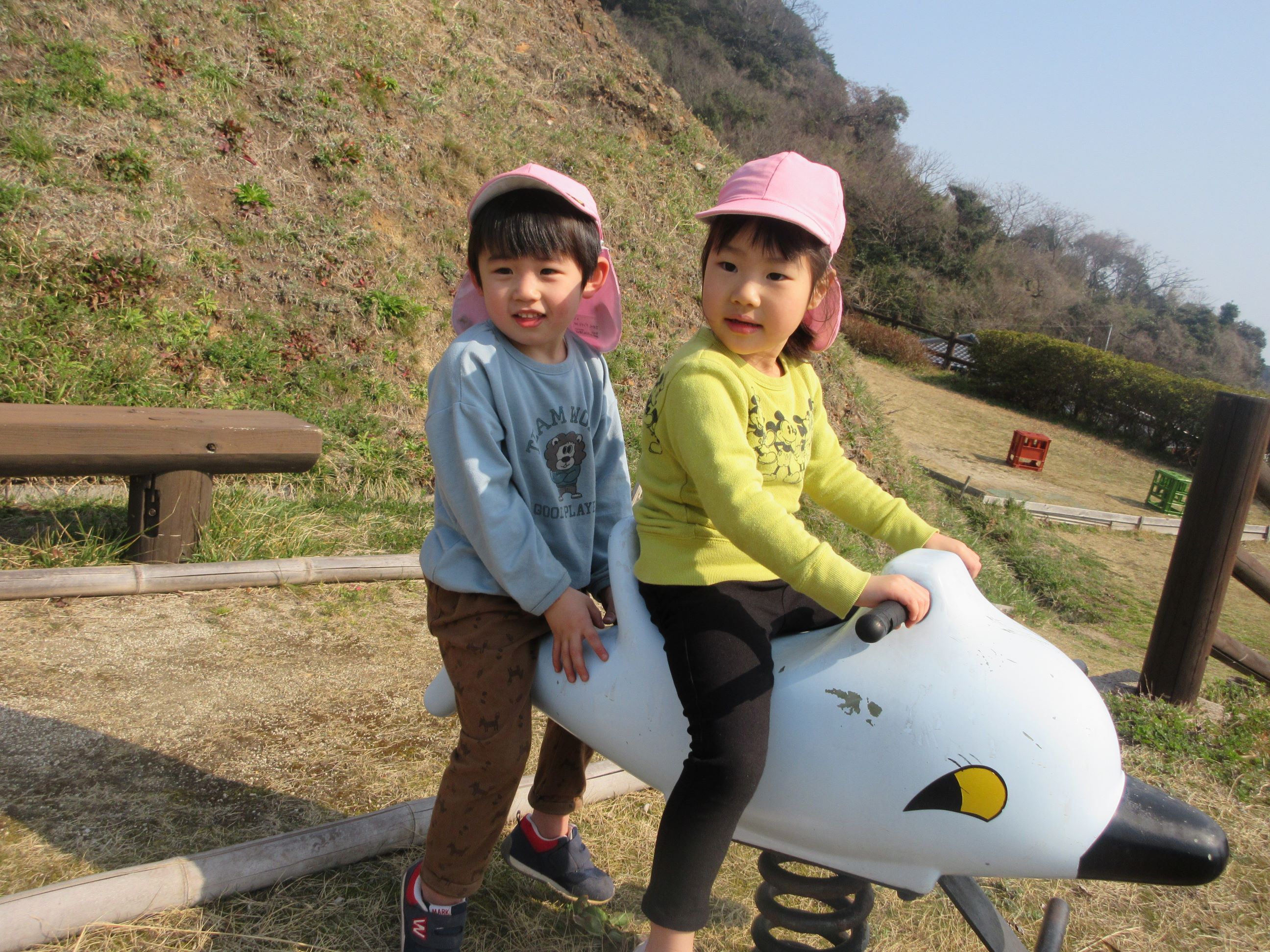 公園に着いて、ひと休みしてから遊具へ向かいました。ネットの遊具やばねのついた動物、ブランコと思い思いに楽しく遊びました。