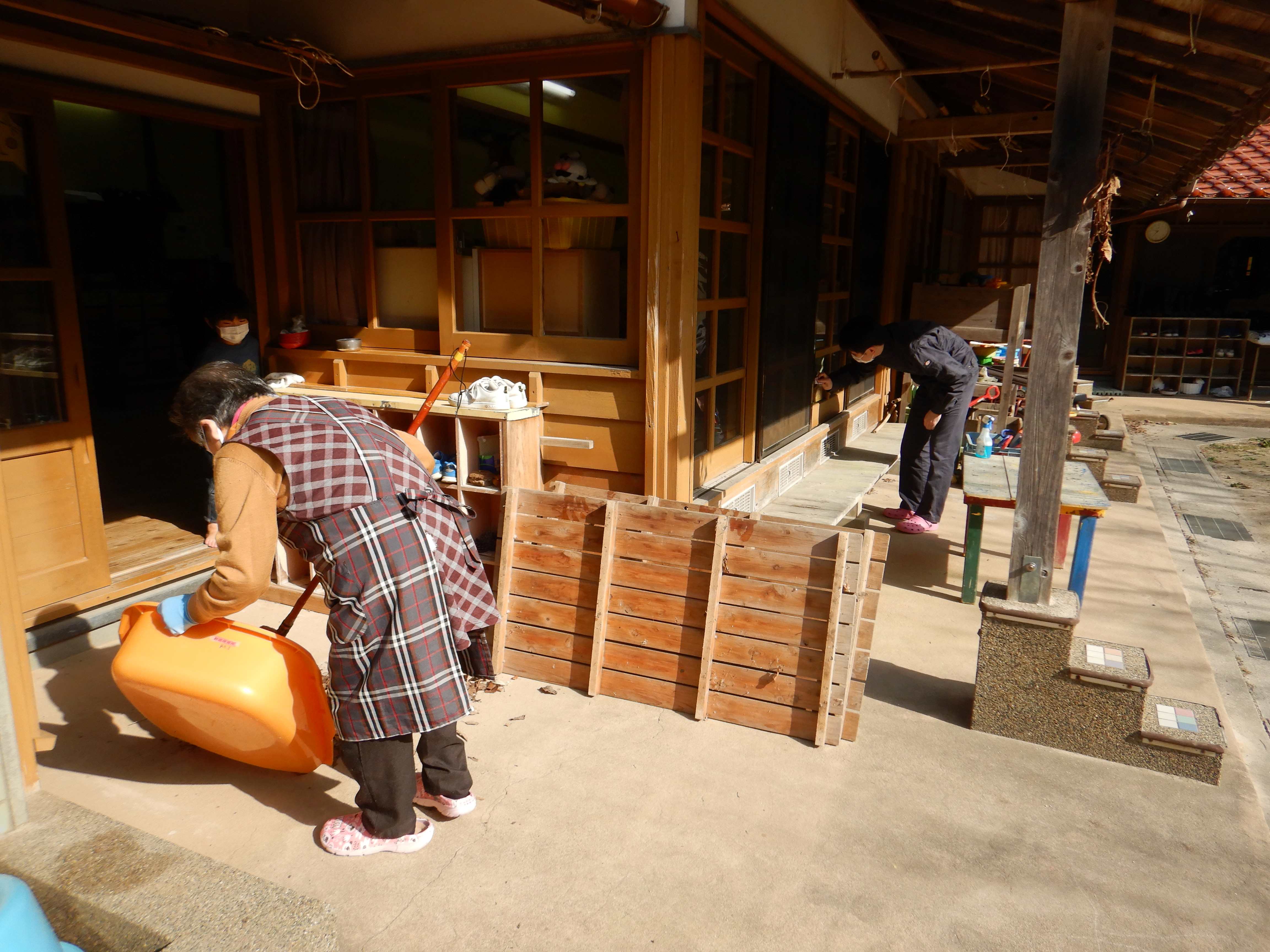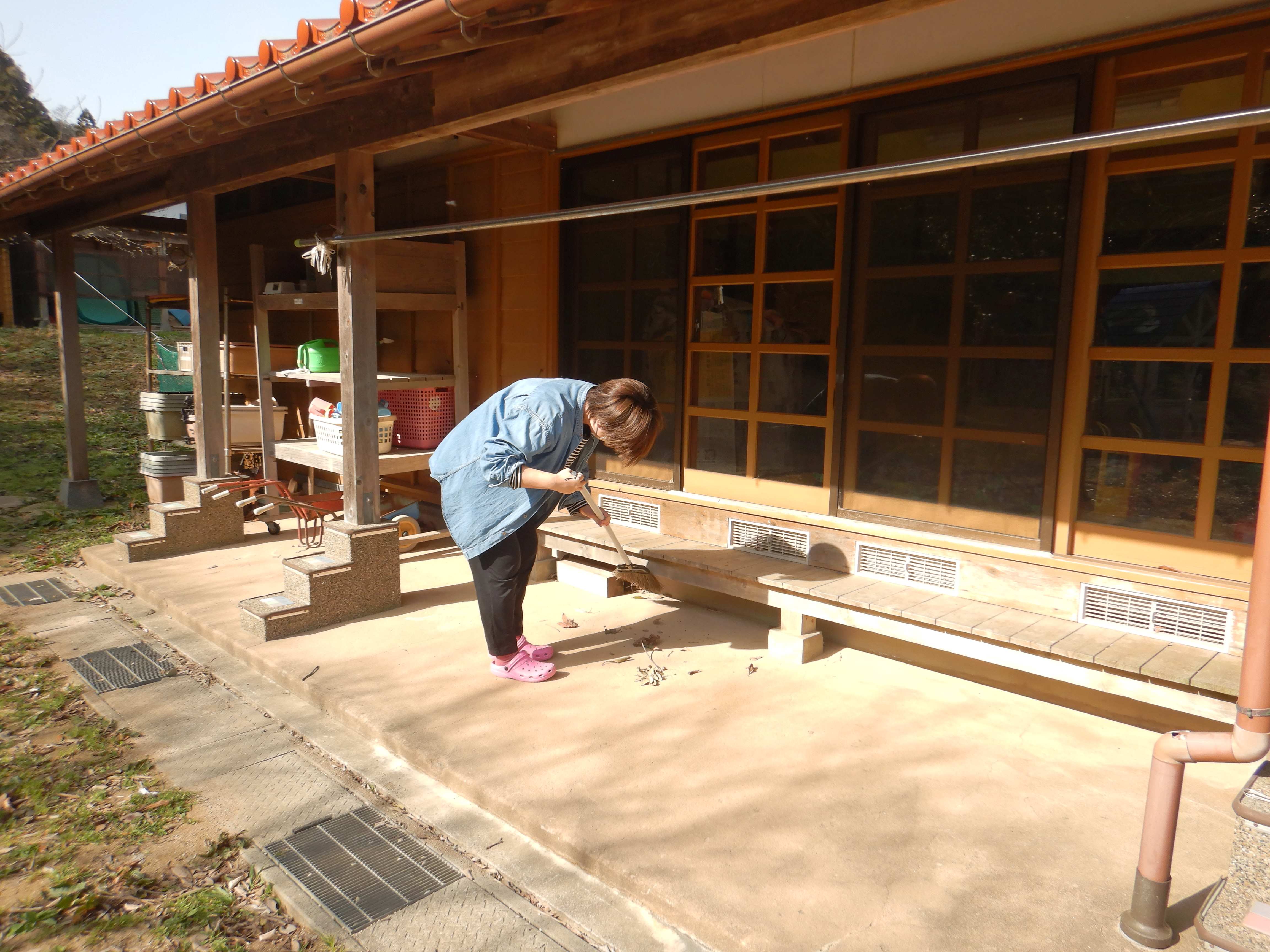 保育室だけでなく、テラス掃除もしていただきました。
