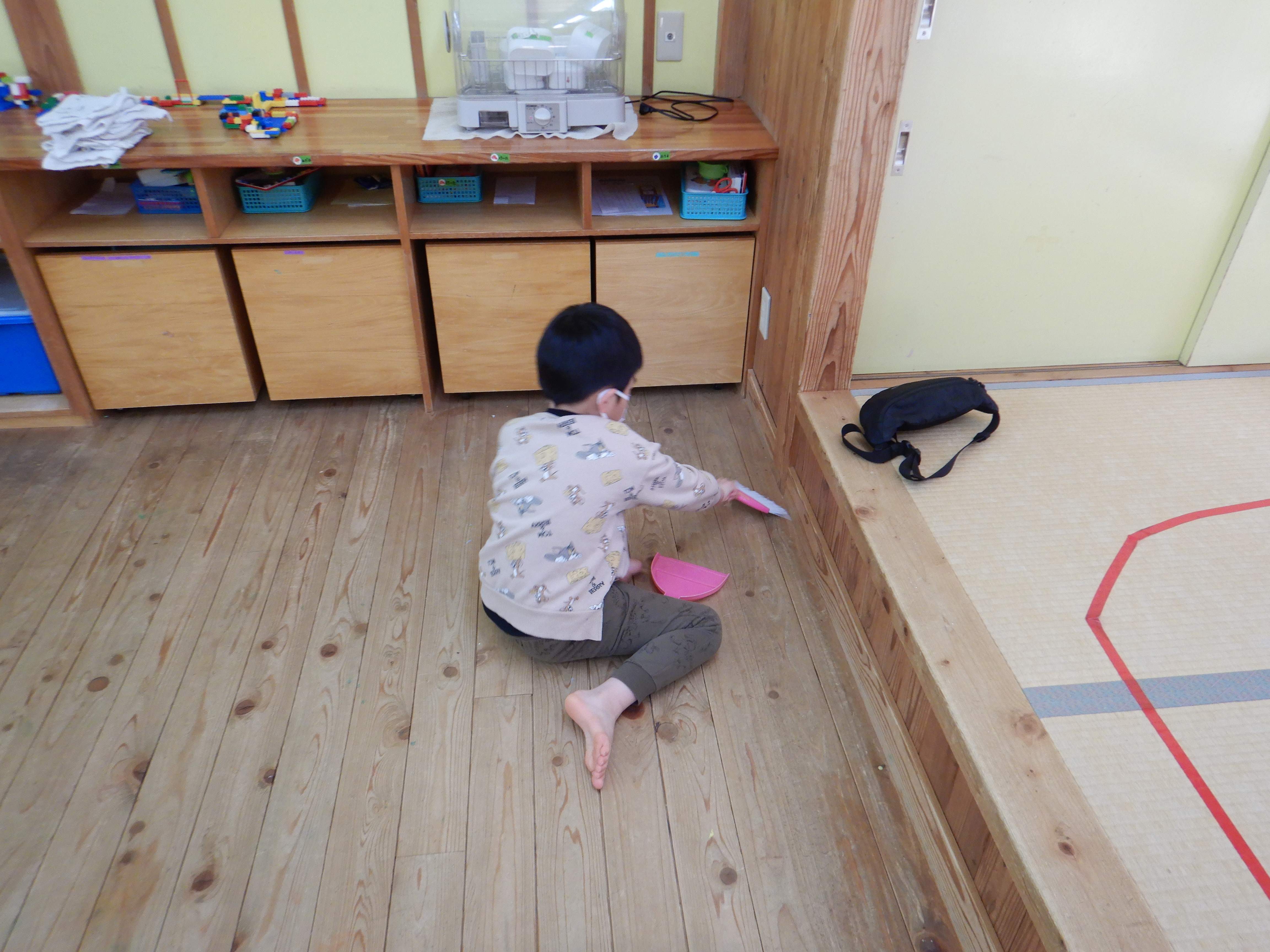 小さい箒と塵取りを使って、細かなゴミも集めていました。