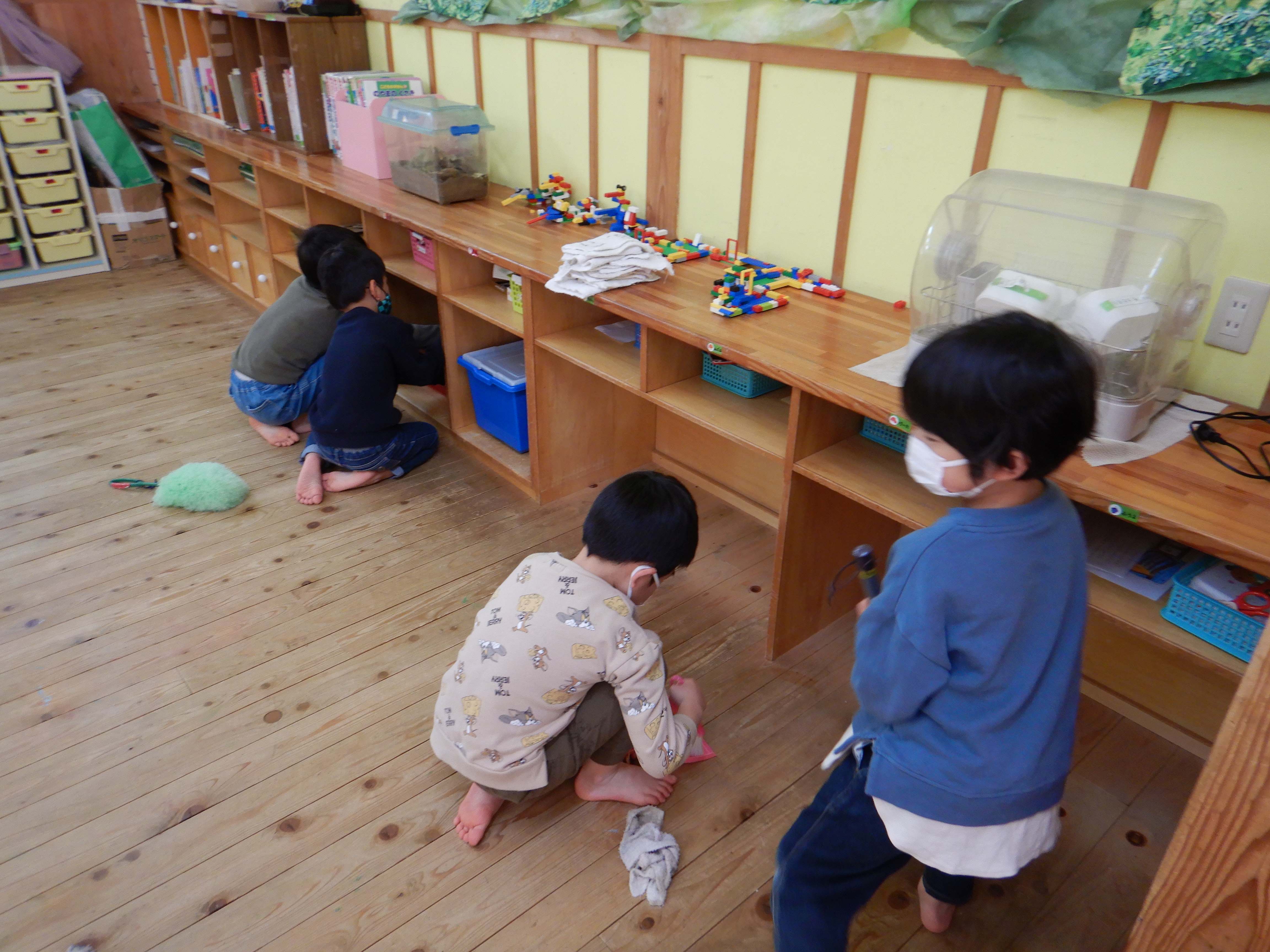 1年間過ごした保育室を『ありがとう』の気持ちを込めて、保護者の方と一緒に掃除をしました。窓ふきや床拭きでは「あっ、ここがこんなによごれてる」「みてー、こんなにぞうきんが、くろくなったよ」など、楽しみながらしっかりと掃除をしていました。掃除が終わり、きれいになった保育室を見て、満足そうな子ども達の姿が見られました。