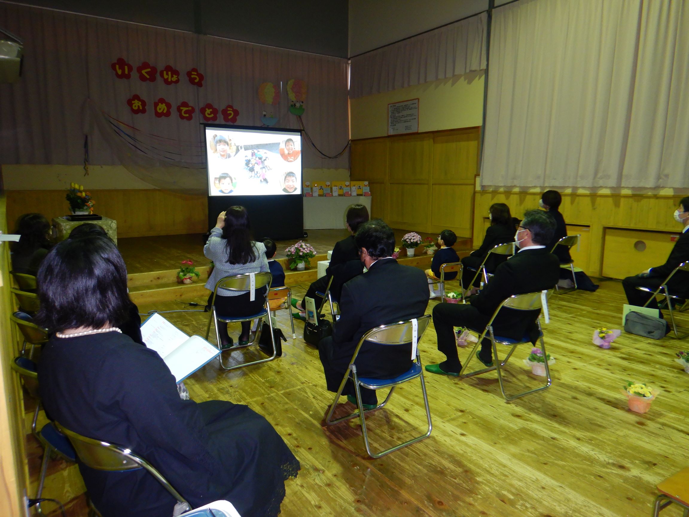 式の後は思い出のスライドショーを親子で観ました。小さい頃の写真や育了していった友達の姿が映し出されると、笑ったり懐かしく話したりしていました。