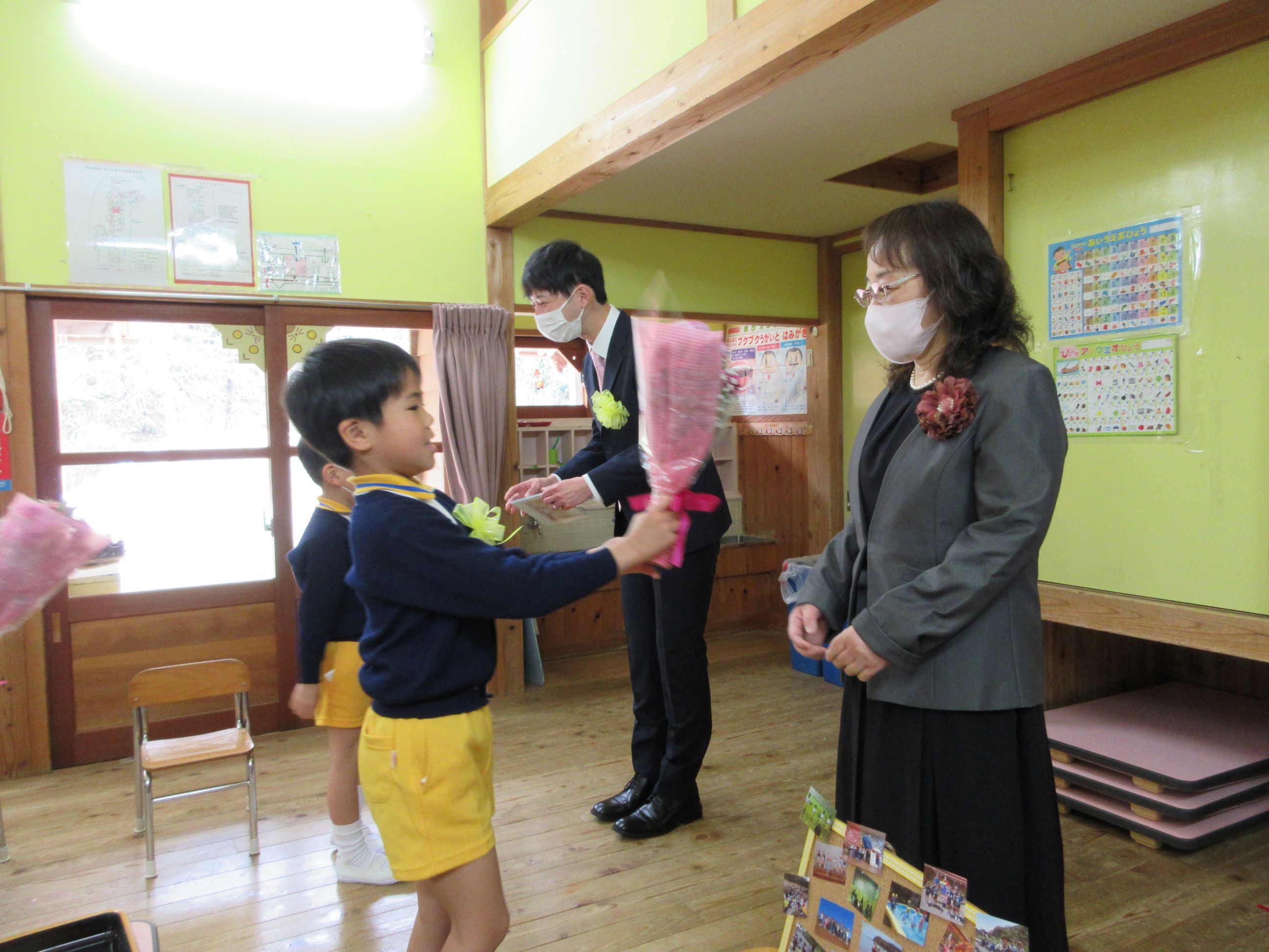 1年間過ごした保育室では、担任からエールの言葉をもらい、また、子ども達からは担任と所長先生へプレゼントを渡し、温かな時間になりました。