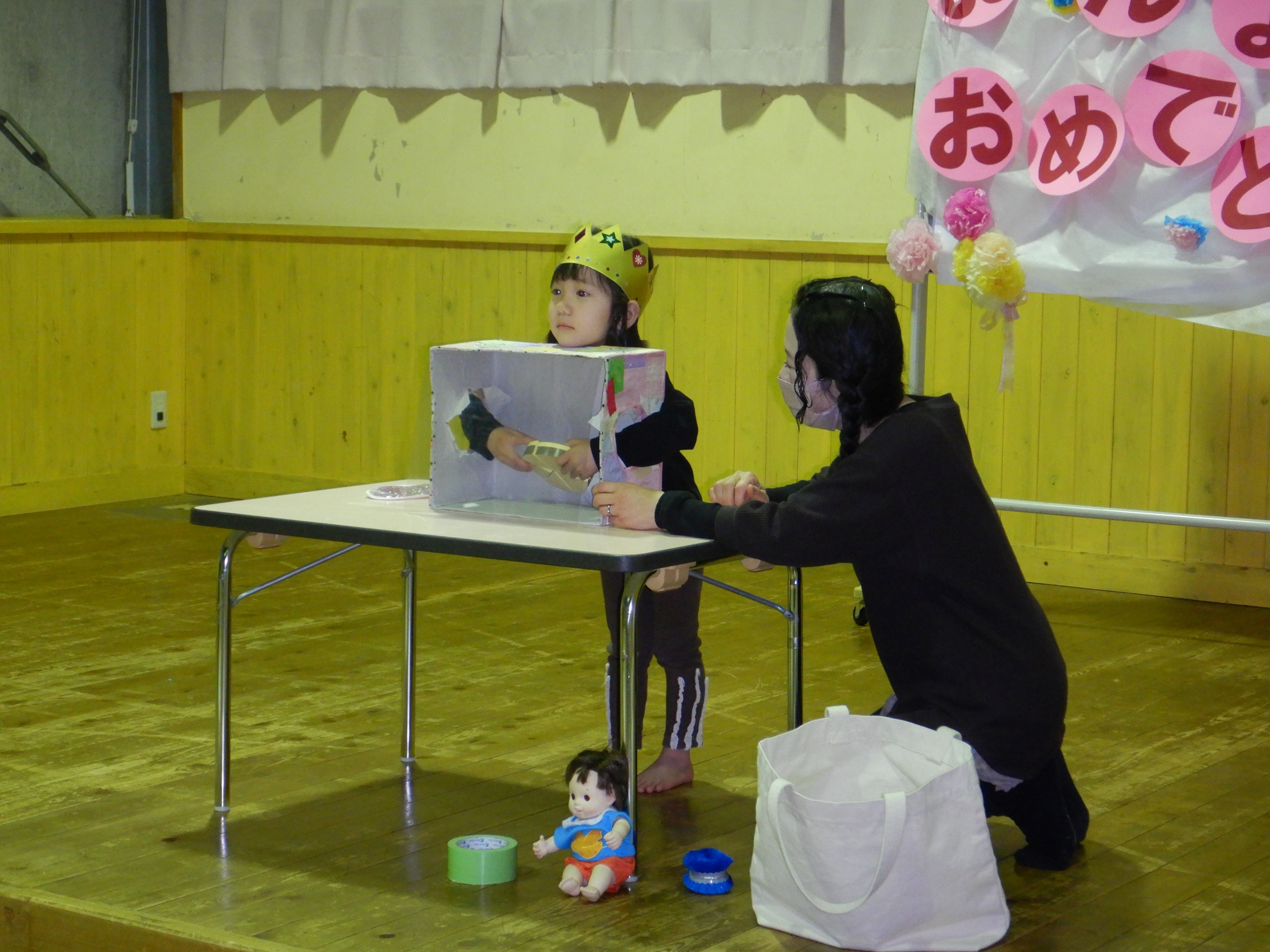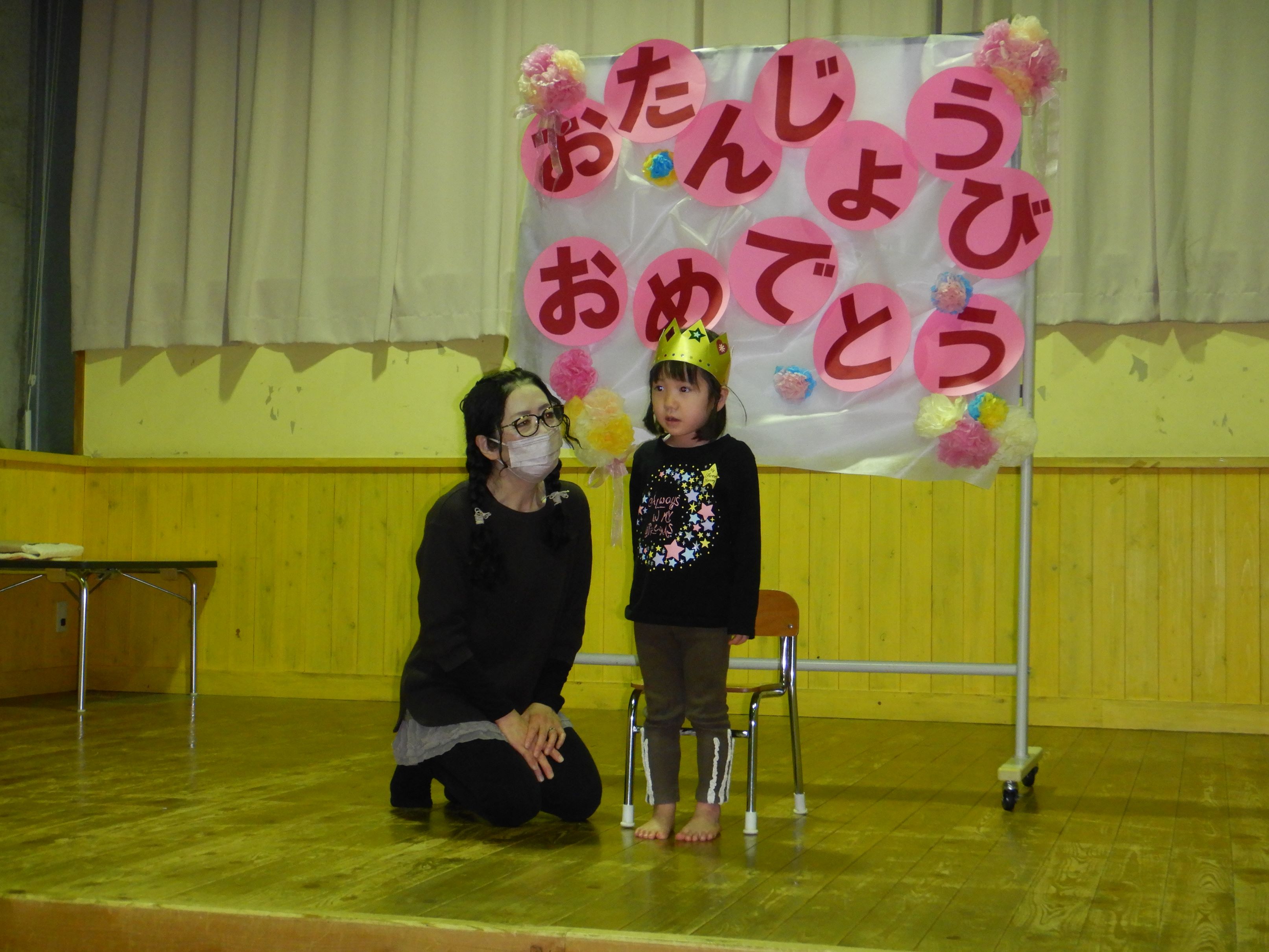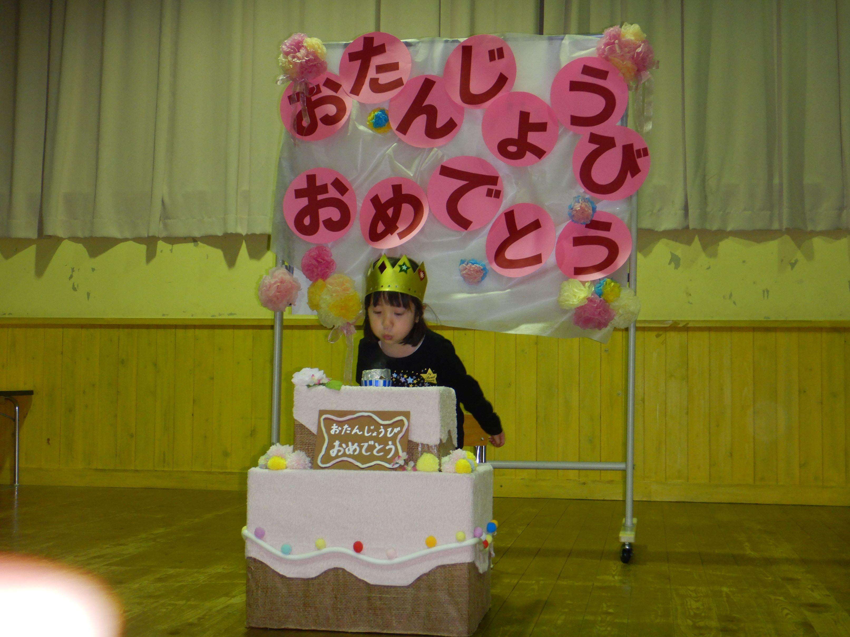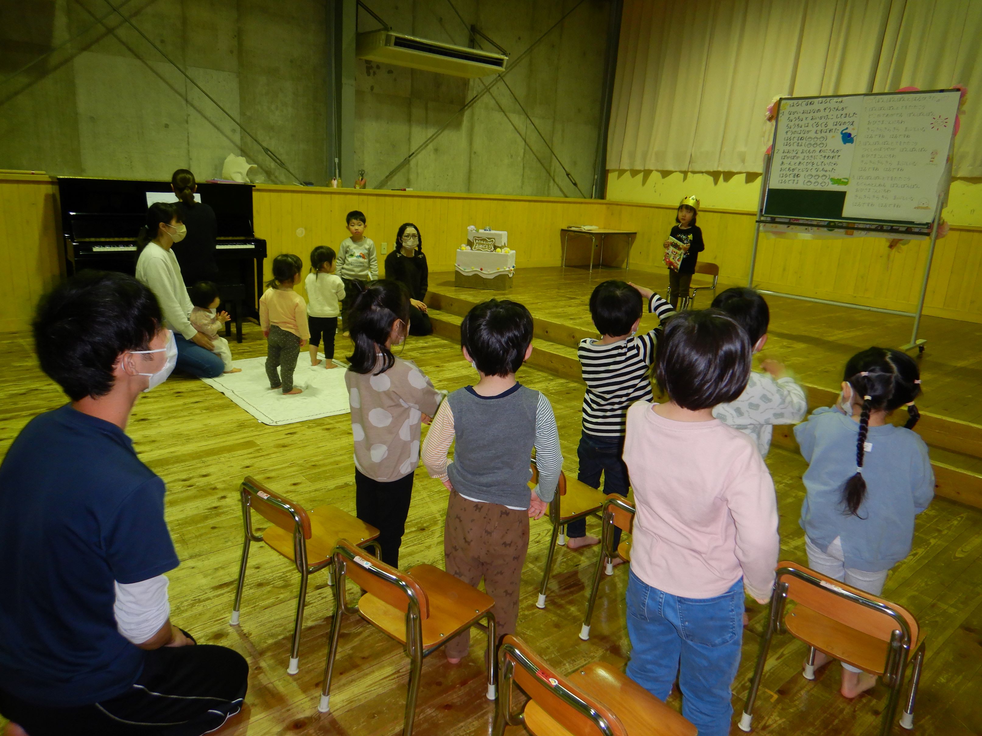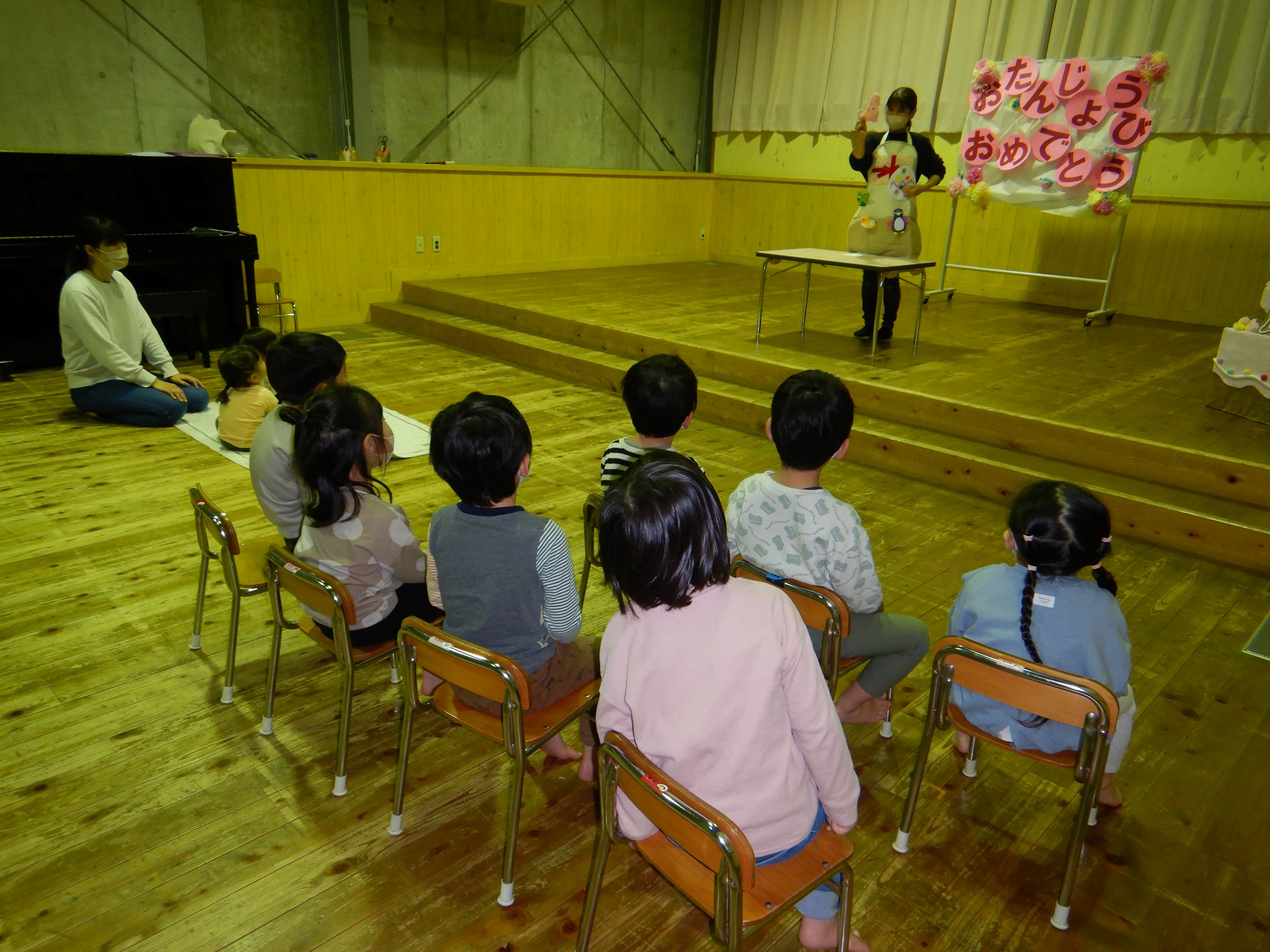 保護者をお招きして,みんなでお祝いをしました。お母さんから「お腹にいた時から家族に沢山声をかけてもらったり、生まれた時も大事にしてもらったりした」と言うお話を聞いて、とても暖かい気持ちになりました。お楽しみ会では、保育者とのやりとりを楽しみながら、エプロンシアターを見たり、箱の中身を当てるゲームをしたりして盛り上がりました。