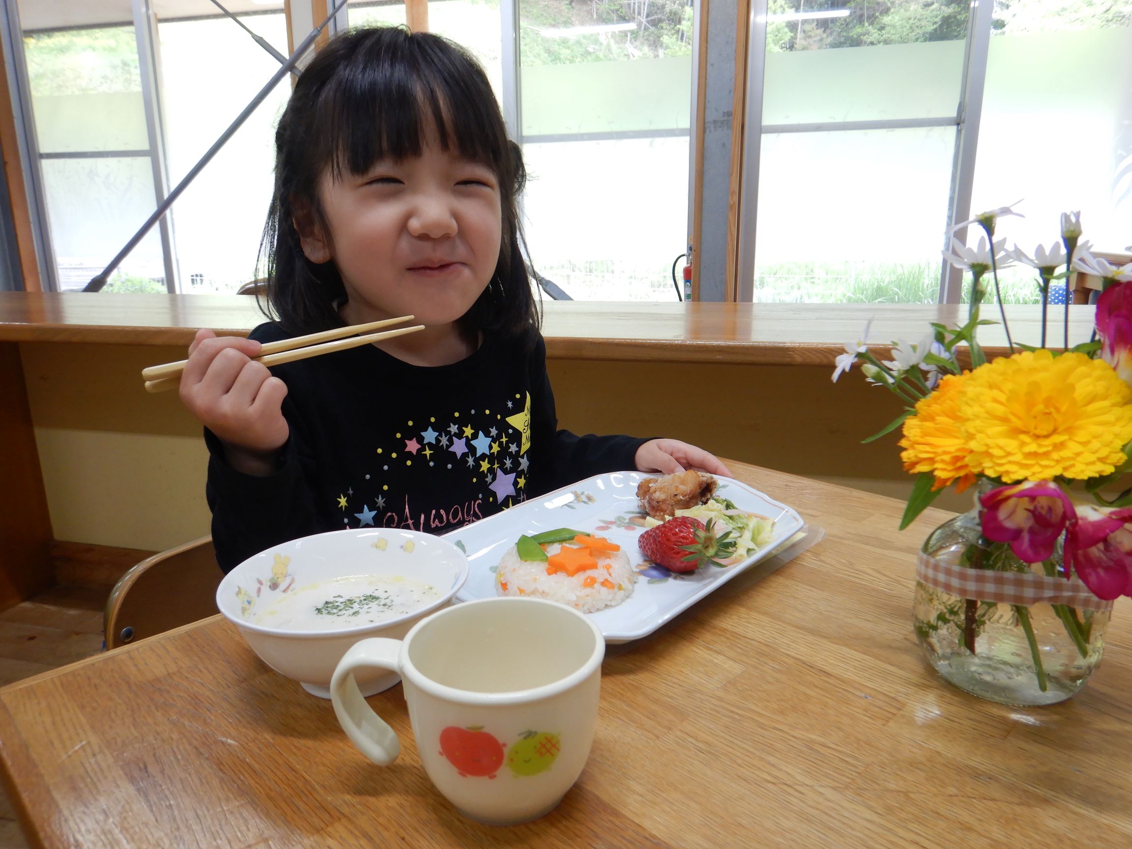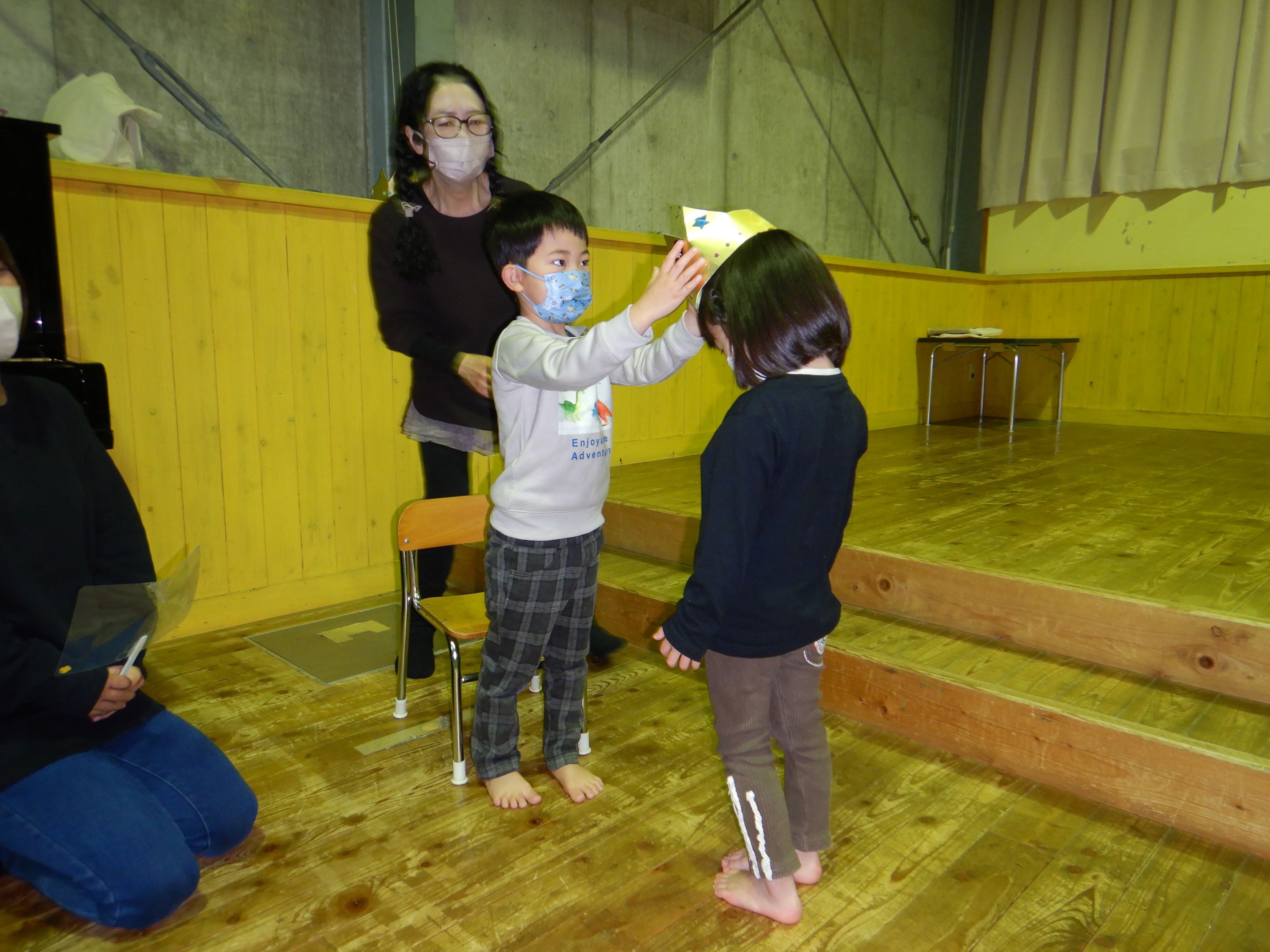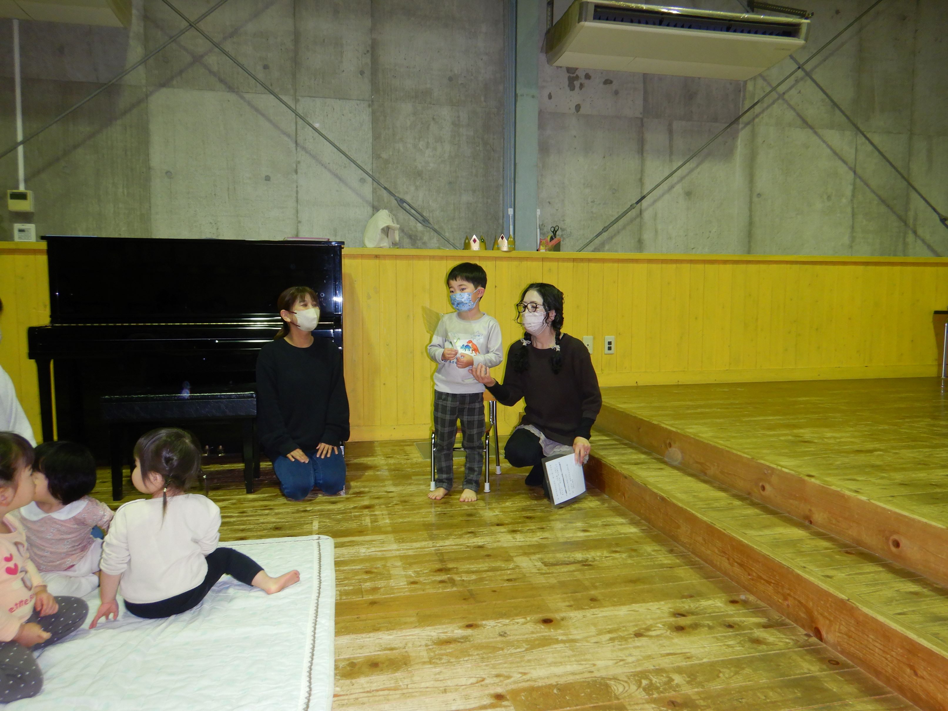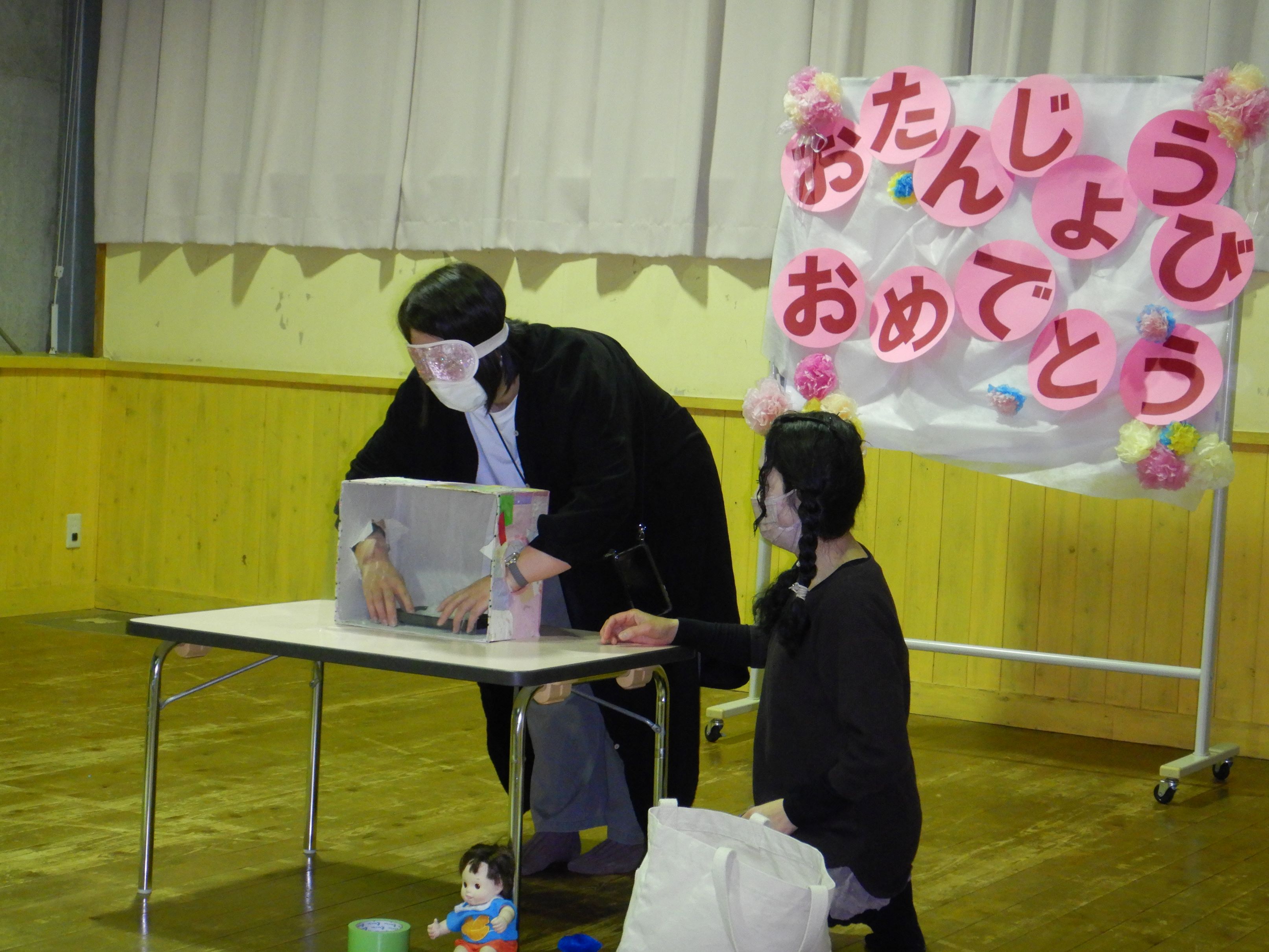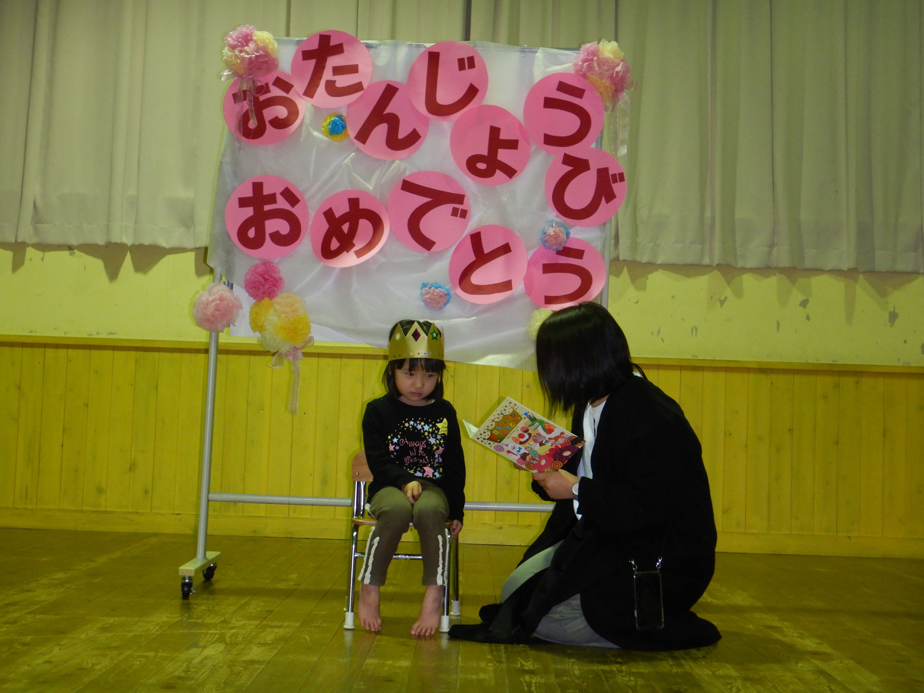保護者をお招きして,みんなでお祝いをしました。お母さんから「お腹にいた時から家族に沢山声をかけてもらったり、生まれた時も大事にしてもらったりした」と言うお話を聞いて、とても暖かい気持ちになりました。お楽しみ会では、保育者とのやりとりを楽しみながら、エプロンシアターを見たり、箱の中身を当てるゲームをしたりして盛り上がりました。