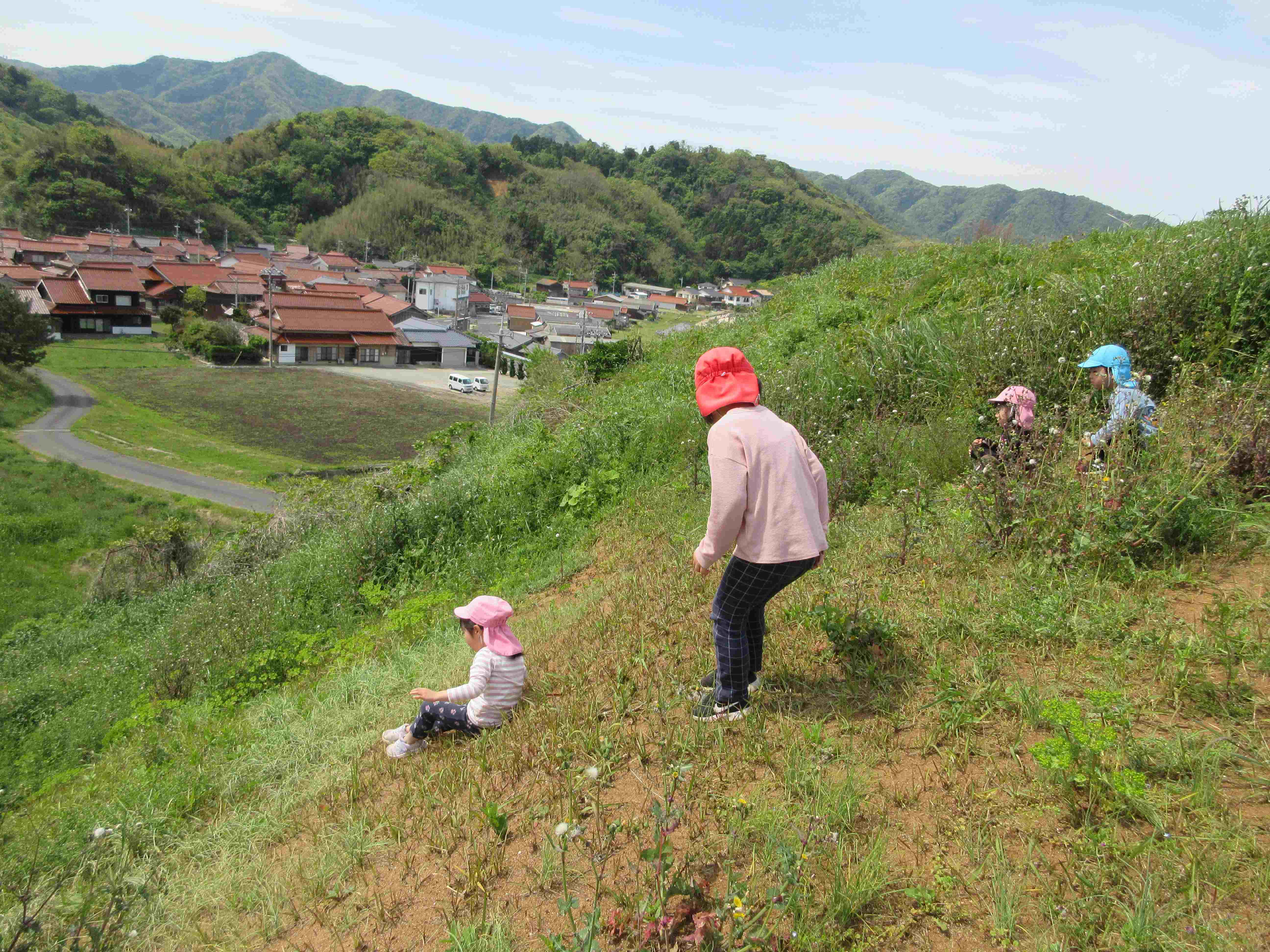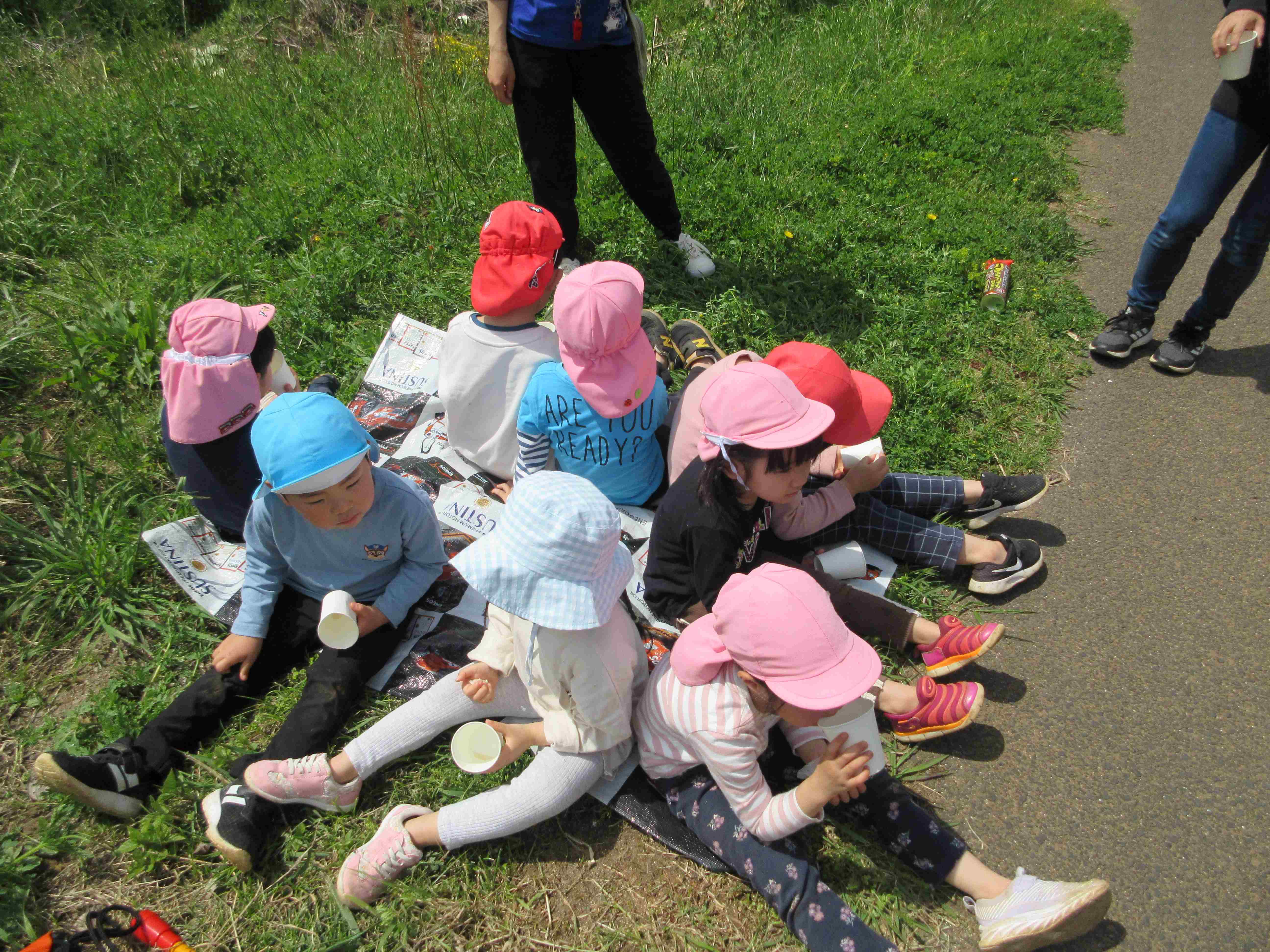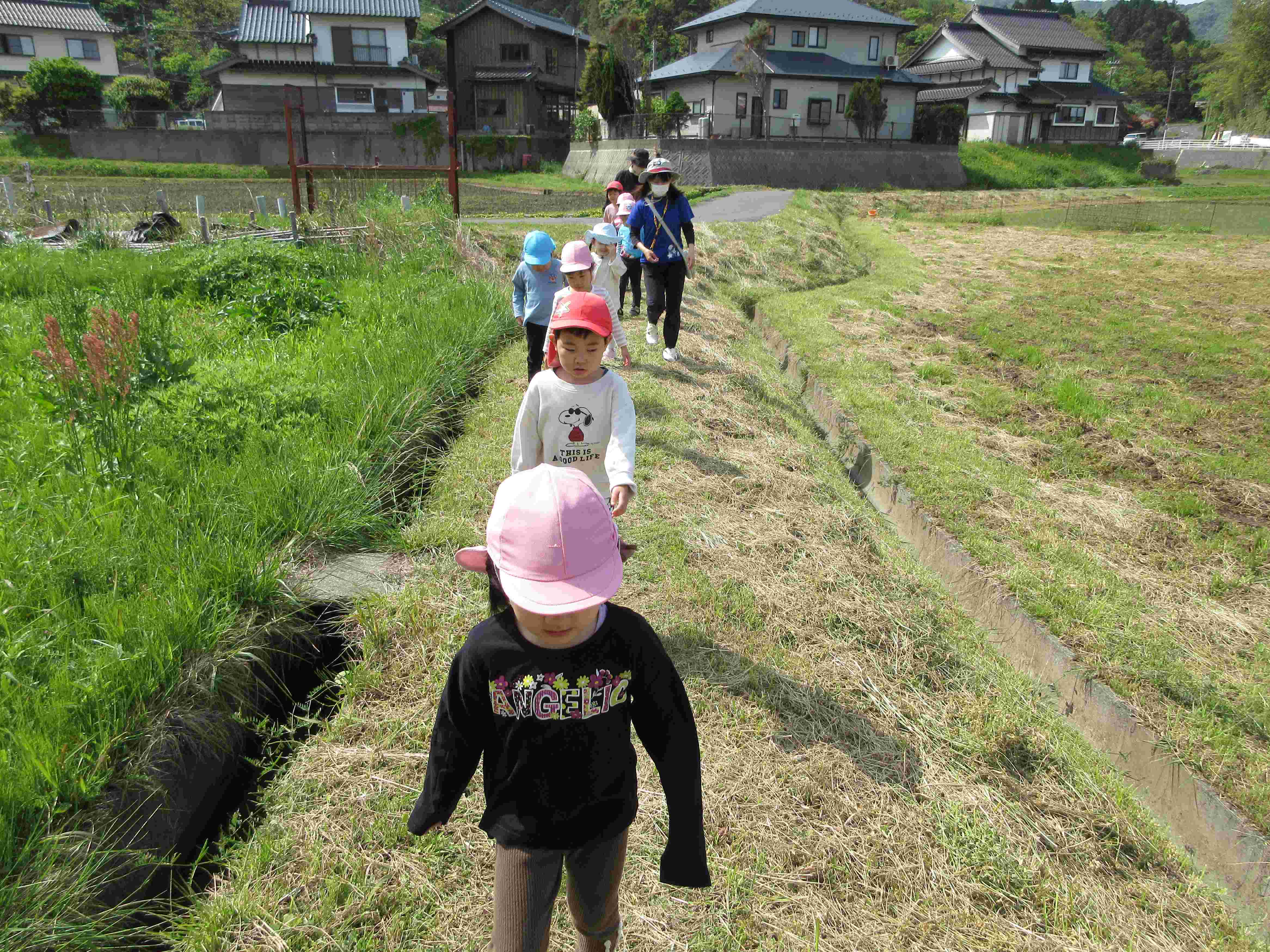 道中は車や自転車・歩行者に気をつけながら、タンポポなどの草花を見つけたり、カエルやウグイスの鳴き声に耳を傾けたりしながら、楽しんで歩いていました。