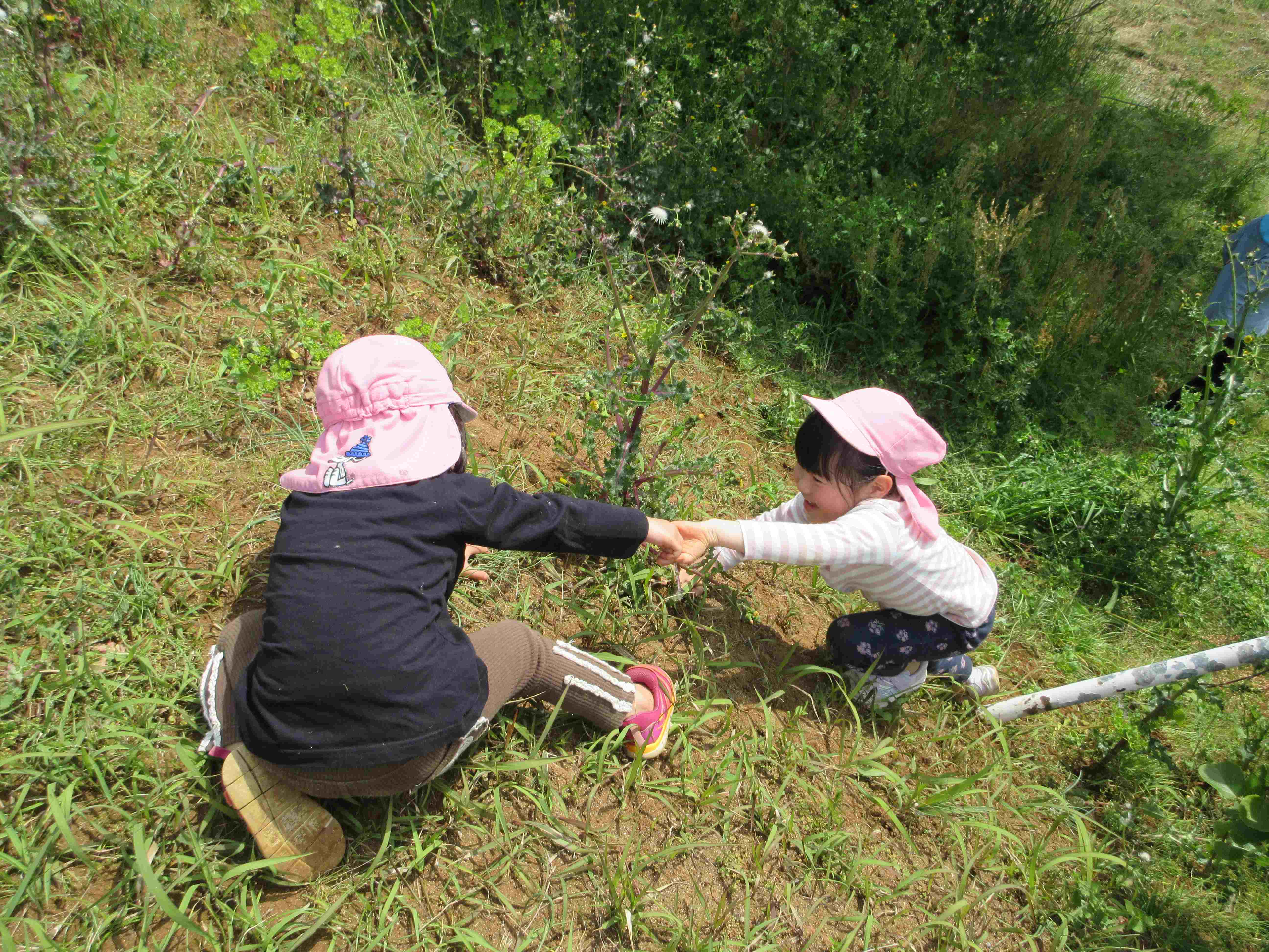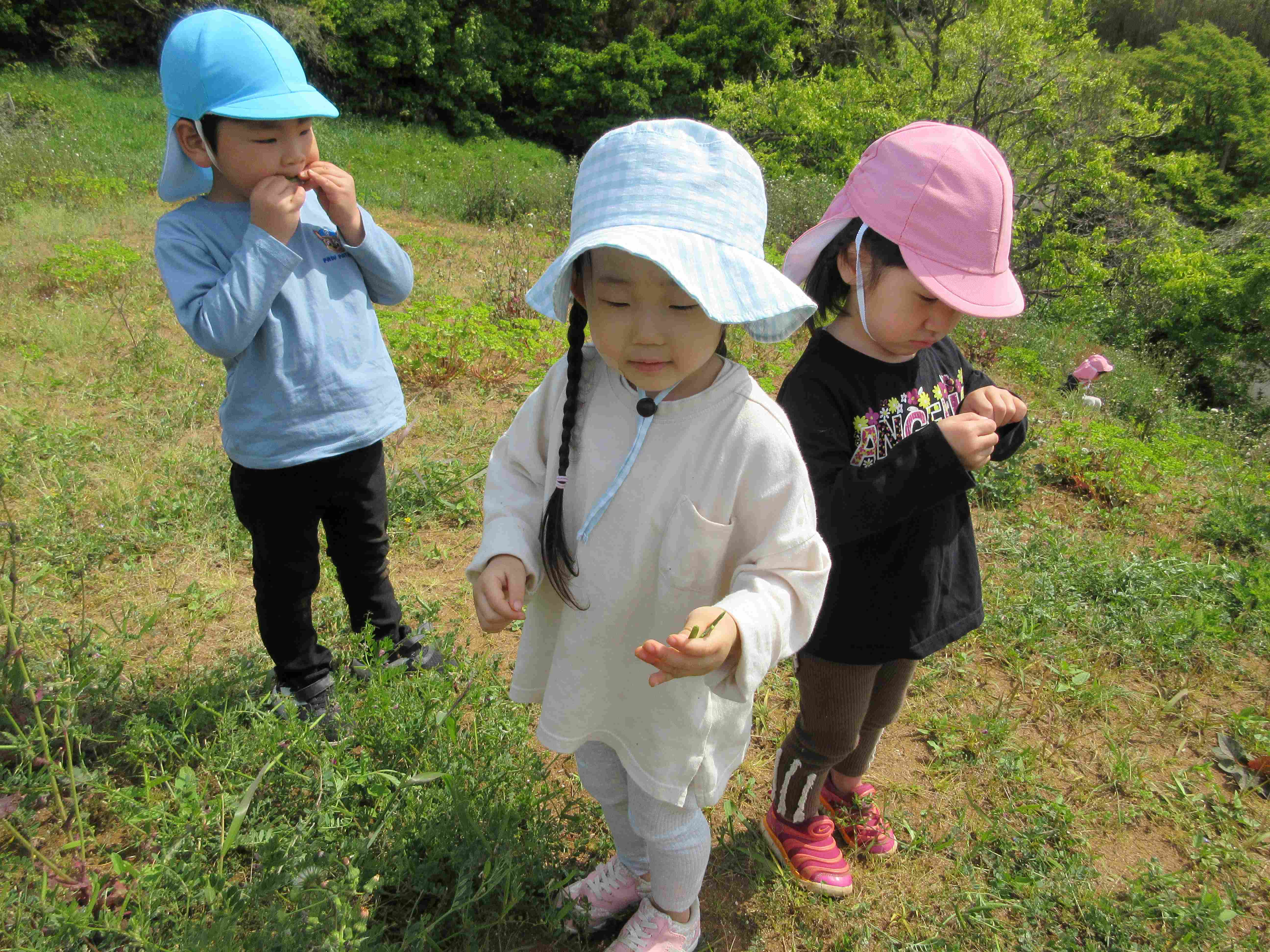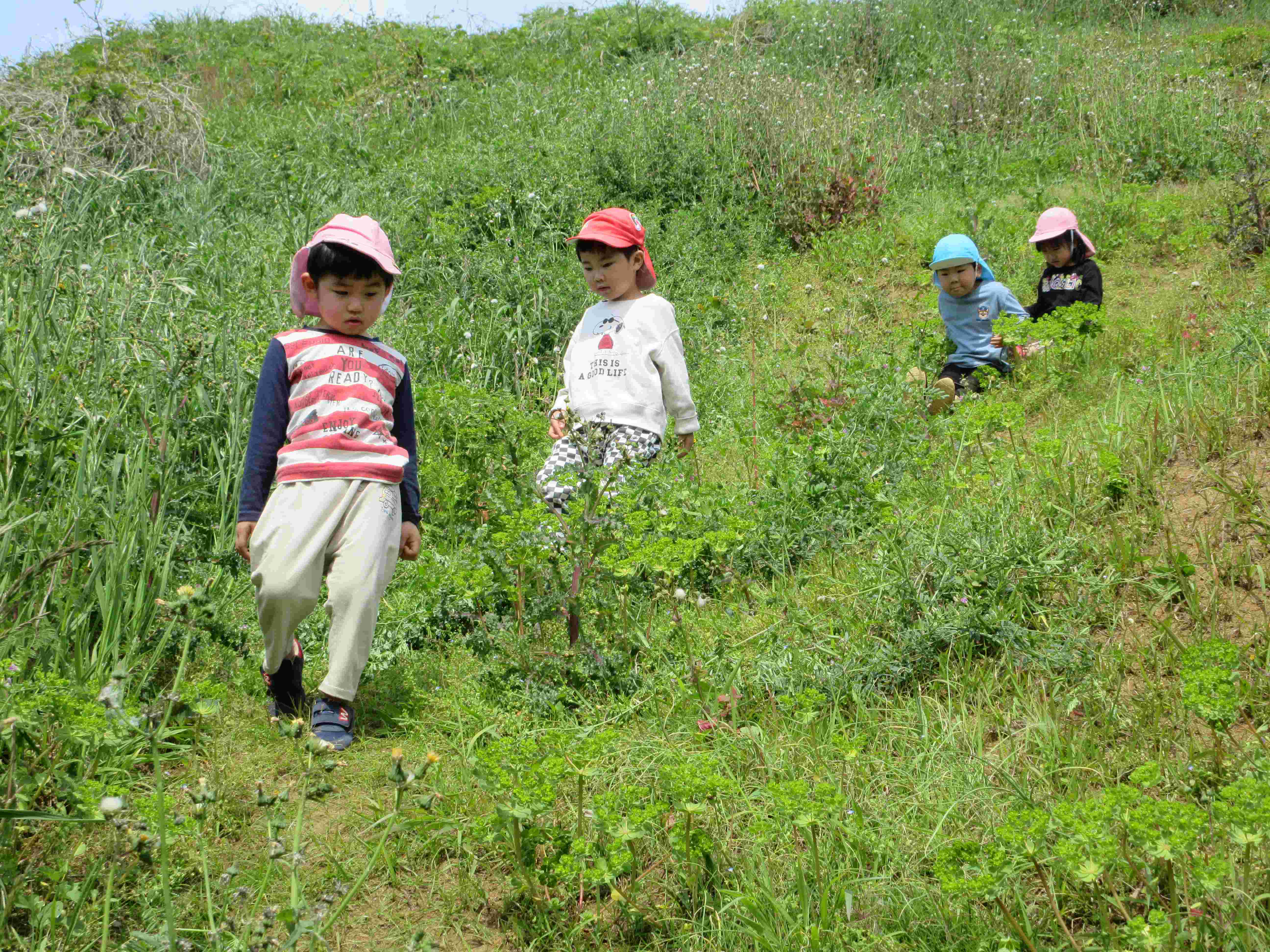道中は車や自転車・歩行者に気をつけながら、タンポポなどの草花を見つけたり、カエルやウグイスの鳴き声に耳を傾けたりしながら、楽しんで歩いていました。