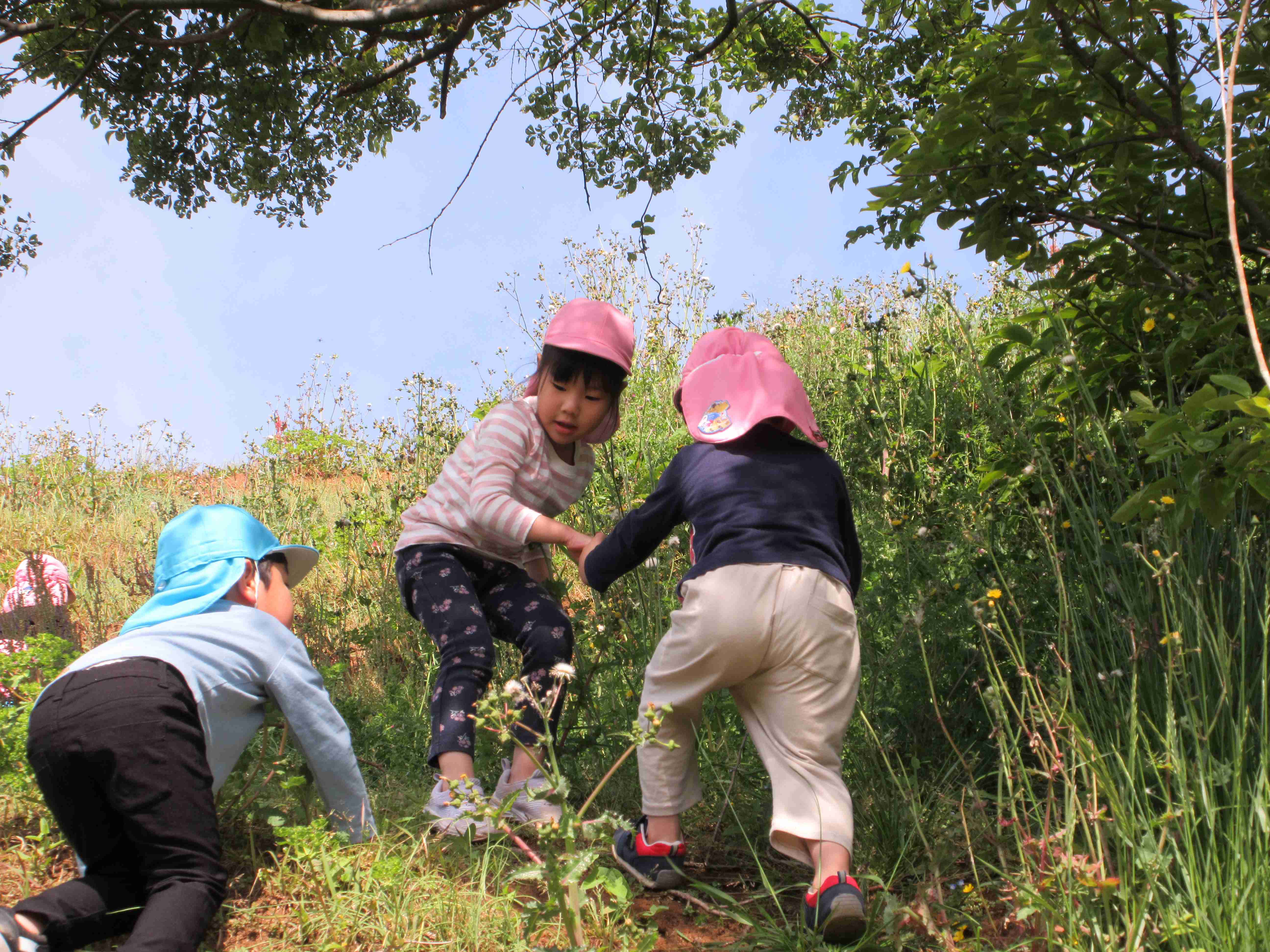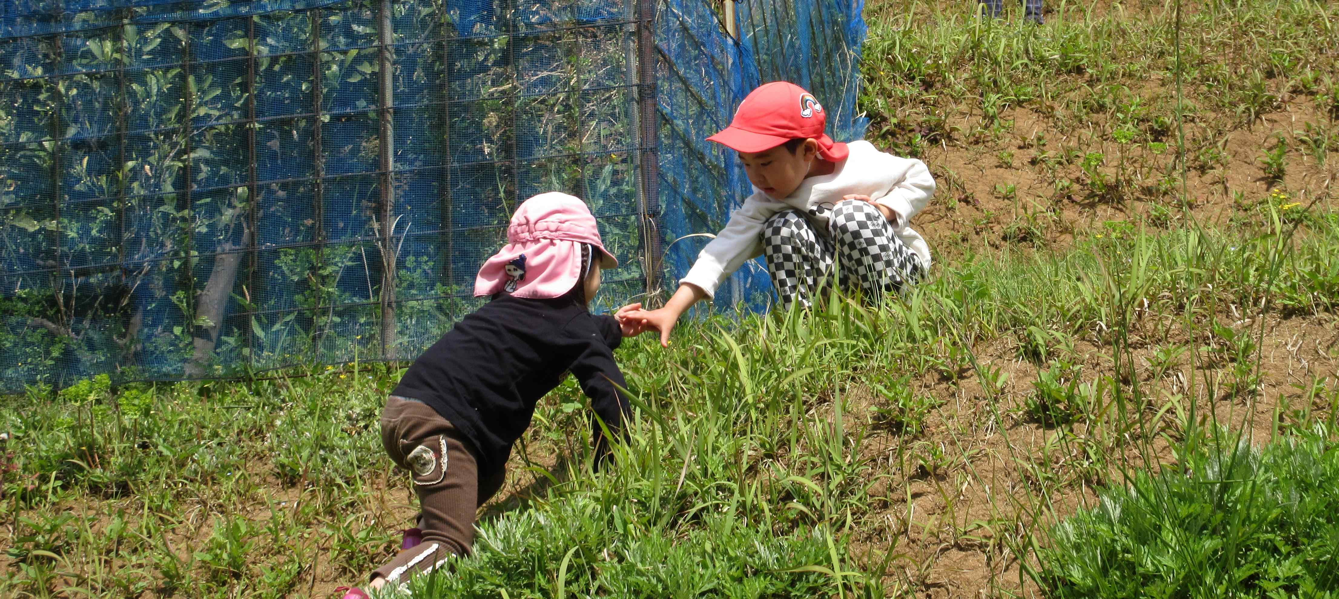 斜面遊びでは、「おーい、こっちからだとのぼりやすいよ」「ねぇ、こっちきてー」「なになに?なにがあったの?」「がんばれー」「てにつかまって!」「たのしいね!もういっかいしよう!」と、友達同士で言葉を交わしながら遊ぶ姿が見られました。