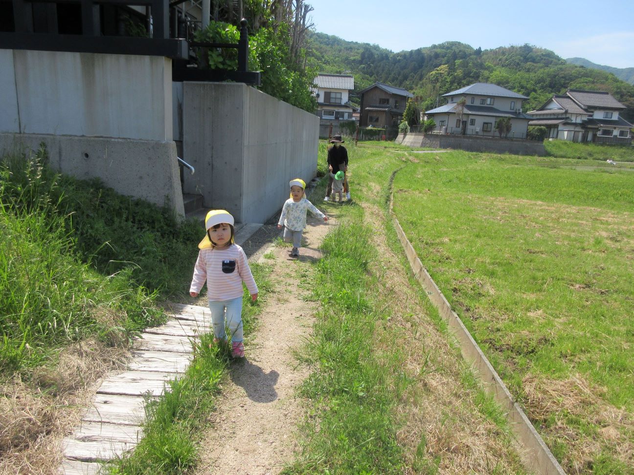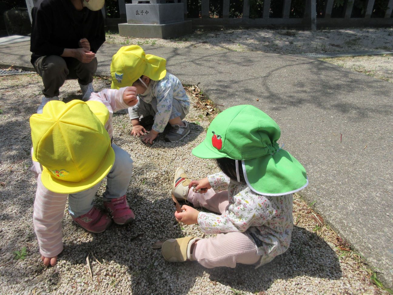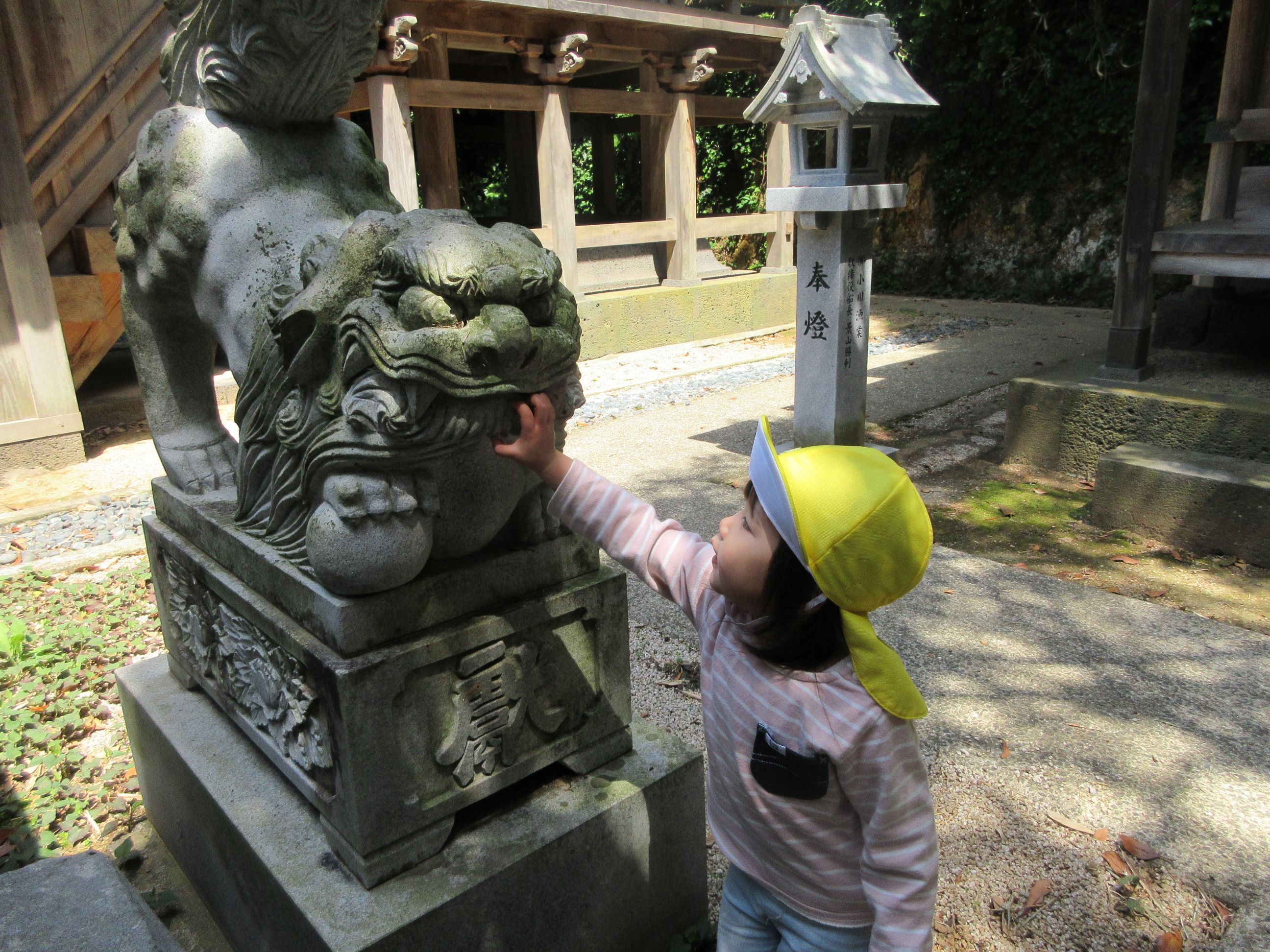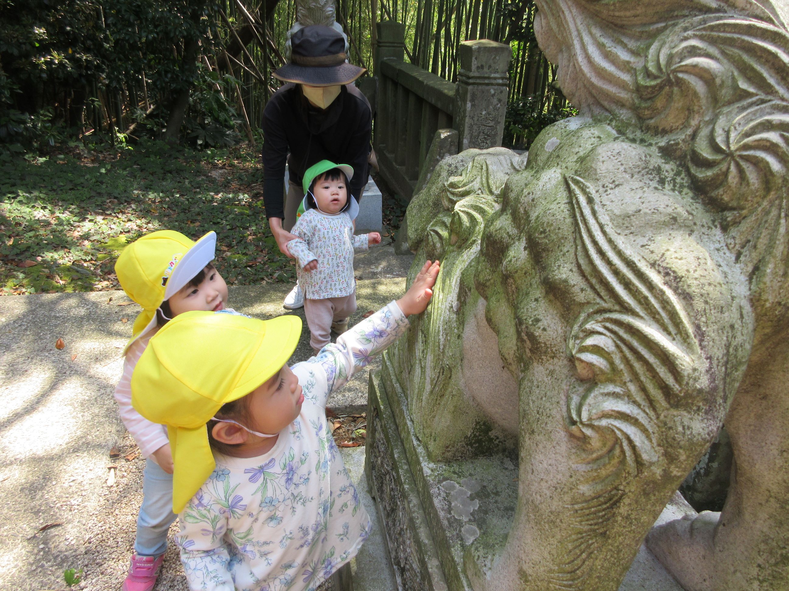 田んぼの中におたまじゃくしを見つけたり、出会った方に「こんにちは」と挨拶をしたり、神社の狛犬に「わんわん」と言ったりして、散歩を楽しみました。
