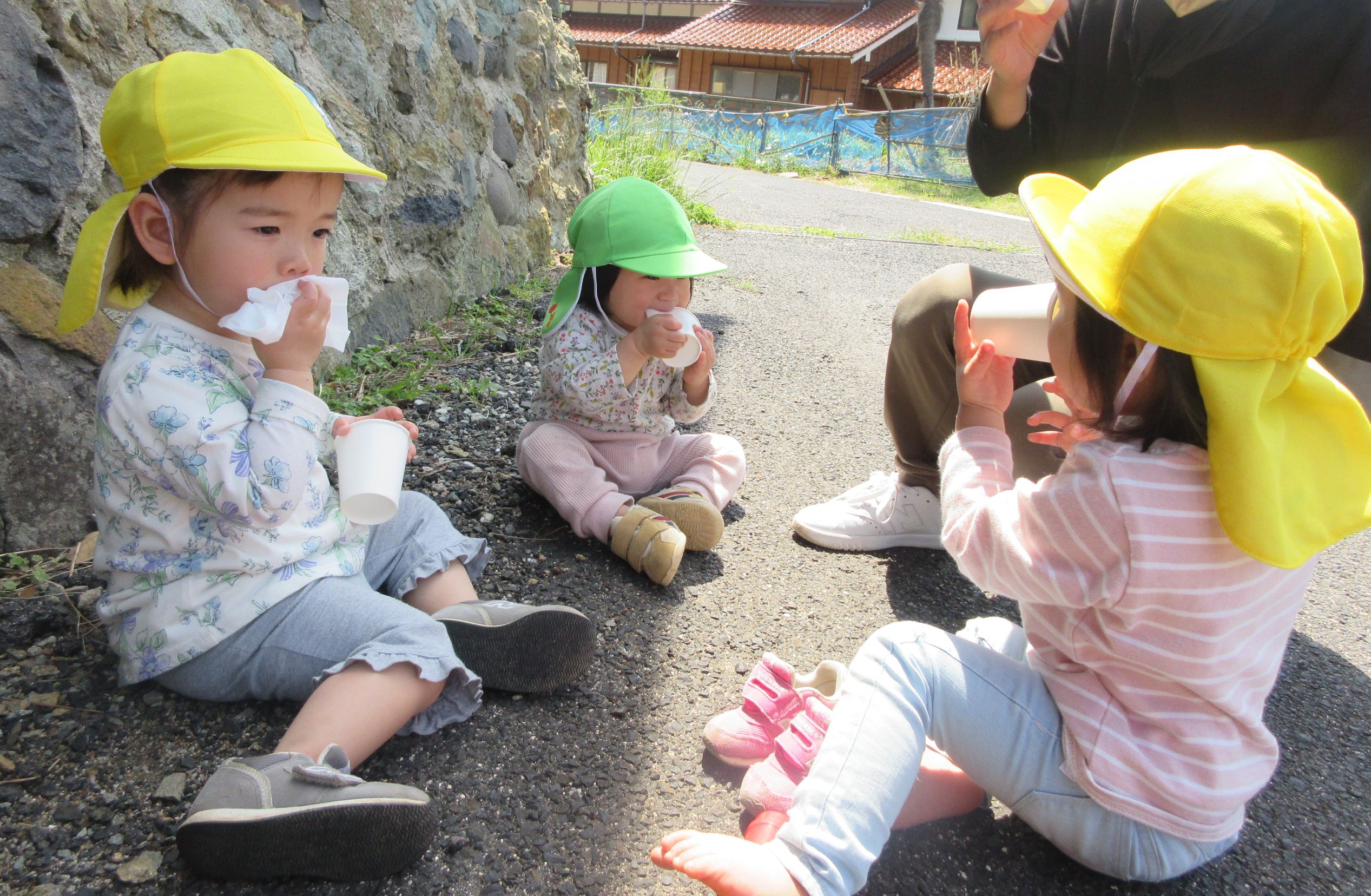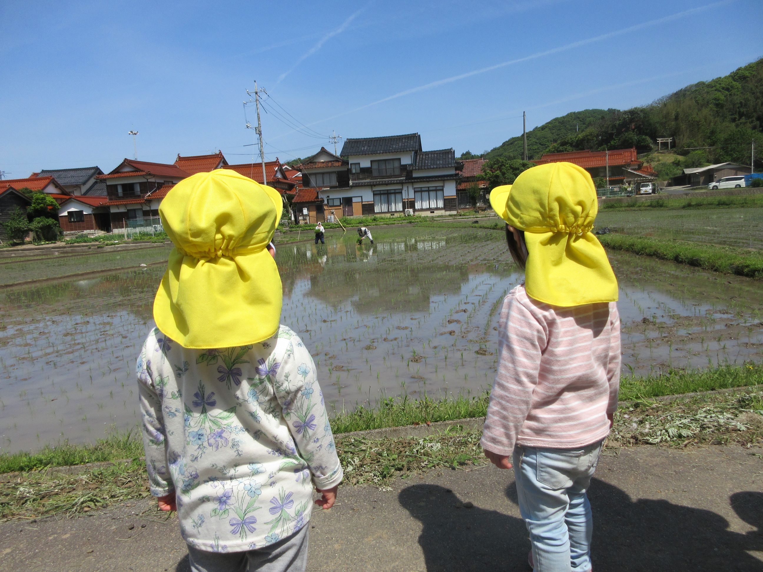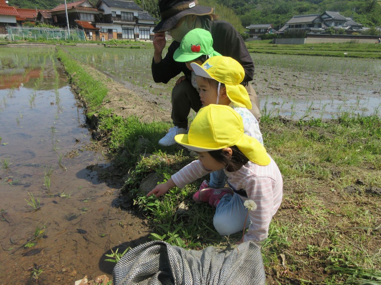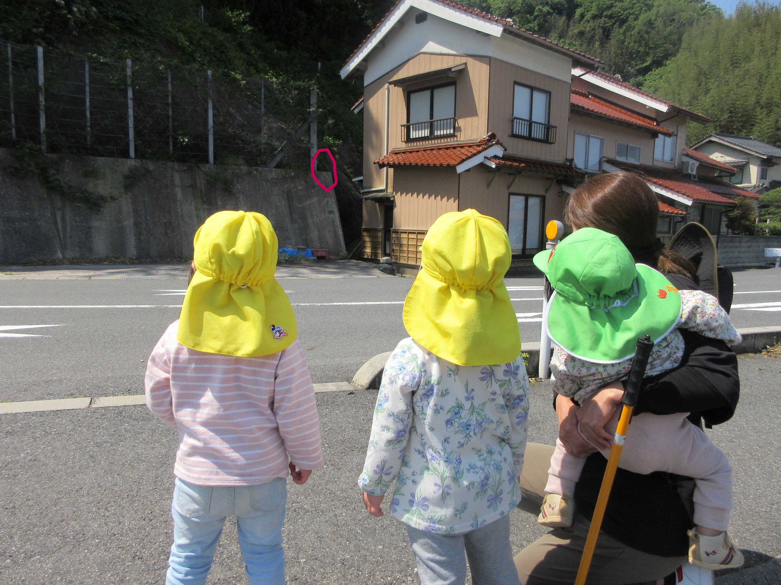 田んぼの中におたまじゃくしを見つけたり、出会った方に「こんにちは」と挨拶をしたり、神社の狛犬に「わんわん」と言ったりして、散歩を楽しみました。