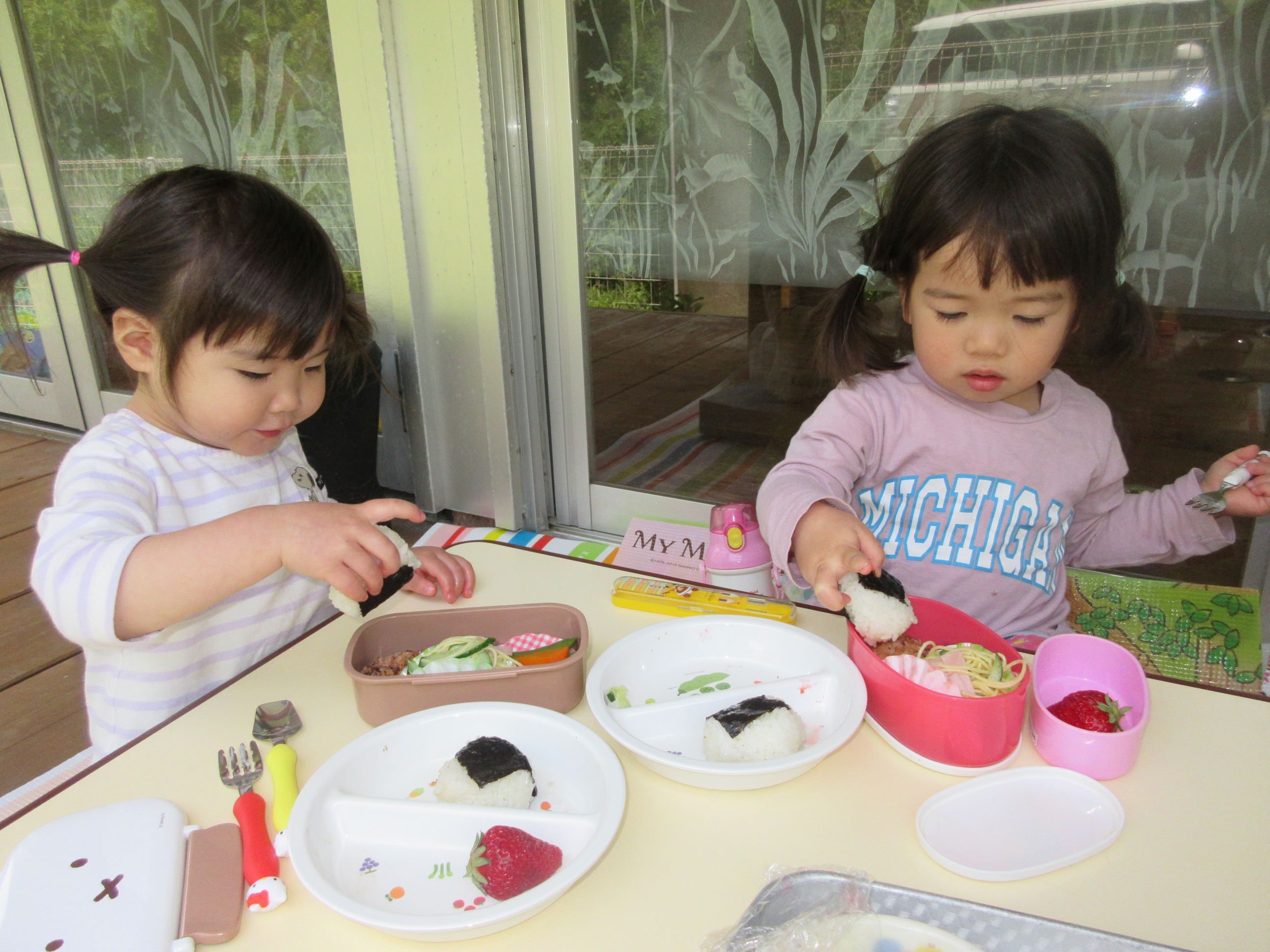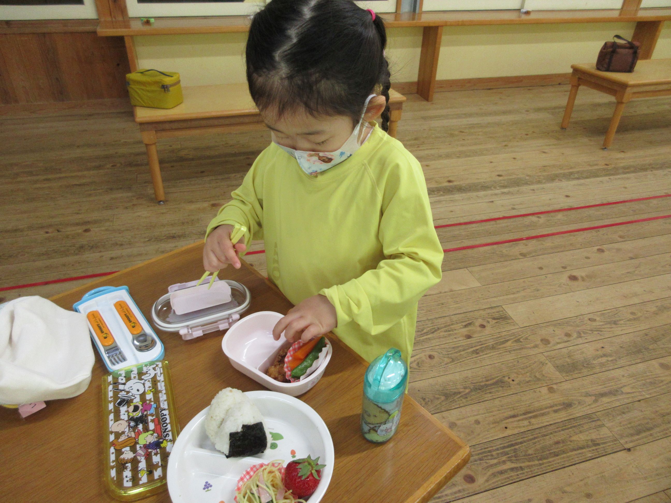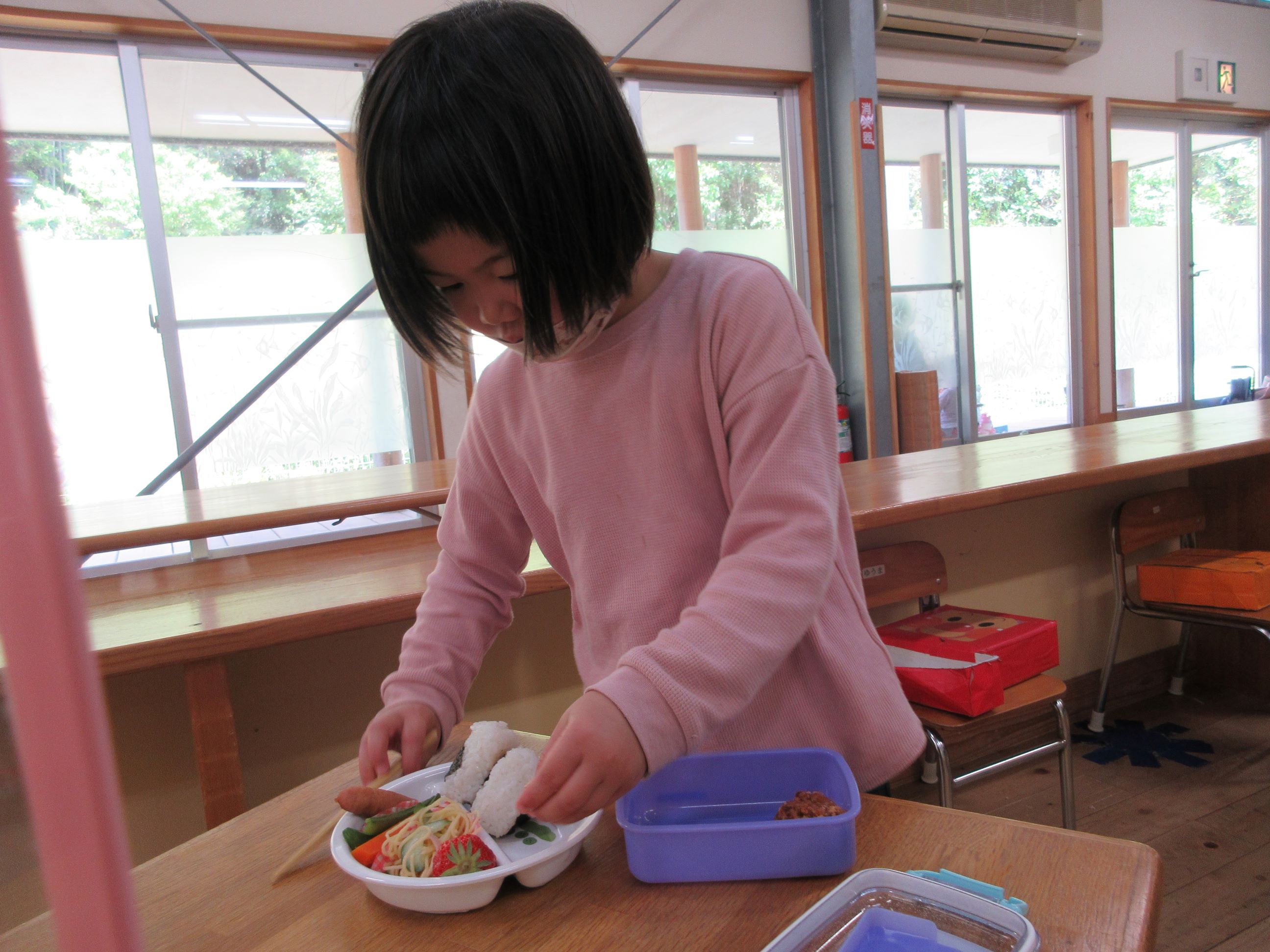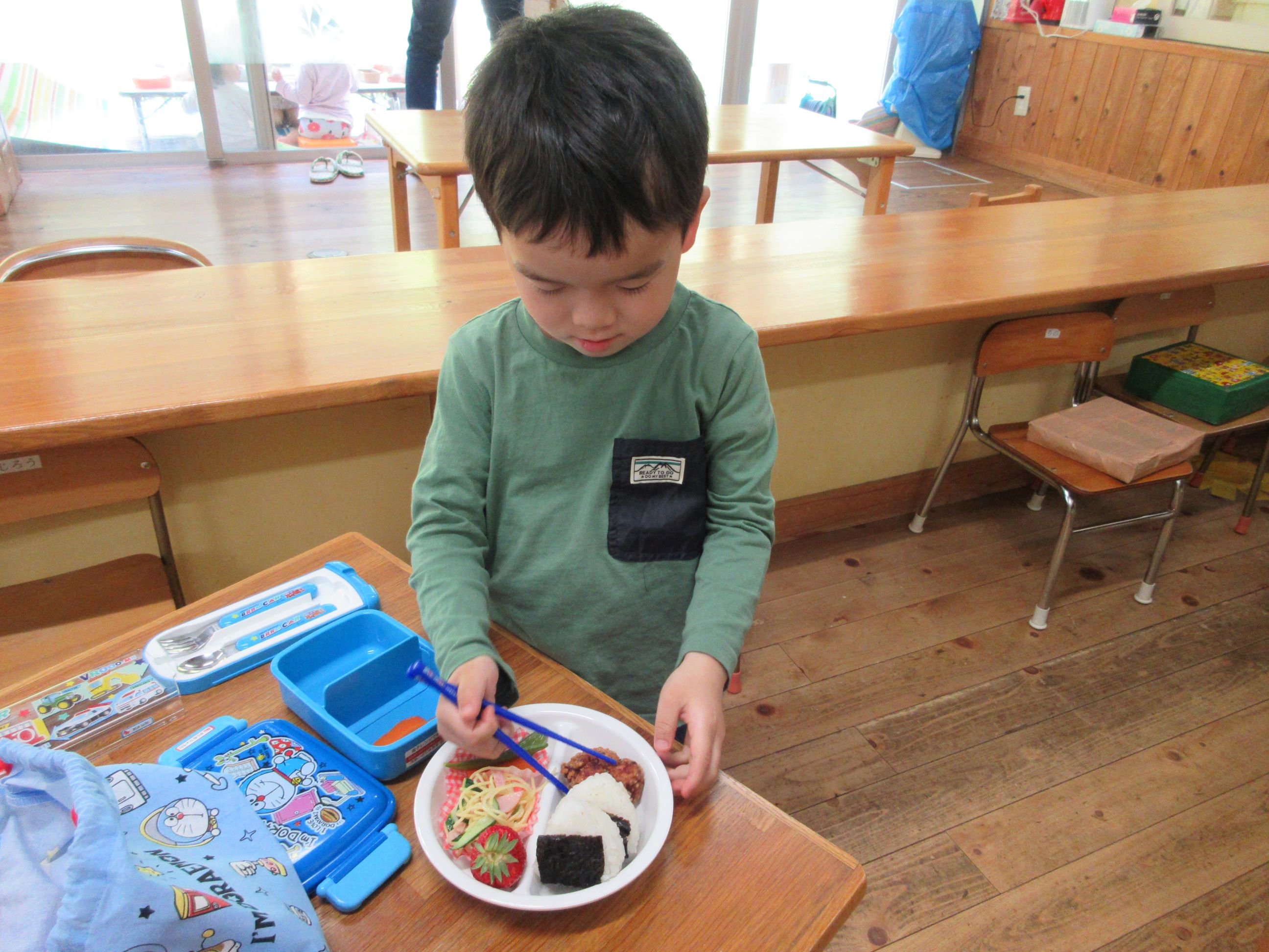 お皿に盛られたお弁当用の給食を見て、「わぁ~、おいしそう」「どれからいれようかなぁ~」と言いながら、嬉しそうに詰めていました。そして、お弁当が完成すると、にじ・そら組は所庭で、ゆめ・ほし組はランチルームのテラスで、お弁当を食べました。自分で詰めたお弁当を「おいしい」「つぎはこれたべよー」などと、つぶやきながら、嬉しそうに食べる子ども達でした。