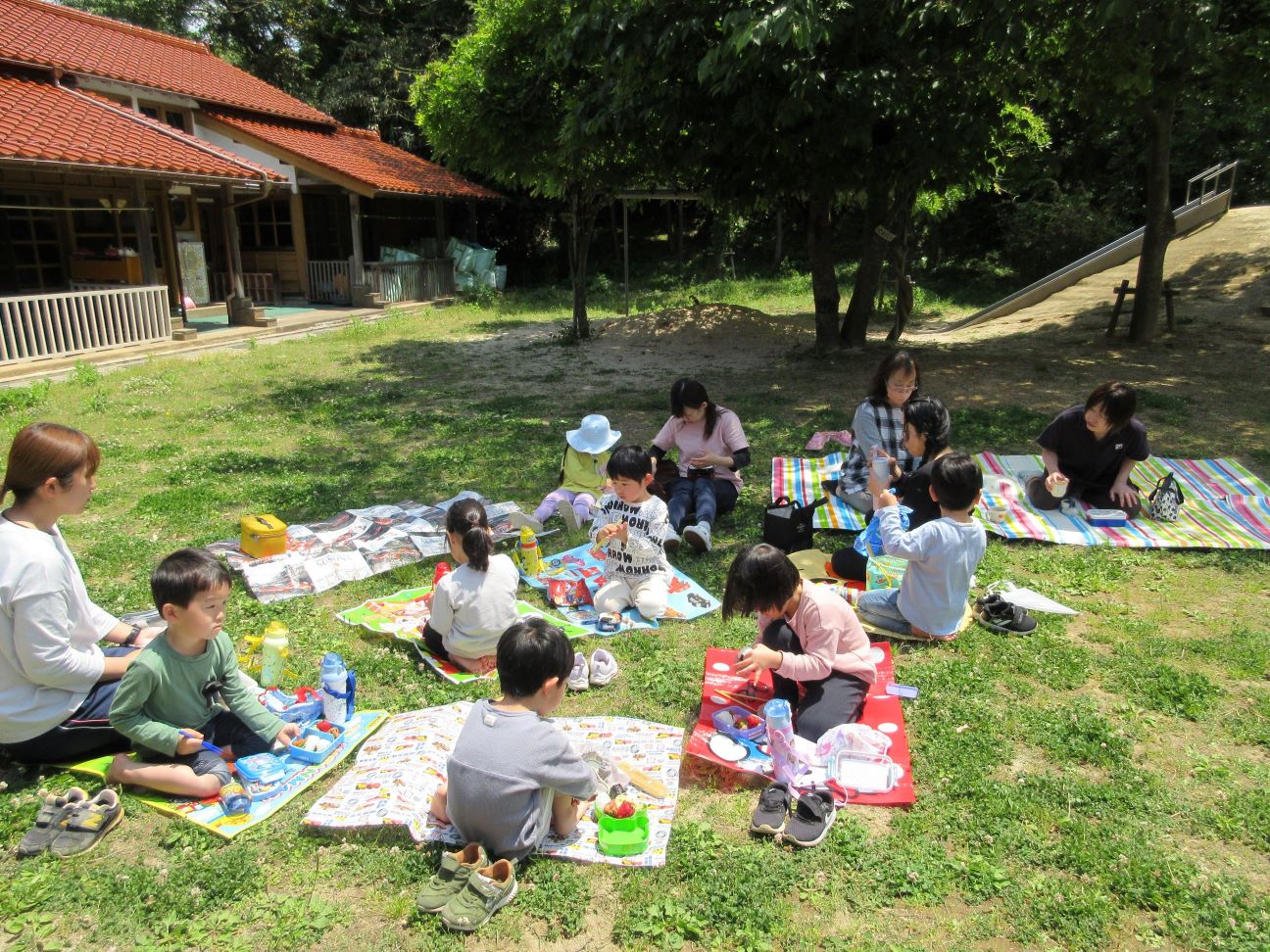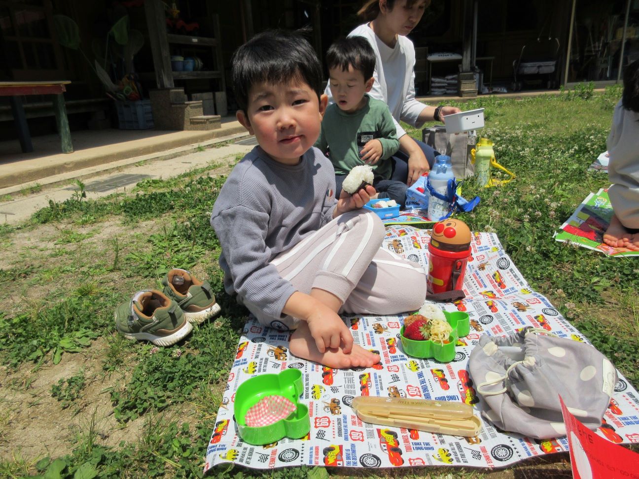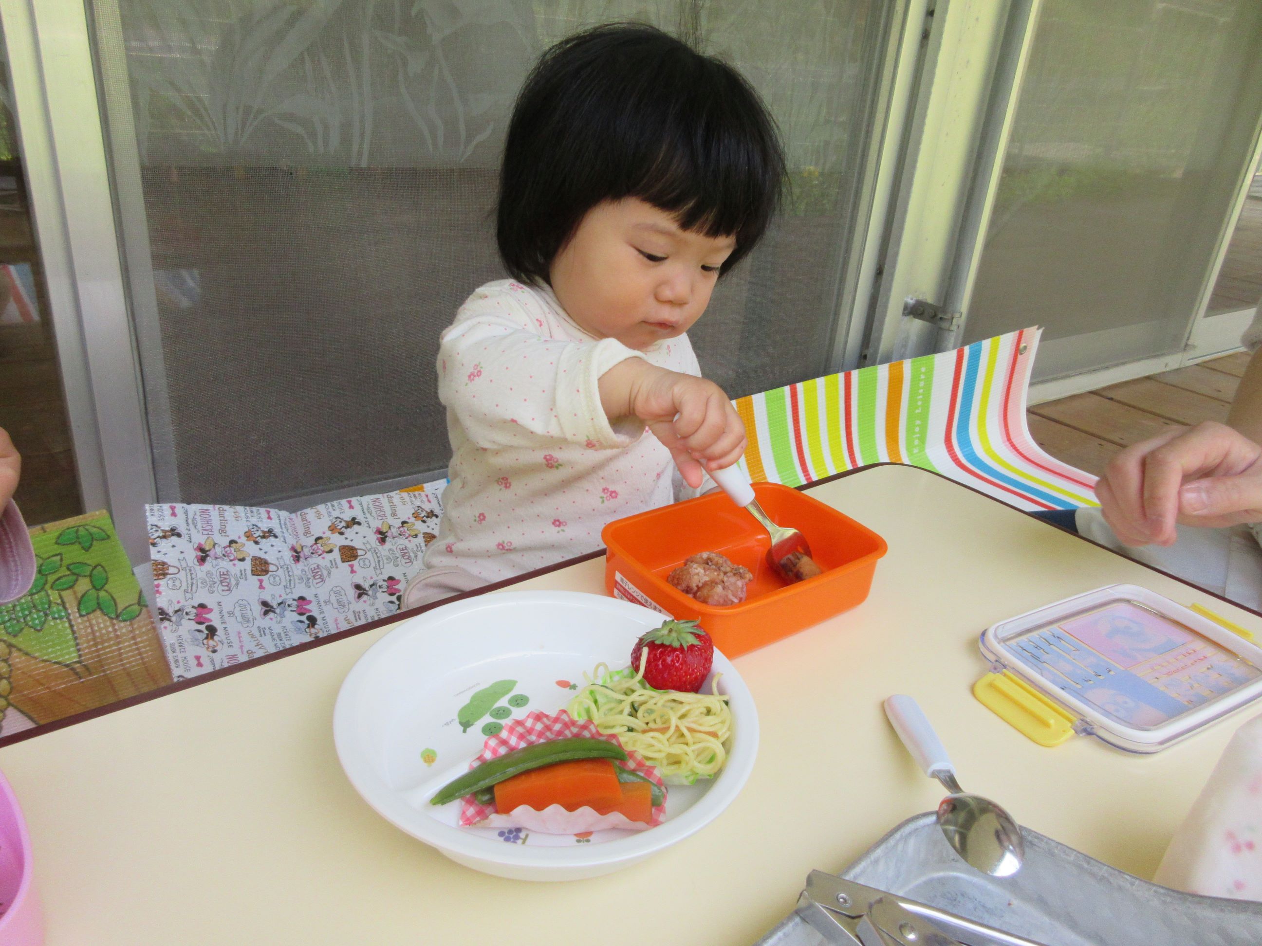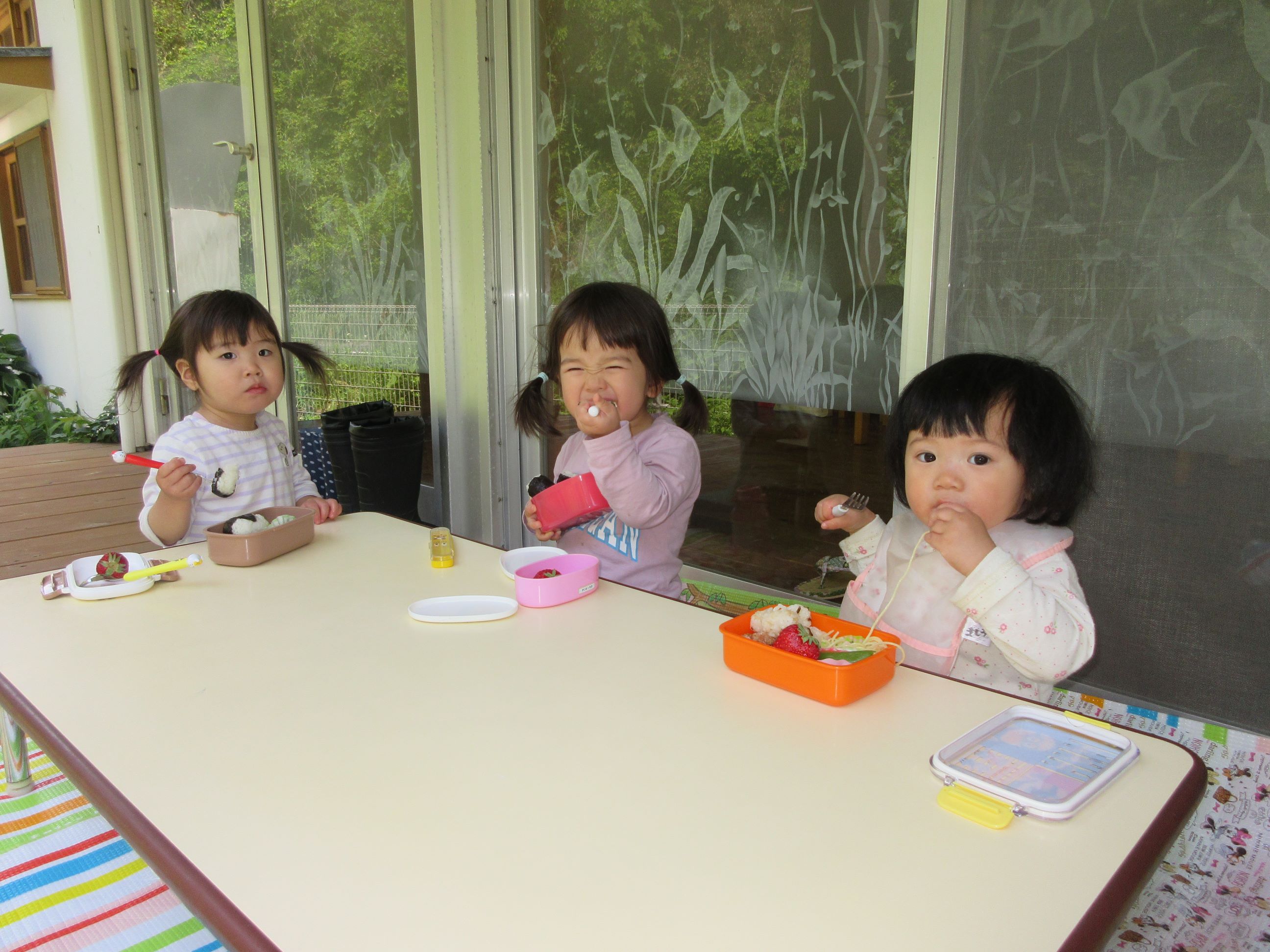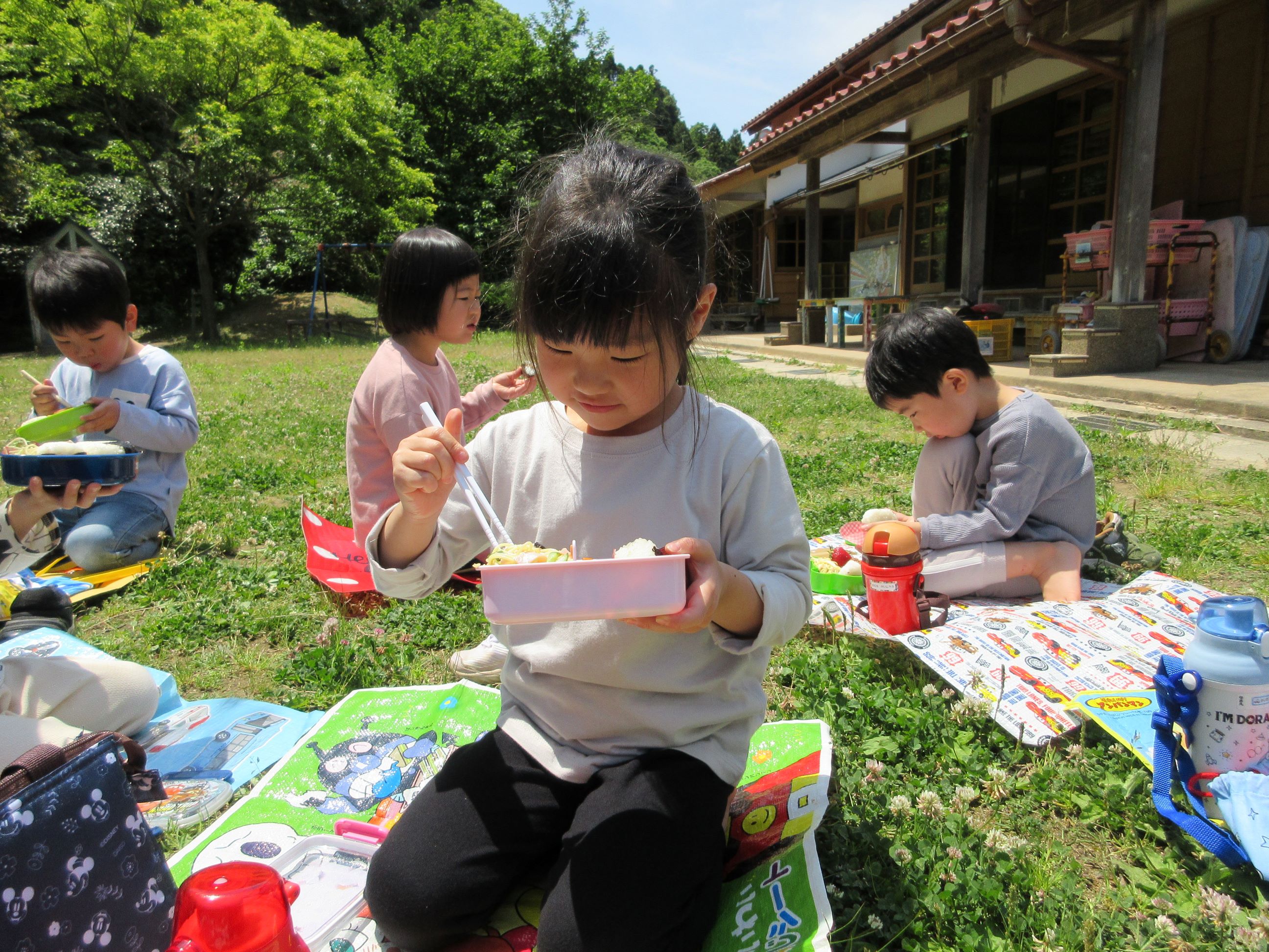 お皿に盛られたお弁当用の給食を見て、「わぁ~、おいしそう」「どれからいれようかなぁ~」と言いながら、嬉しそうに詰めていました。そして、お弁当が完成すると、にじ・そら組は所庭で、ゆめ・ほし組はランチルームのテラスで、お弁当を食べました。自分で詰めたお弁当を「おいしい」「つぎはこれたべよー」などと、つぶやきながら、嬉しそうに食べる子ども達でした。