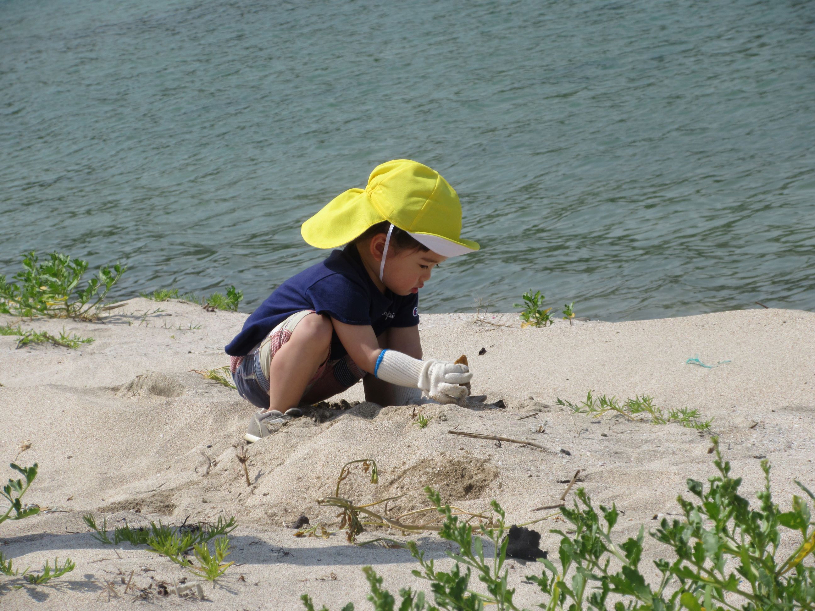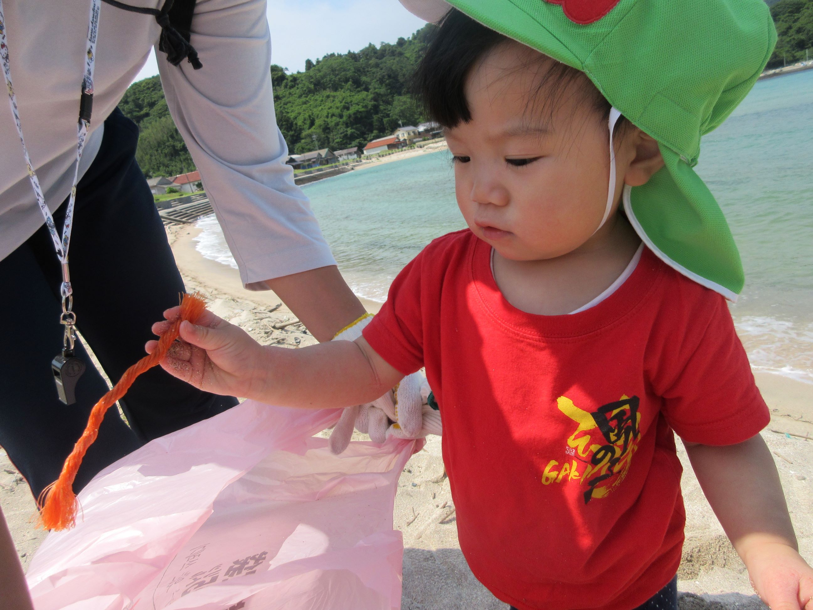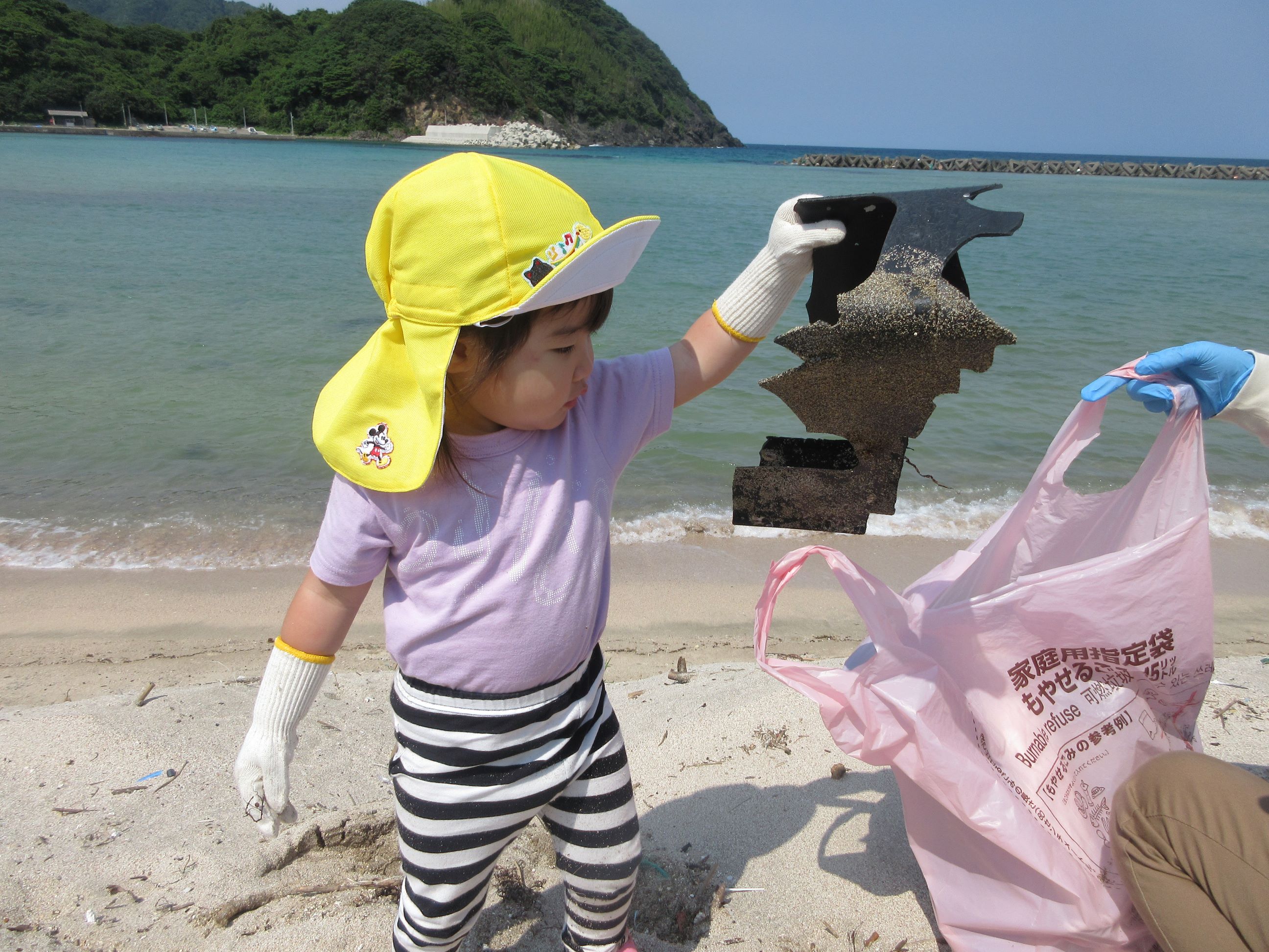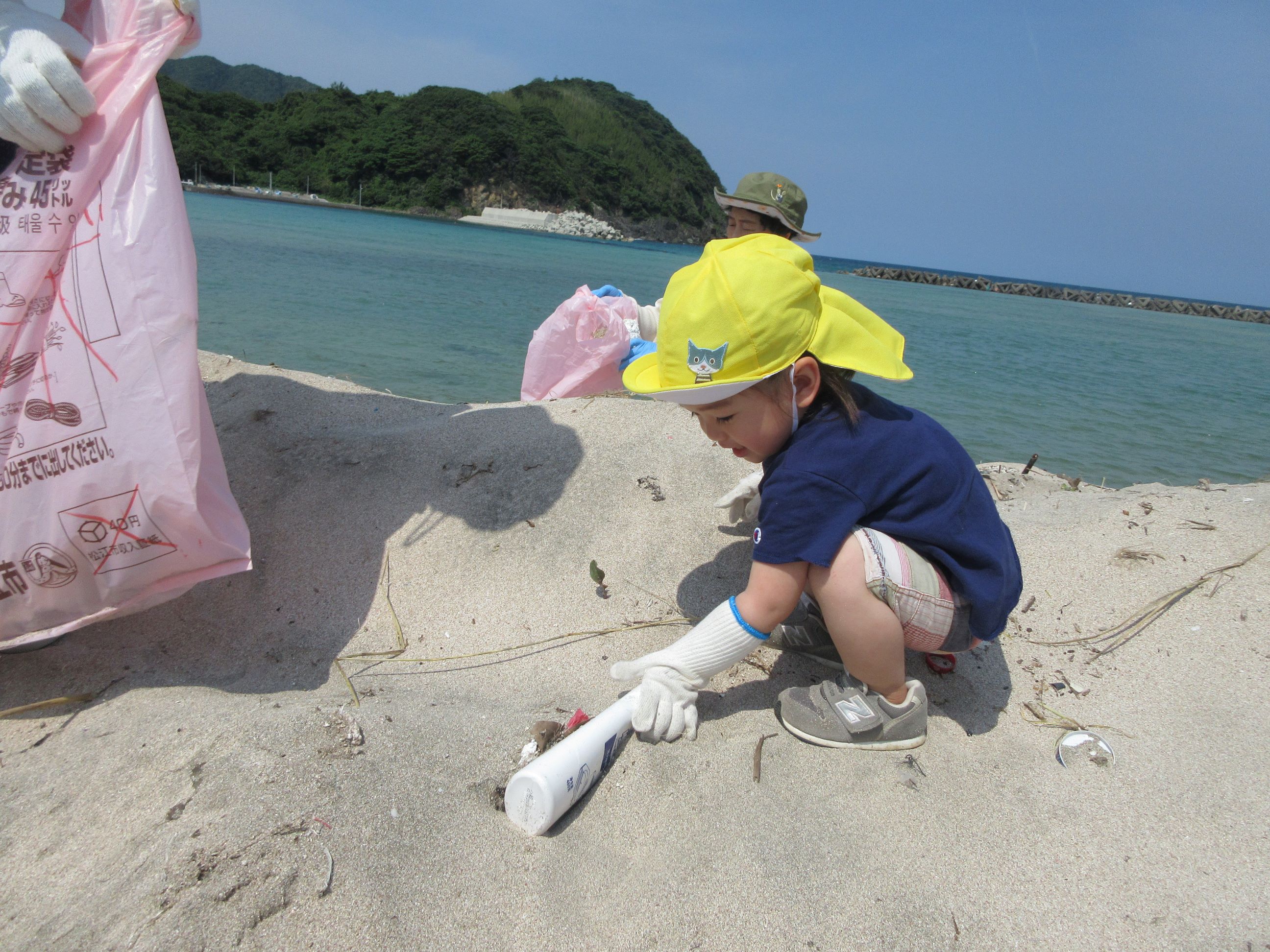 海に行くまでの道端に落ちていたごみを見つけ「ごみがあったー」と早速拾ってくれました。